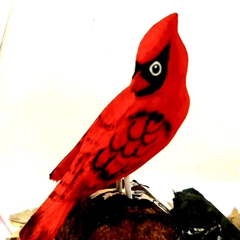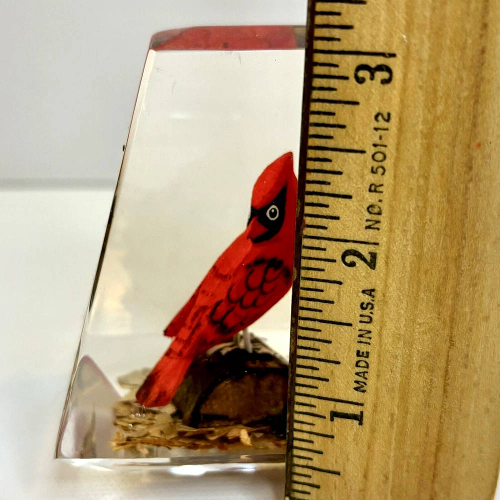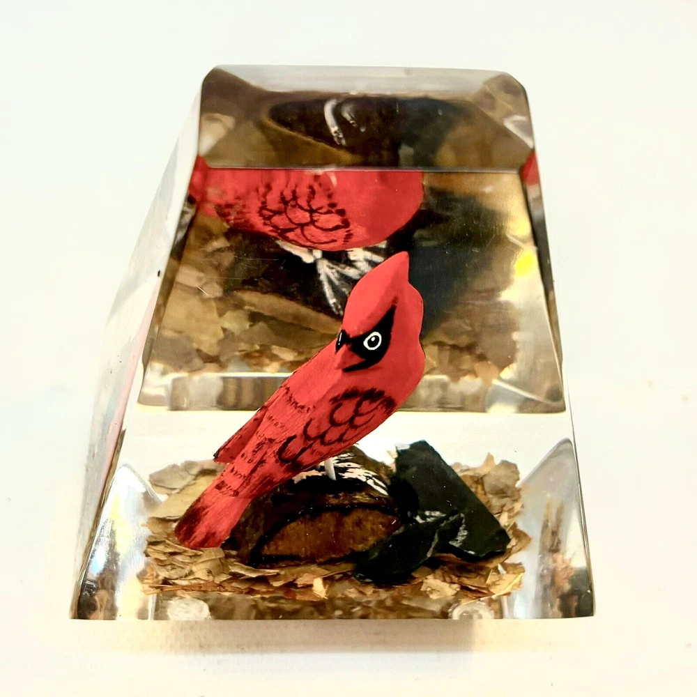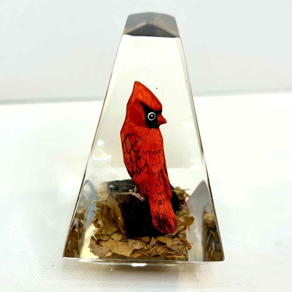 This vintage paperweight is a one-of-a-kind piece that features a hand-carved and painted cardinal. Made in Canada, this unique collectible is perfect for those who appreciate the artistry of handmade items. The paperweight is made of a combination of wood and lucite, making it a durable and unique addition to any collection. Whether you're a fan of vintage collectibles or are simply looking for a standout piece to display in your home, this cardinal paperweight is sure to impress. • Size: 3”h x 2-1/2”w x 2”l * Condition: Great pre-owned, vintage condition, with little wear.