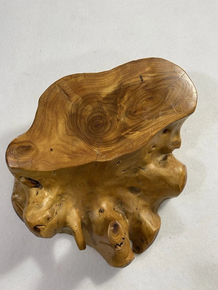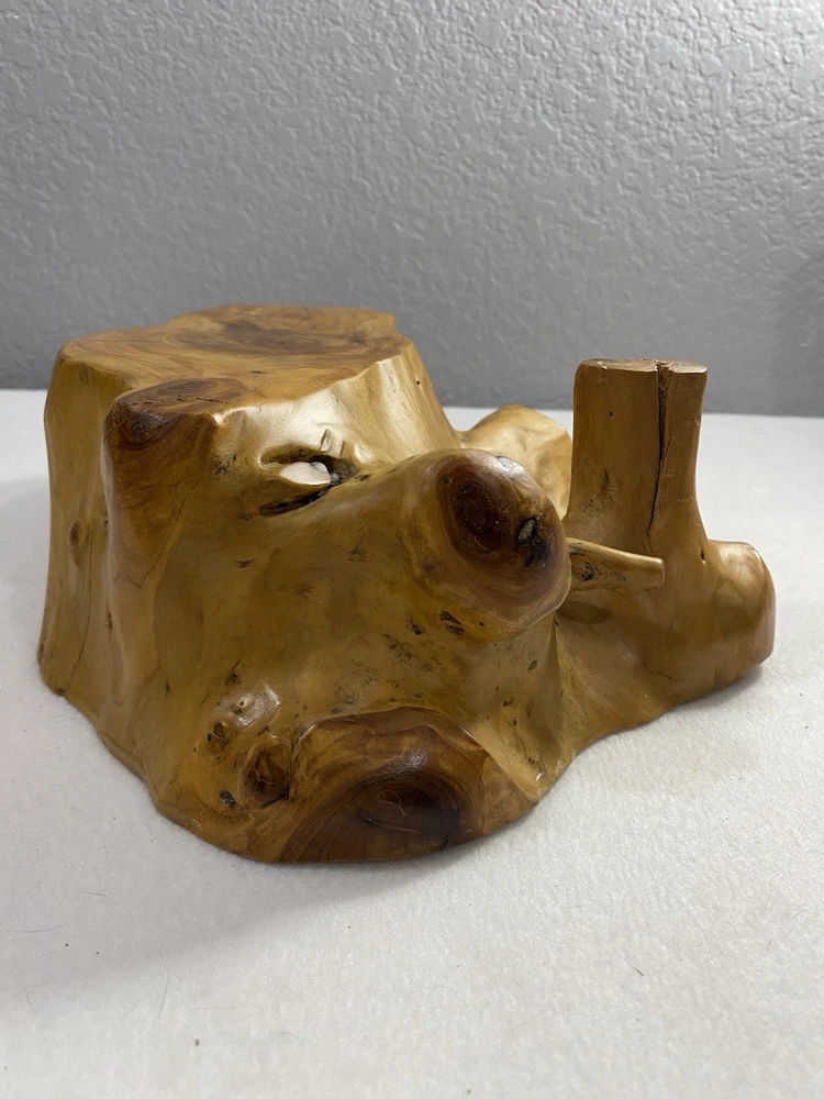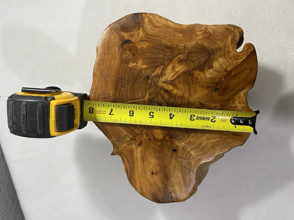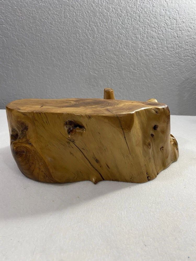 The vintage hand-carved knotted burl/cedar wood root art base/stand is a unique and artistic pedestal stand that adds a touch of nature to any home decor. Made from burl wood with a knotted design, this base/stand has a height of 31/4 inches and a width of 8 inches, making it versatile for displaying various items in your living space. The aroma of cedar adds an extra sensory element to this piece, creating a relaxing and inviting atmosphere in your home. Smells so good. !!
