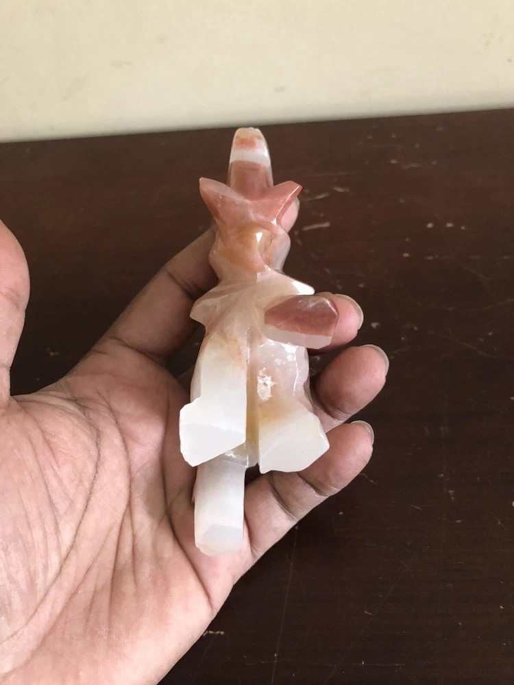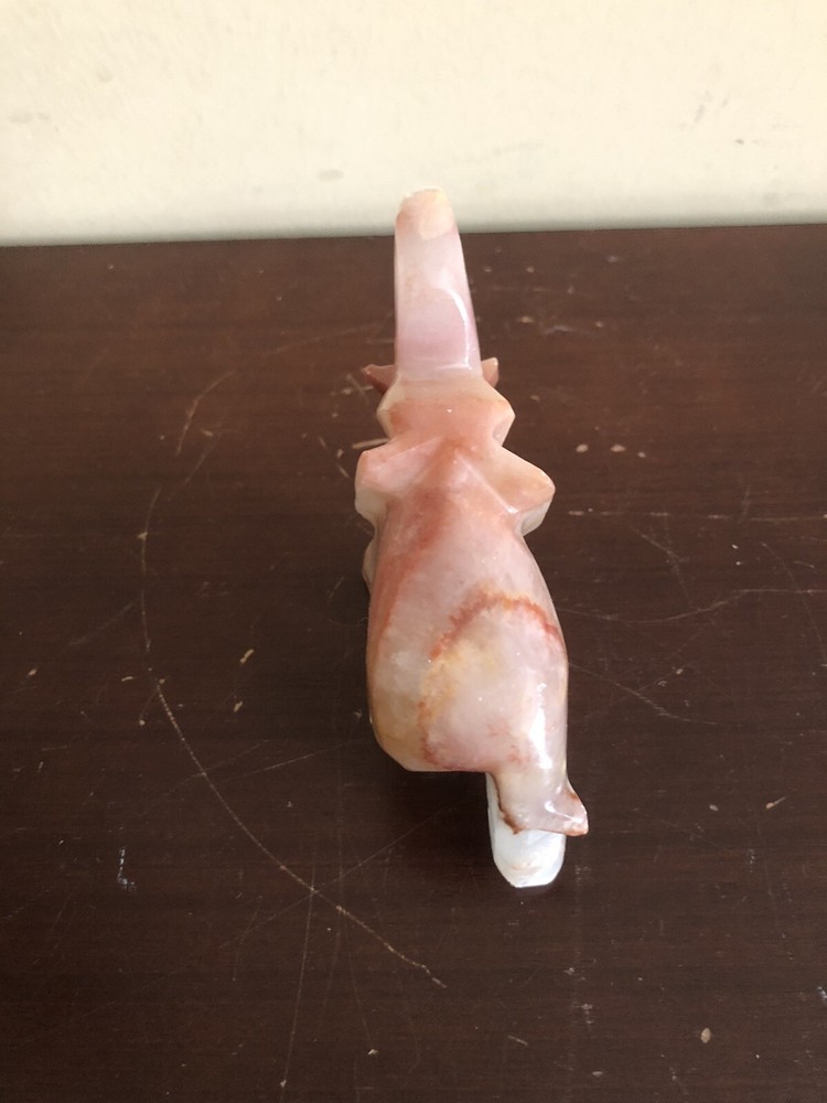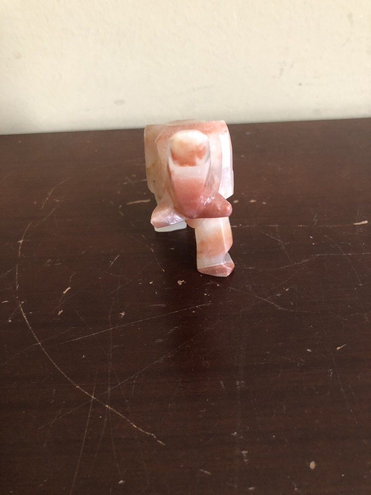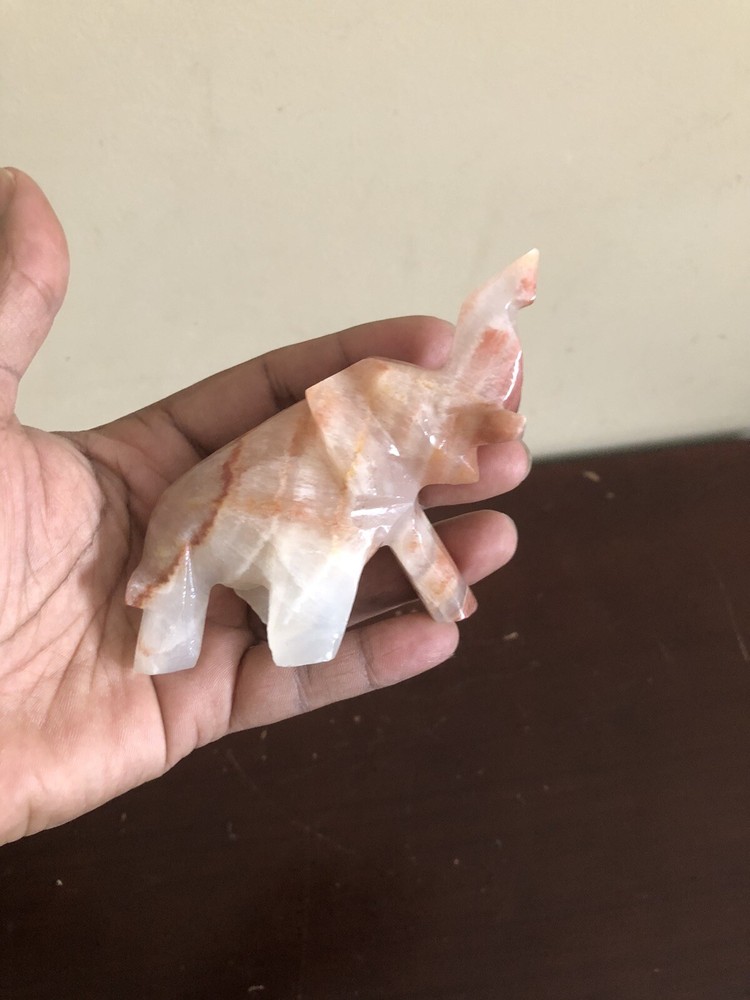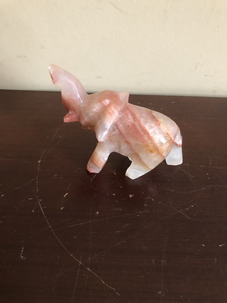 The vintage small hand-carved marbled onyx stone elephant is a collectible figurine featuring intricate detailing. Made from stone, this unique piece showcases skilled craftsmanship with a handmade touch. The elephant figurine is a charming addition to any decor, perfect for animal lovers and collectors alike.