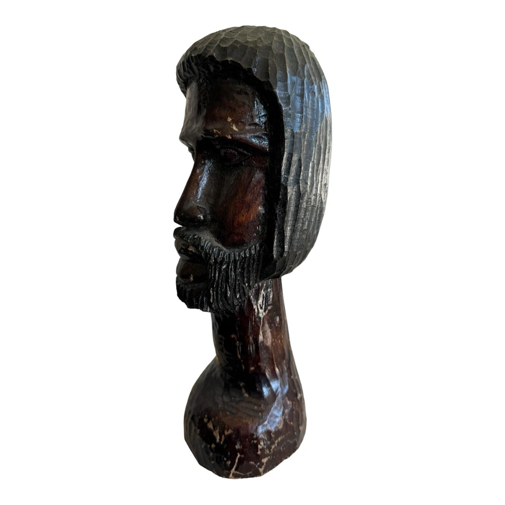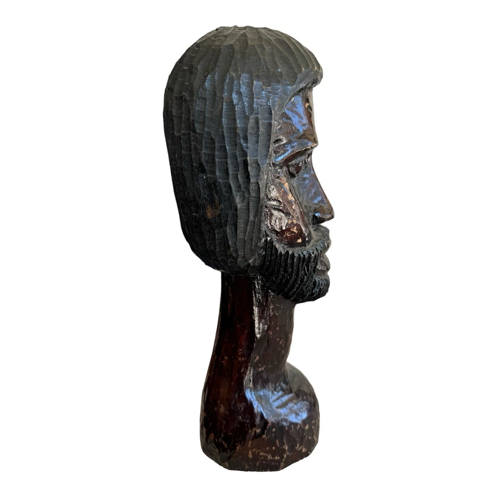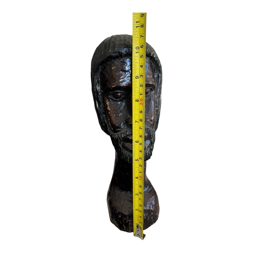 This vintage hand-carved wooden bust depicts a bearded man with intricate details, showcasing traditional African artistry. This unique piece of art adds a touch of cultural elegance to any collection or decor setting. • Vintage hand-carved wooden bust • Depicts a bearded man with detailed features • Approximate height: 10 inches • Crafted from solid wood with a dark, rich finish • Unique piece of African art, ideal for collectors and decor enthusiasts Style and History: This sculpture is a fine example of traditional African woodcarving, where artisans use hand tools to create expressive and culturally significant pieces. The dark finish and detailed craftsmanship highlight the skill and heritage of the carver, making it a valuable addition to any collection.