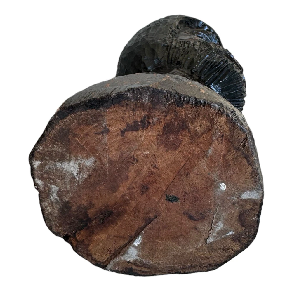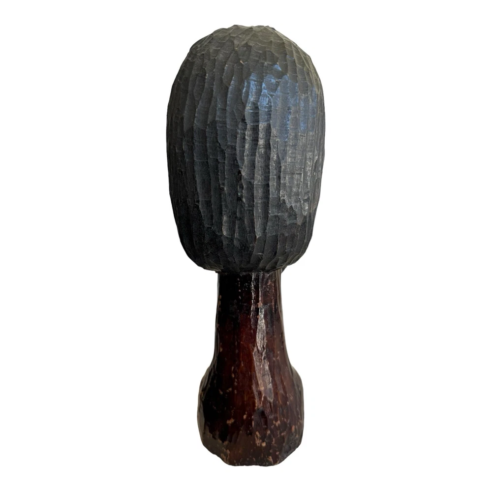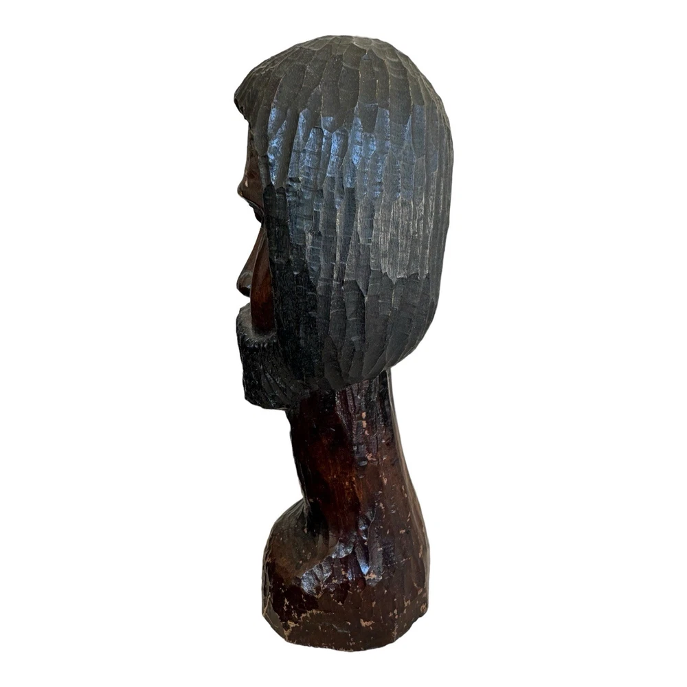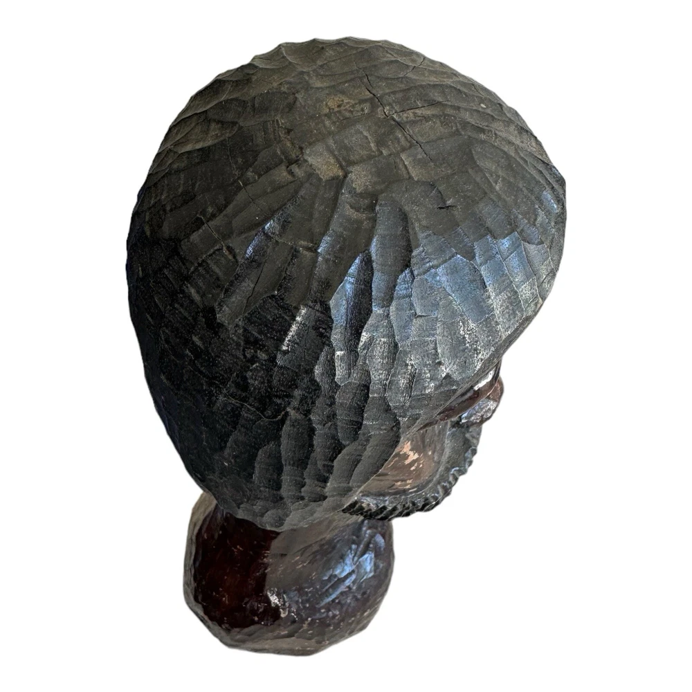 This vintage hand-carved wooden bust depicts a bearded man with intricate details, showcasing traditional African artistry. This unique piece of art adds a touch of cultural elegance to any collection or decor setting. • Vintage hand-carved wooden bust • Depicts a bearded man with detailed features • Approximate height: 10 inches • Crafted from solid wood with a dark, rich finish • Unique piece of African art, ideal for collectors and decor enthusiasts Style and History: This sculpture is a fine example of traditional African woodcarving, where artisans use hand tools to create expressive and culturally significant pieces. The dark finish and detailed craftsmanship highlight the skill and heritage of the carver, making it a valuable addition to any collection.