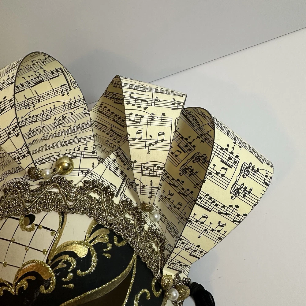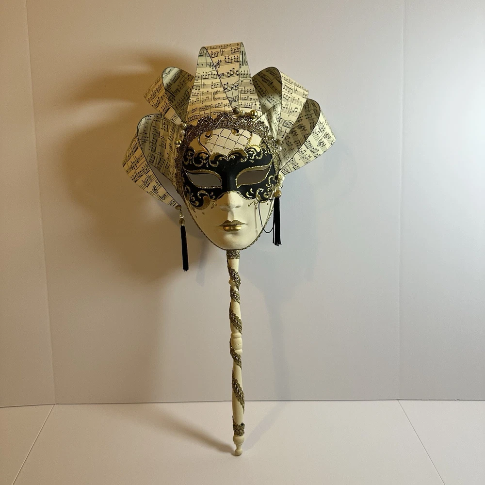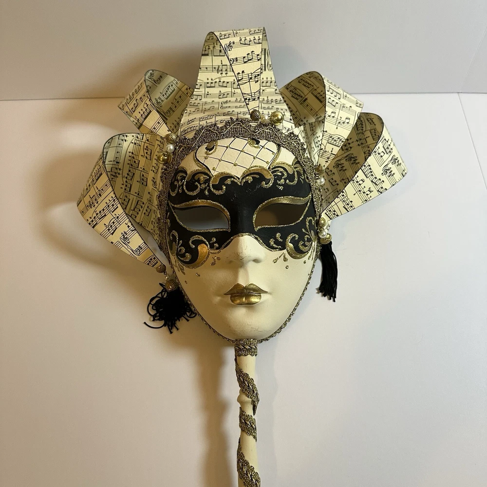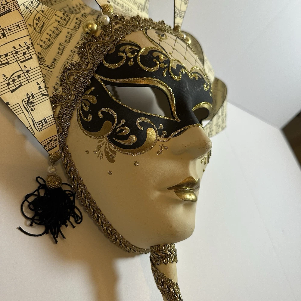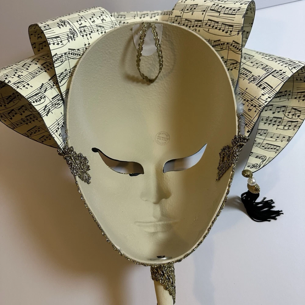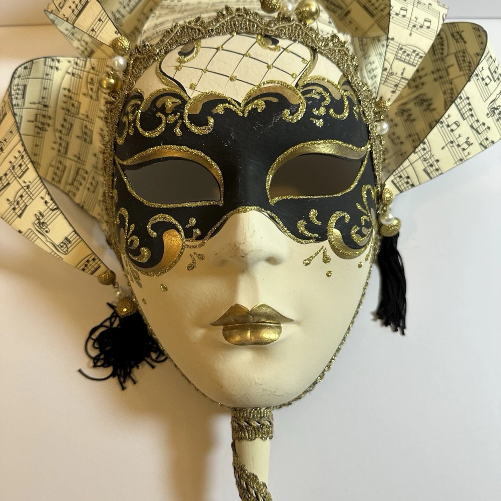 Vintage Hand-Crafted Venetian Harlequin Mask, Music Sheet Accents, Hand-Painted