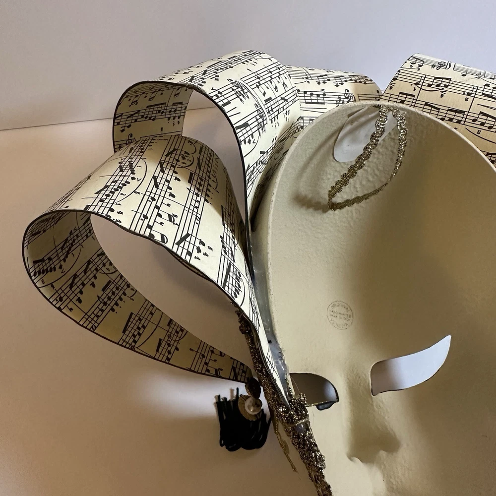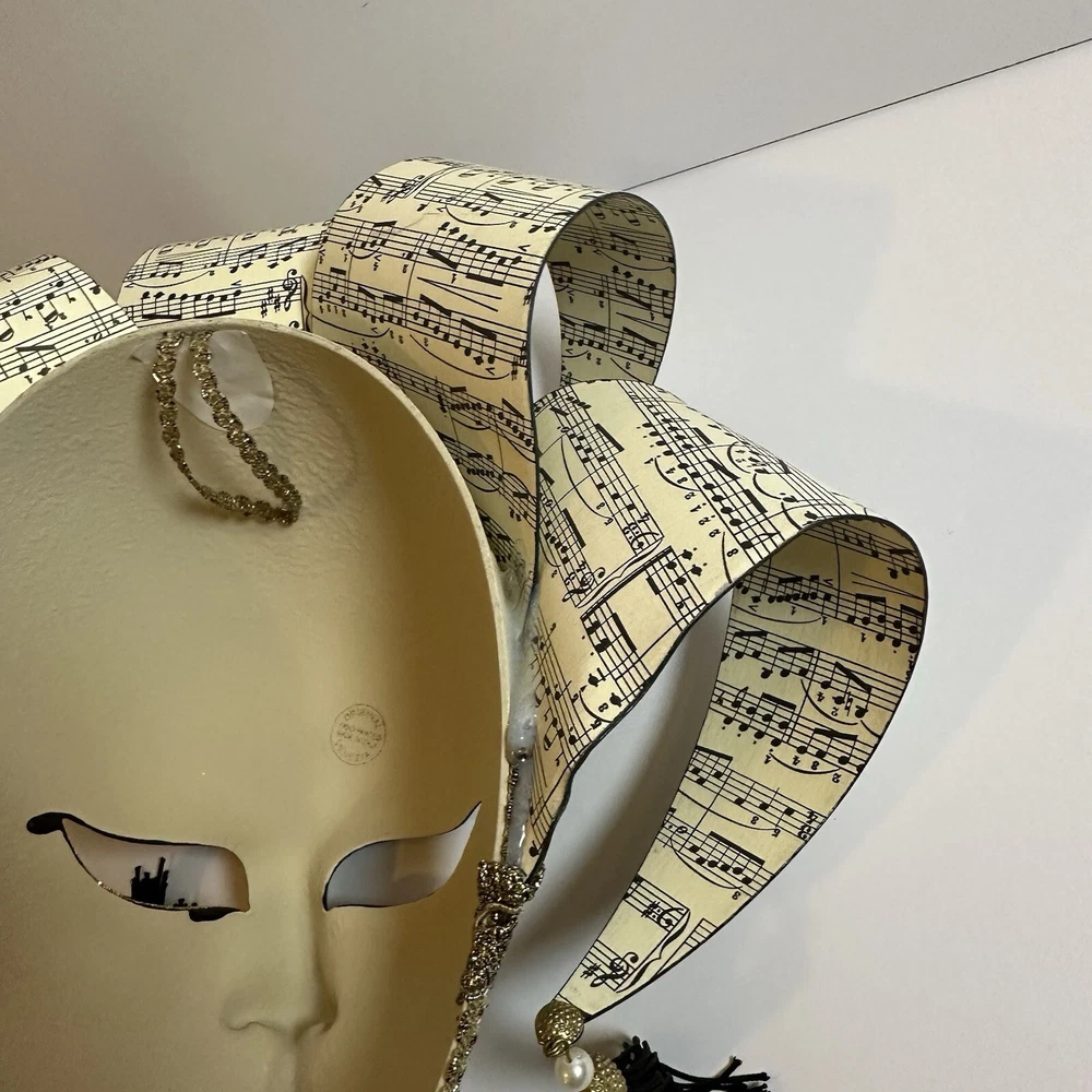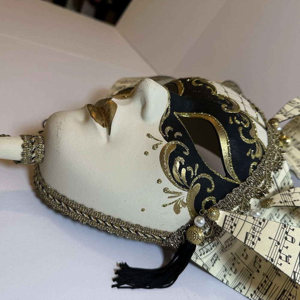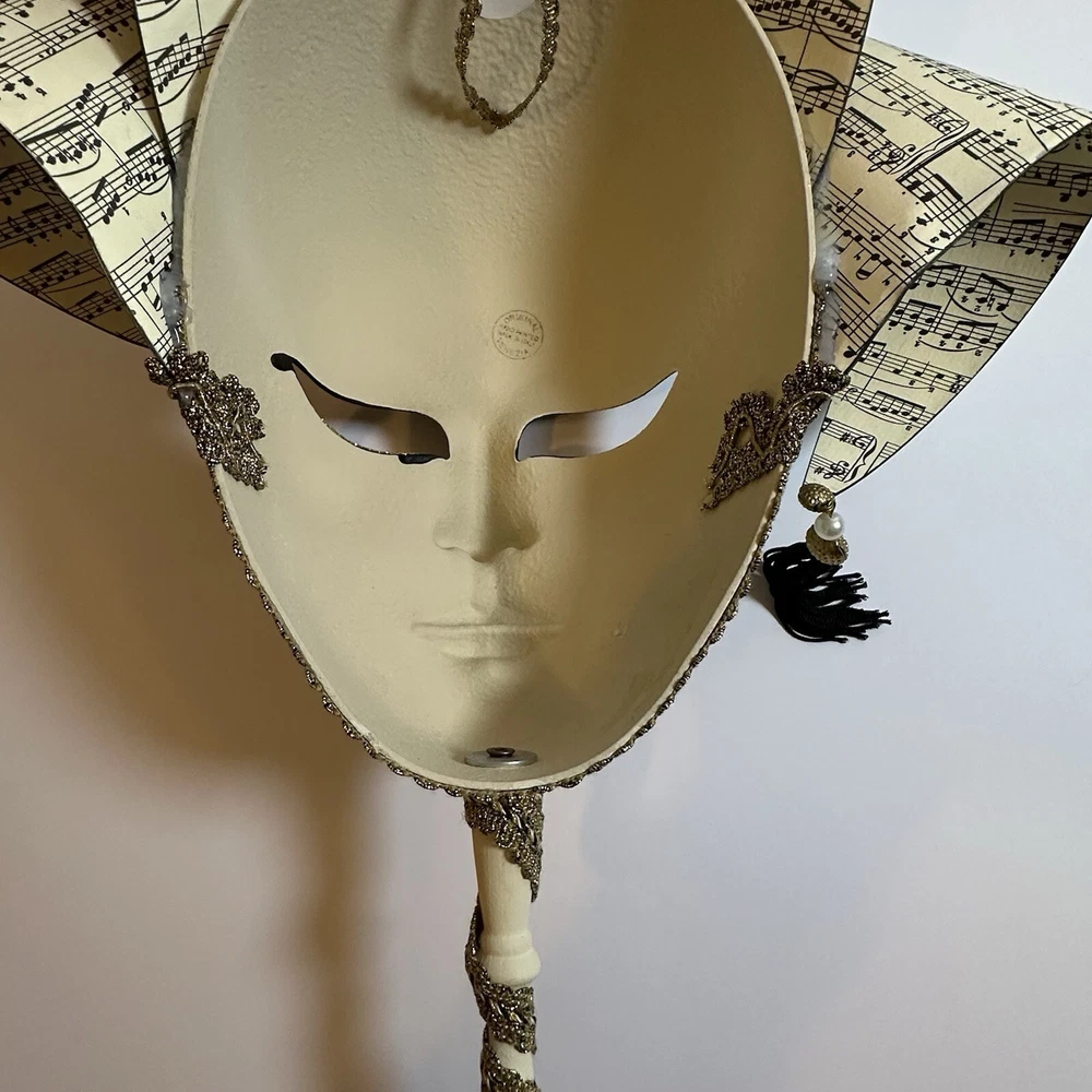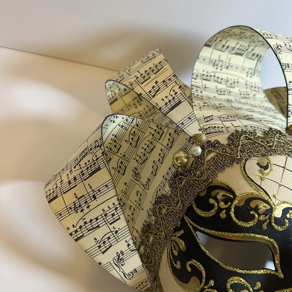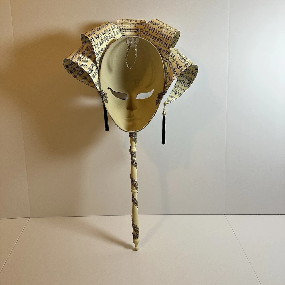 Vintage Hand-Crafted Venetian Harlequin Mask, Music Sheet Accents, Hand-Painted