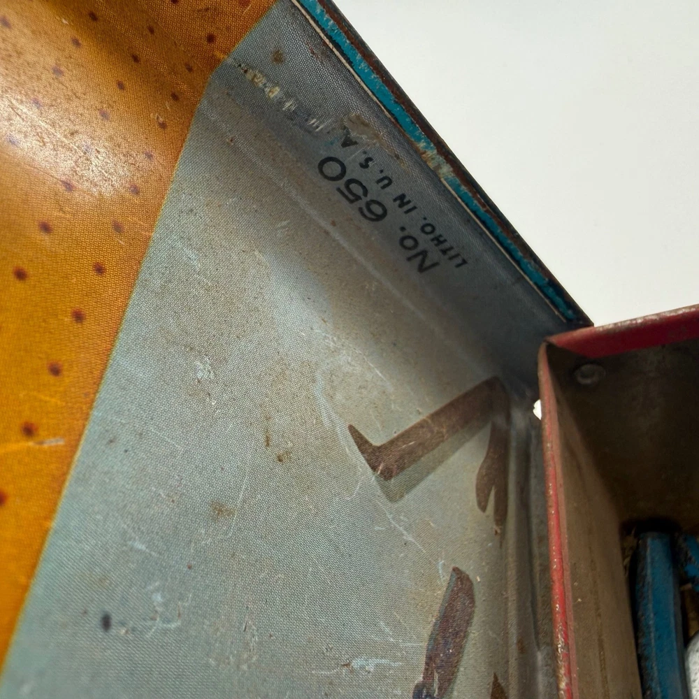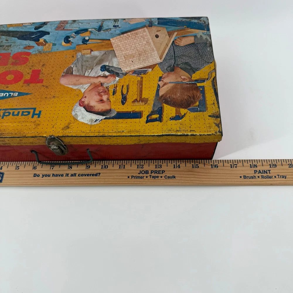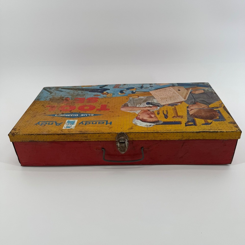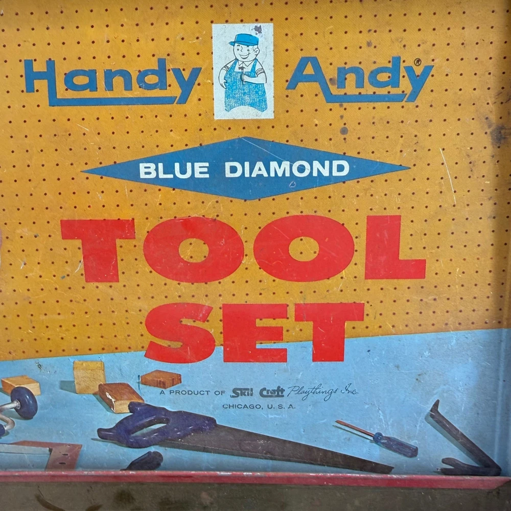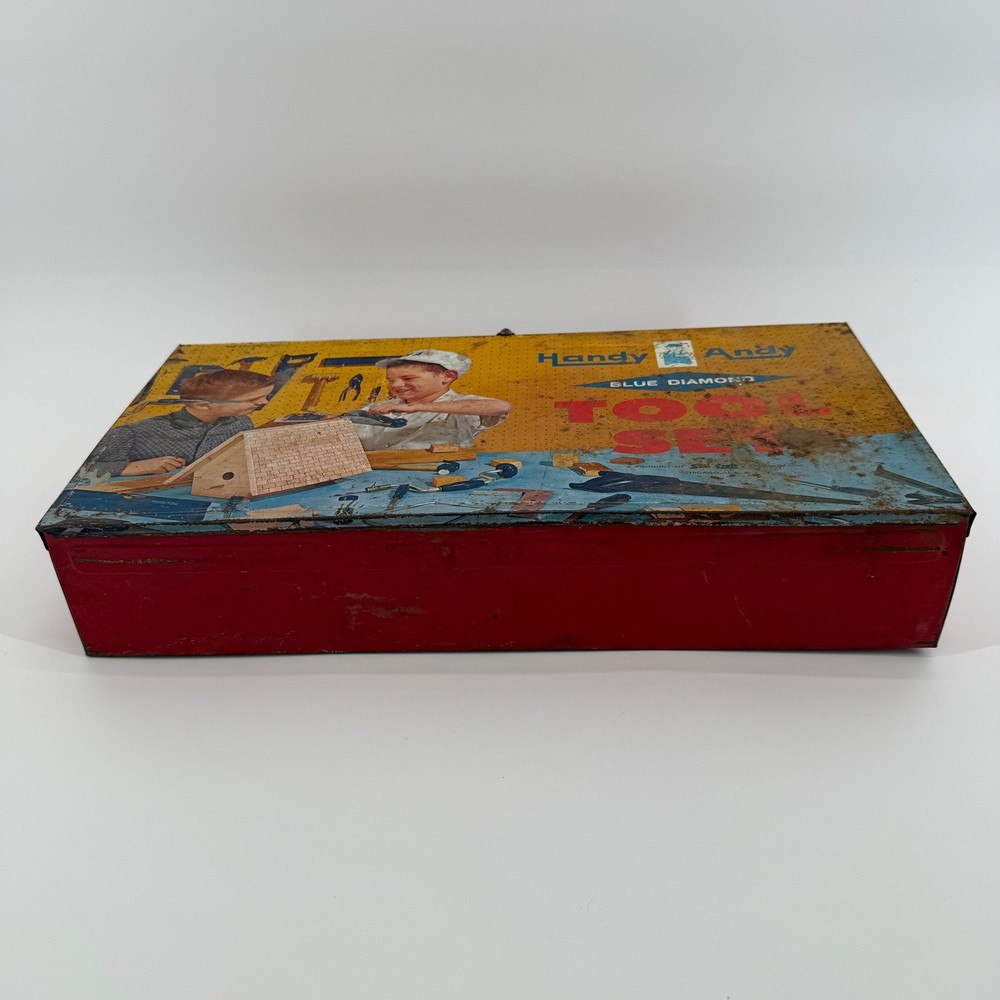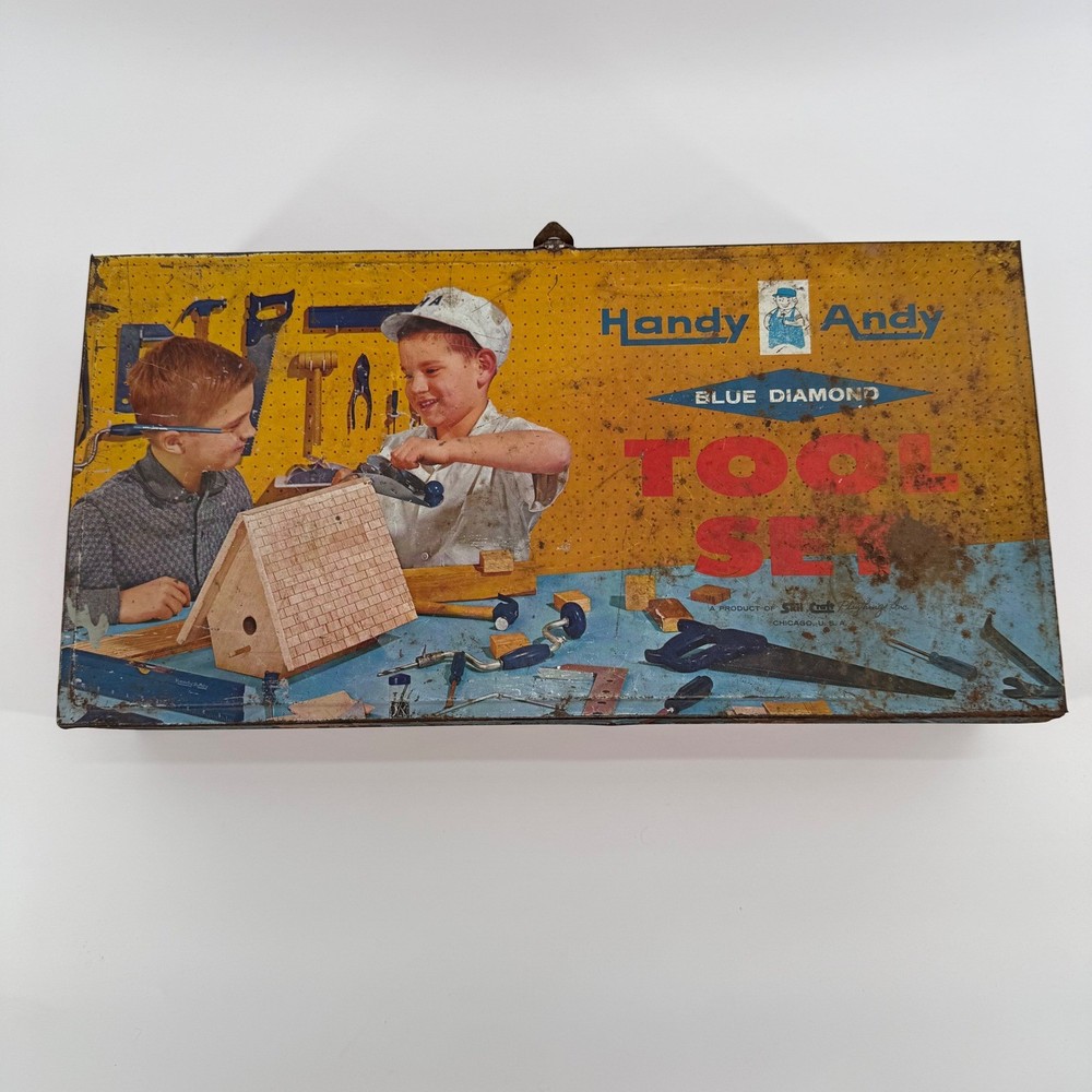 Real tools included as pictured. Neat little piece. Vintage Handy Andy Blue Diamond tin litho tool set for children. This classic toy features a vibrant tin case with colorful illustrations of boys working on a birdhouse and other projects. The set includes a hammer, a block plane, a saw, pliers, and a small mallet. This collectible toy offers a nostalgic glimpse into childhood play. Measurements: • Length: 16 in • Width: 8.5 in • Height: 3.5 in Character Family: Handy Manny Age Level: 4-7 Keywords: tin toy, metal lunchbox, retro toy, childrens tools, play set, collectible toy, vintage advertising, toy toolbox, construction toy, nostalgia, educational toy