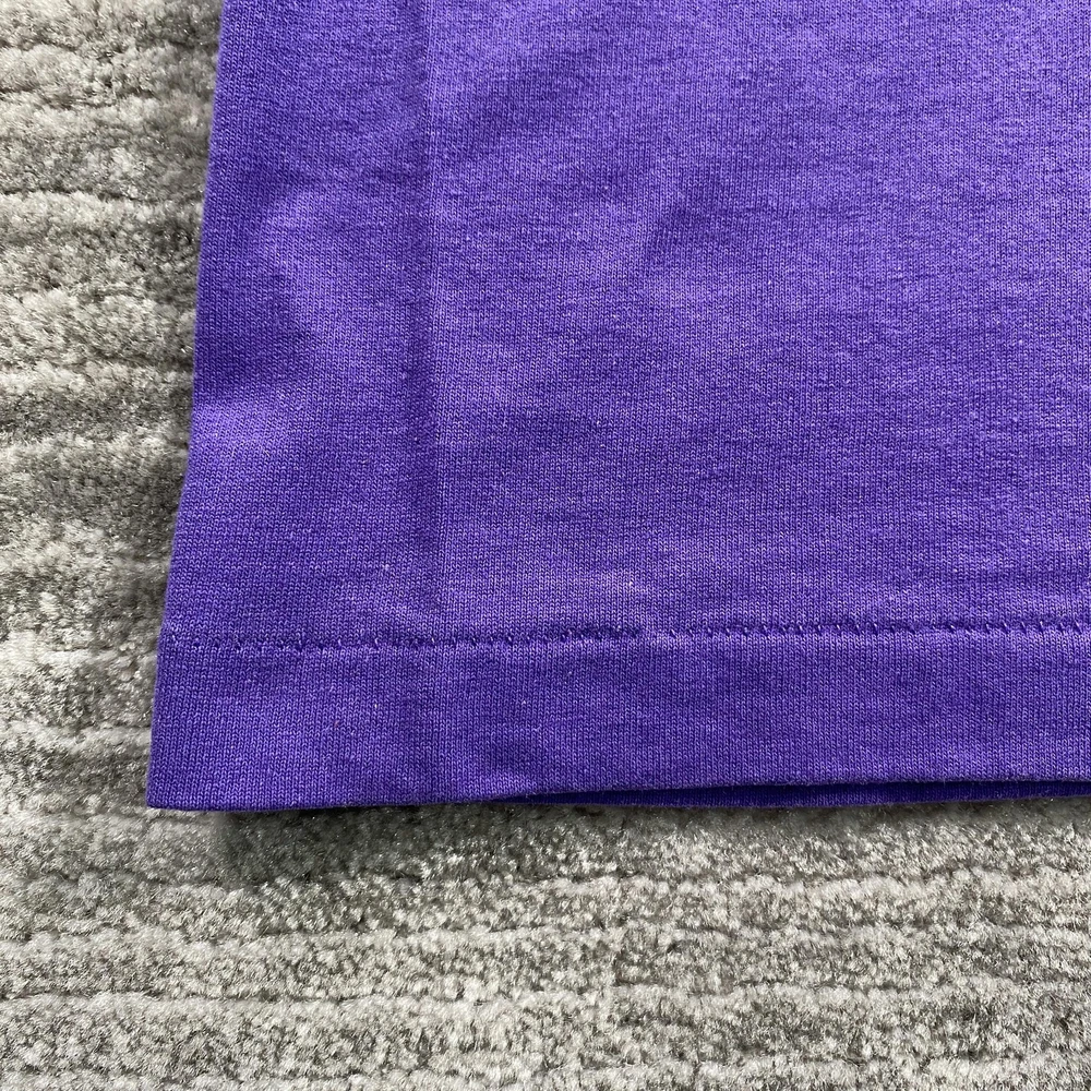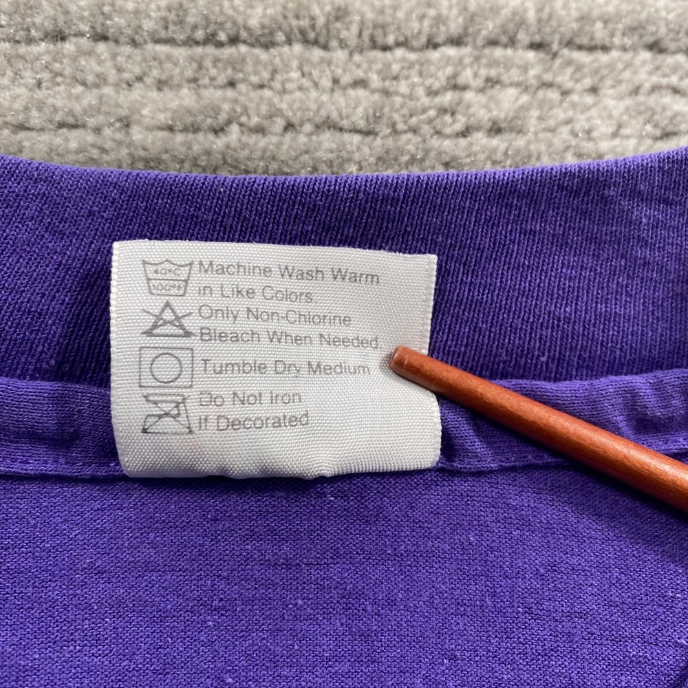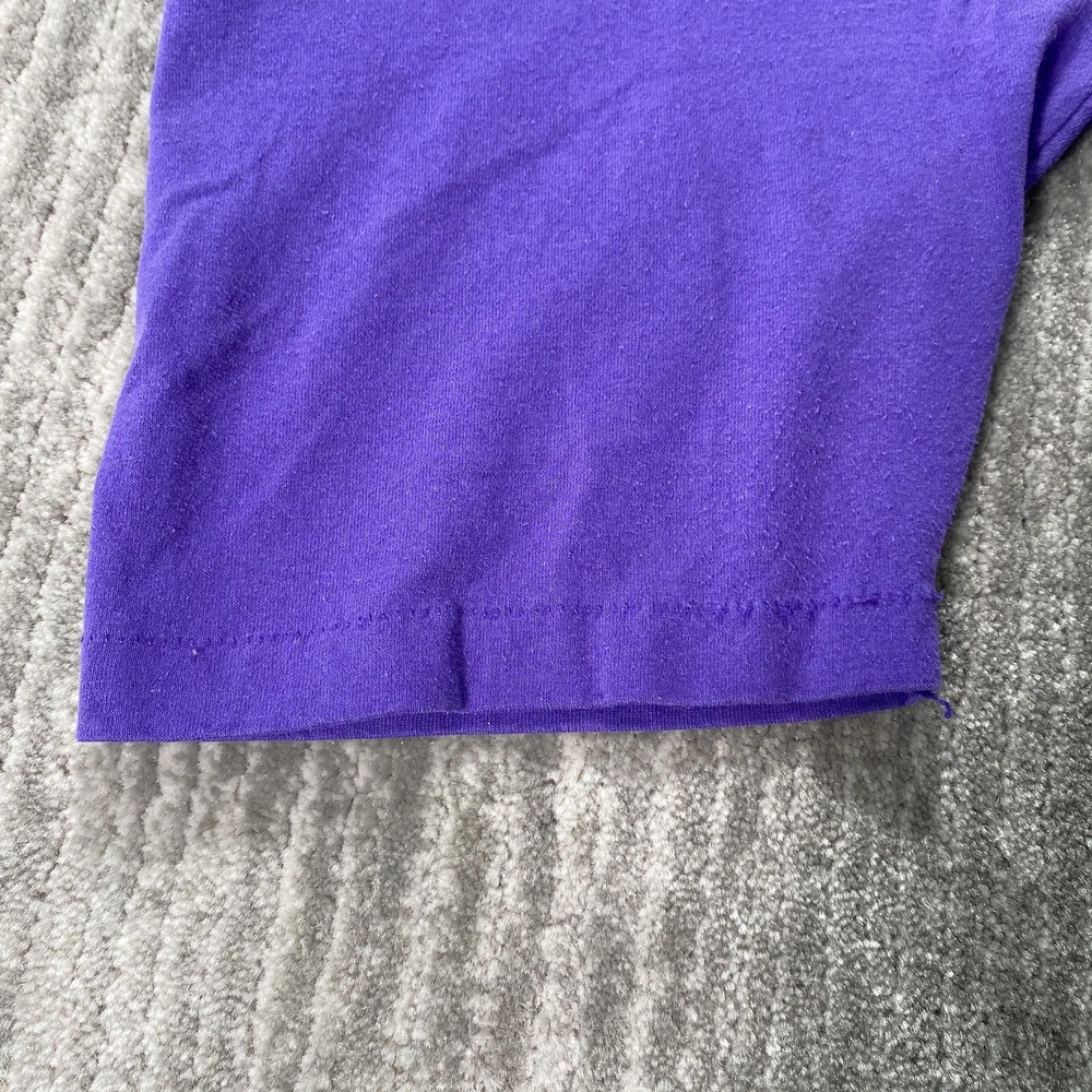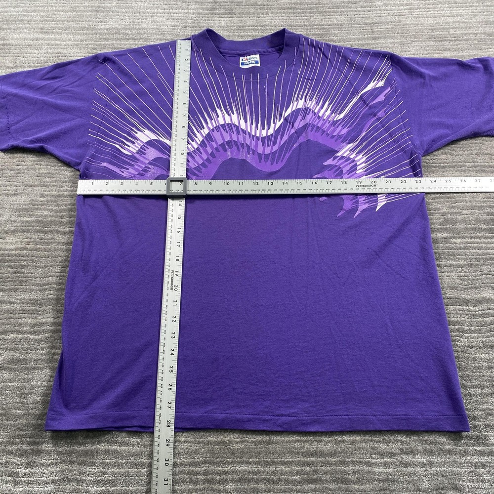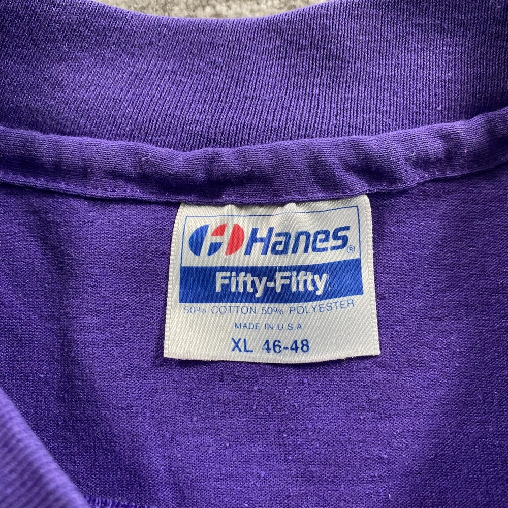 Brand: Hanes Style: Vintage short sleeve crewneck graphic shirt with an abstract wave and radiating line design across the chest. Color: Purple base with lighter purple and white graphic print. Material: 50% cotton, 50% polyester (Fifty-Fifty blend). Country of manufacture: Made in U.S.A. Size on tag: Mens XL 46-48. Construction details: Single-stitched sleeves and hem, ribbed crew neck, soft lightweight 50/50 fabric. Care tag instructions: Machine wash warm with like colors, only non-chlorine bleach when needed, tumble dry medium, do not iron if decorated. Ideal for collectors of vintage Made in USA Hanes Fifty-Fifty tees and retro 80s style graphics.