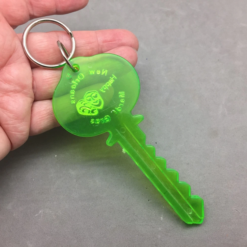 Vintage Happy Mardi Gras Keychain Green Key Plastic Glows in UV Parade Throw This is a vintage Mardi Gras New Orleans parade float "throw" keychain in functional condition that is key shaped and is green plastic that glows in UV light. The fob measures 4 3/4" and reads, " New Orleans Happy Mardi Gras". This is a vintage pre-owned item that was from estate of Mardi Gras collector (circa 1960-1990). My photos are of the actual items you are getting. See my store for other interesting Mardi Gras collectible items. PAYMENT DETAILS: Buyer must furnish seller with "ship to " address that matches the address registered on ebay. Payment is expected within 3 days after close of auction. Thank you for looking.