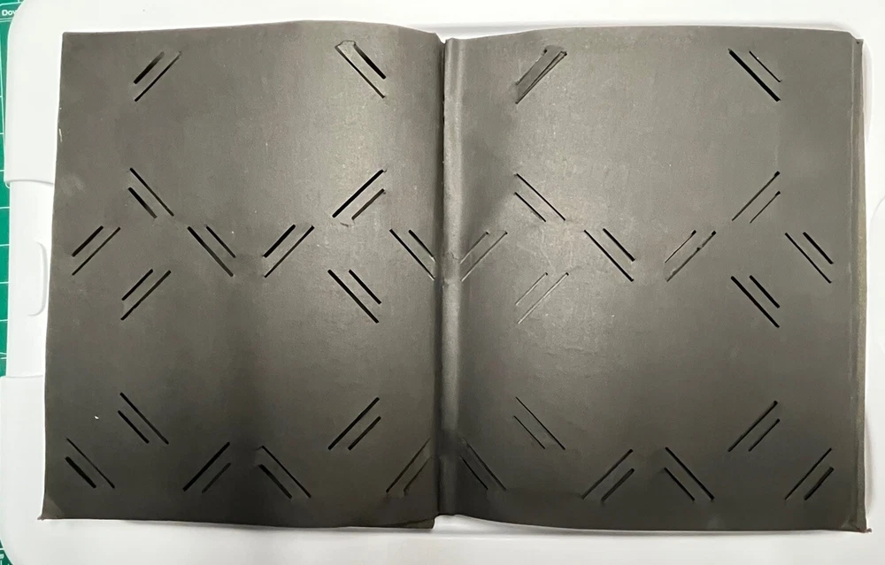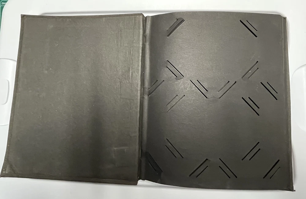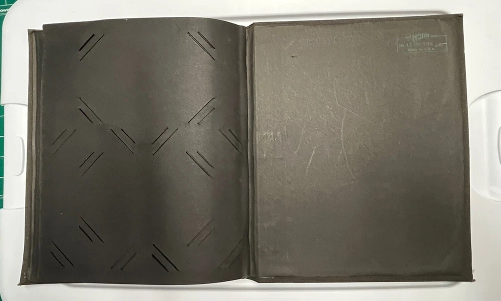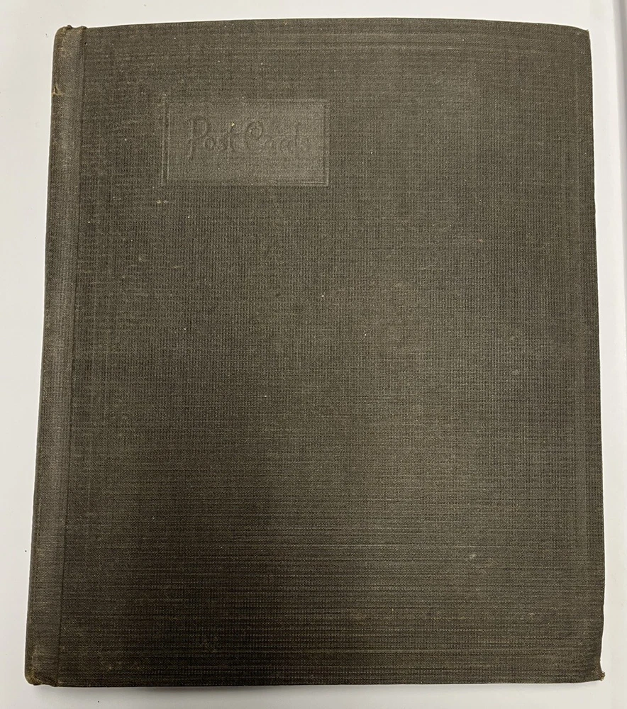 This nice postcard album has been used but is still in good useable condition. Some tears but the book will still hold 72 to 108 postcards. The center page is loose from the staples. See photos.