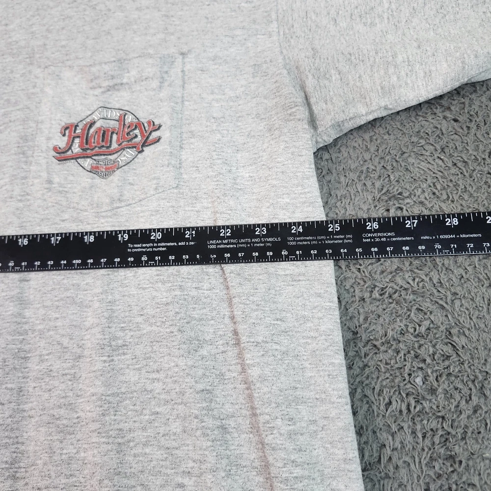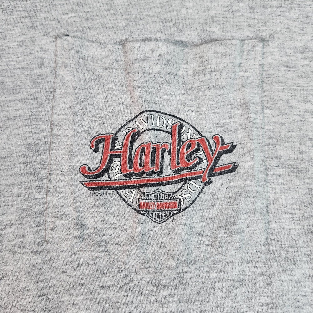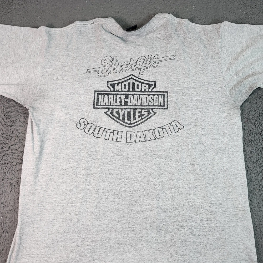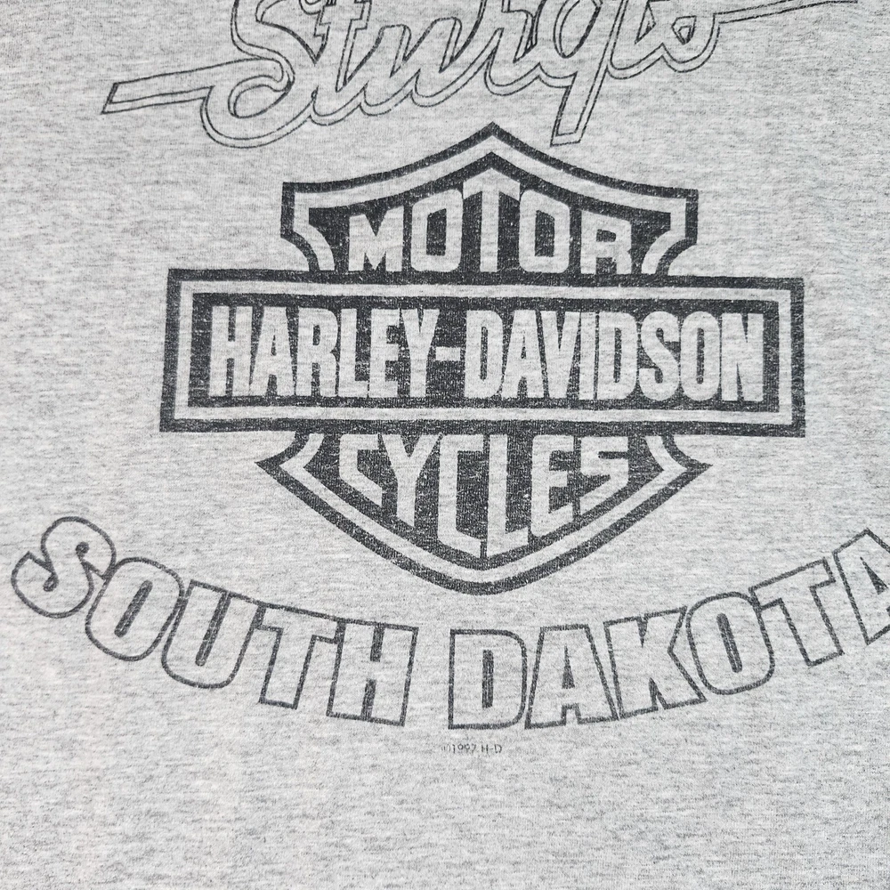 Brand: Harley-Davidson. Line/Model: Sturgis South Dakota dealership graphic T-shirt, ©1992 H-D. Style: Mens short sleeve crewneck pocket shirt with double-sided motorcycle graphics. Color: Heather gray body with black and red printed logos. Size: Mens 2XL (tag size XXL). Material: 90% cotton, 10% polyester as shown on interior care label. Country of origin: Made in U.S.A. Design details: Left chest patch pocket with circular Harley script logo and small bar and shield emblem, large back graphic featuring Sturgis script over the classic Harley-Davidson Motor Cycles bar and shield with "South Dakota" text underneath. Branding and labels: Woven Harley-Davidson Motor Cycles neck tag, Holoubek licensing label, and white fabric care tag with RN 68379 and fiber content information. Features and use: Vintage 1990s Harley-Davidson Sturgis rally style T-shirt with front pocket, double-sided dealership graphics, and soft heather knit ideal for everyday casual wear, motorcycle rides, or Harley-Davidson collectors.