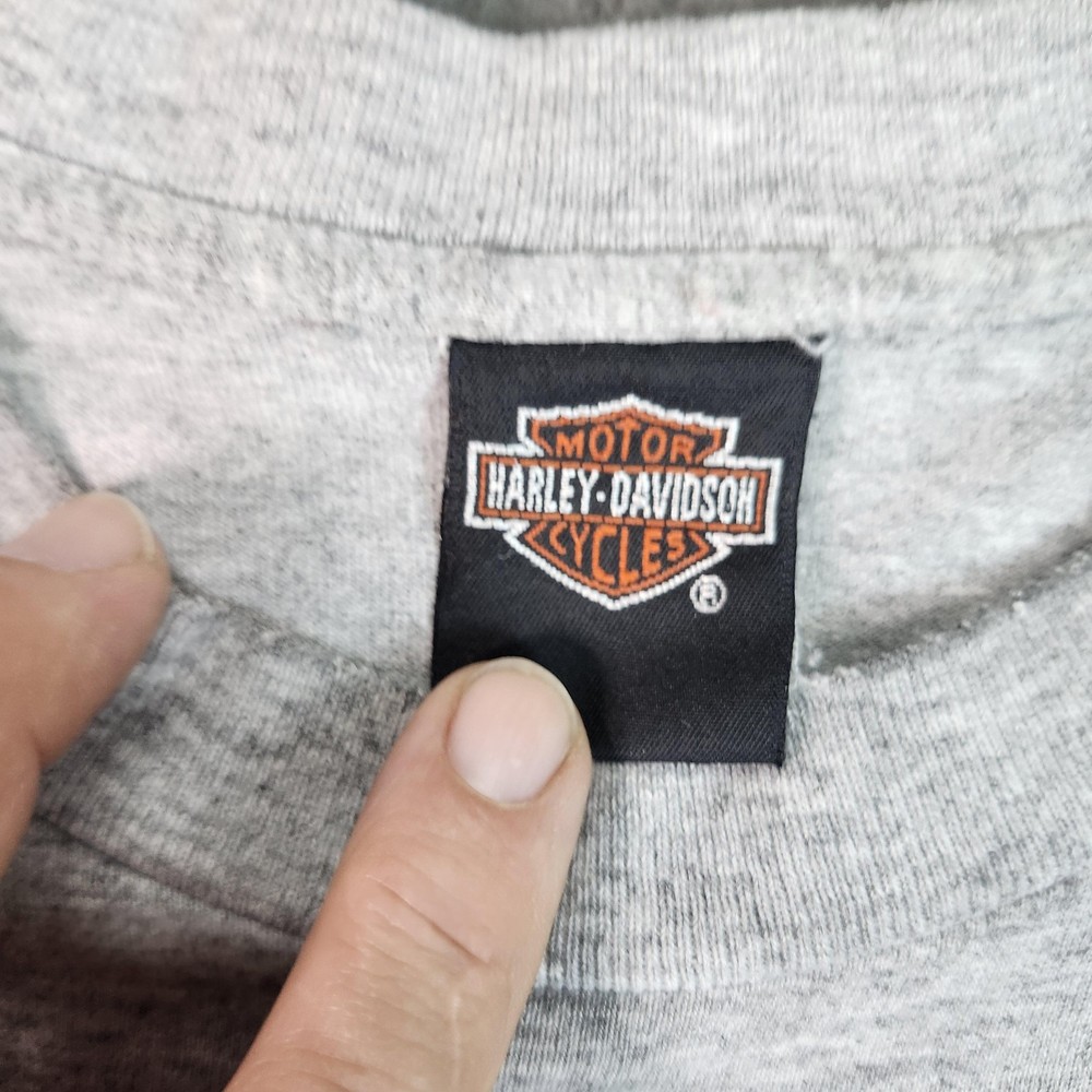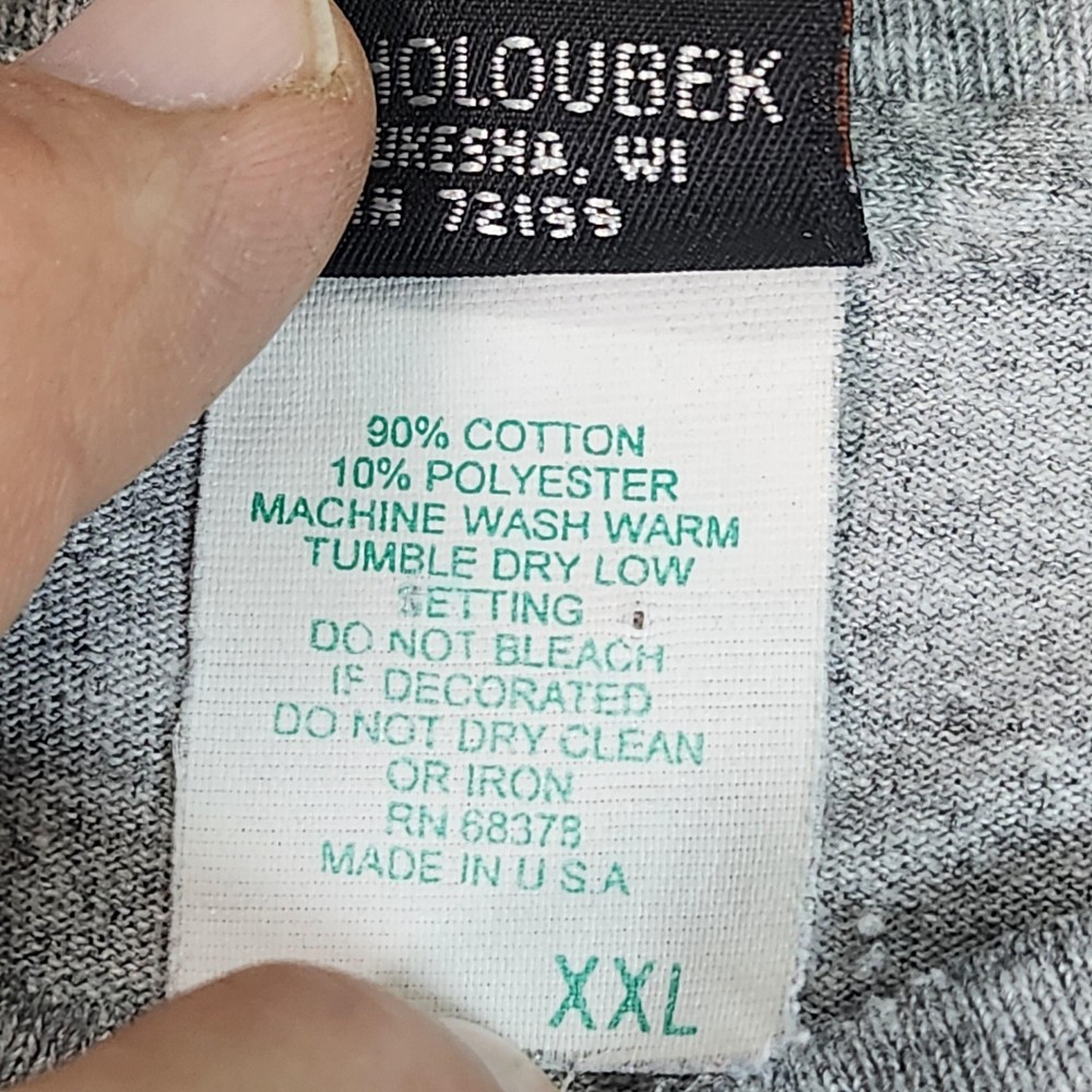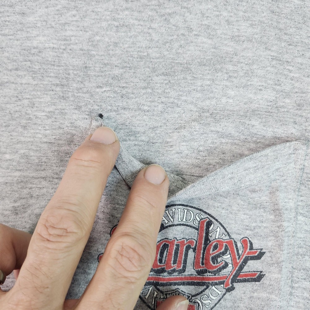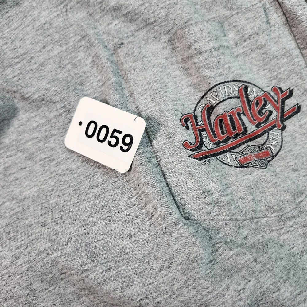 Brand: Harley-Davidson. Line/Model: Sturgis South Dakota dealership graphic T-shirt, ©1992 H-D. Style: Mens short sleeve crewneck pocket shirt with double-sided motorcycle graphics. Color: Heather gray body with black and red printed logos. Size: Mens 2XL (tag size XXL). Material: 90% cotton, 10% polyester as shown on interior care label. Country of origin: Made in U.S.A. Design details: Left chest patch pocket with circular Harley script logo and small bar and shield emblem, large back graphic featuring Sturgis script over the classic Harley-Davidson Motor Cycles bar and shield with "South Dakota" text underneath. Branding and labels: Woven Harley-Davidson Motor Cycles neck tag, Holoubek licensing label, and white fabric care tag with RN 68379 and fiber content information. Features and use: Vintage 1990s Harley-Davidson Sturgis rally style T-shirt with front pocket, double-sided dealership graphics, and soft heather knit ideal for everyday casual wear, motorcycle rides, or Harley-Davidson collectors.
