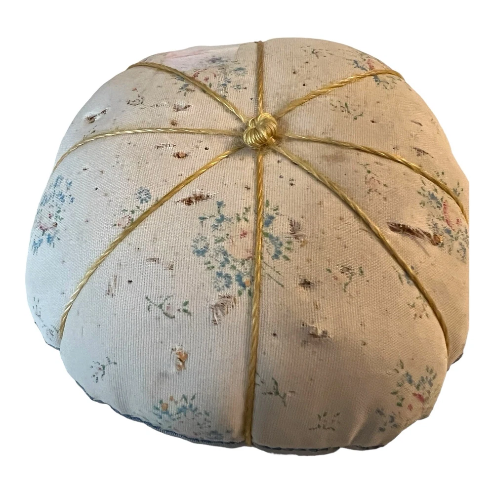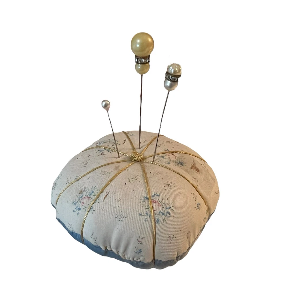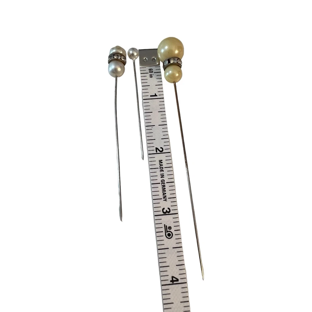 Lot of 3 vintage hat pins with pin cushion. Good preowned condition for pins, pin cushion has obvious wear with some holes - see photos for more details.