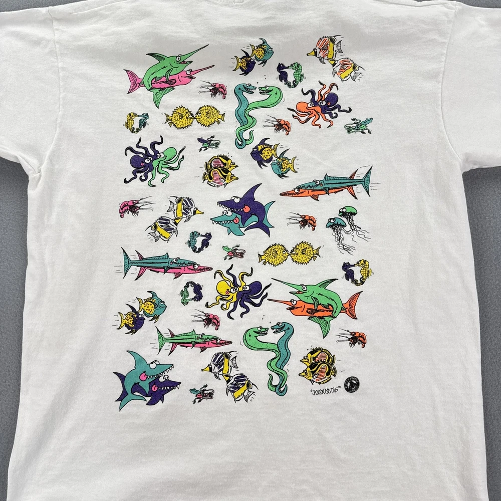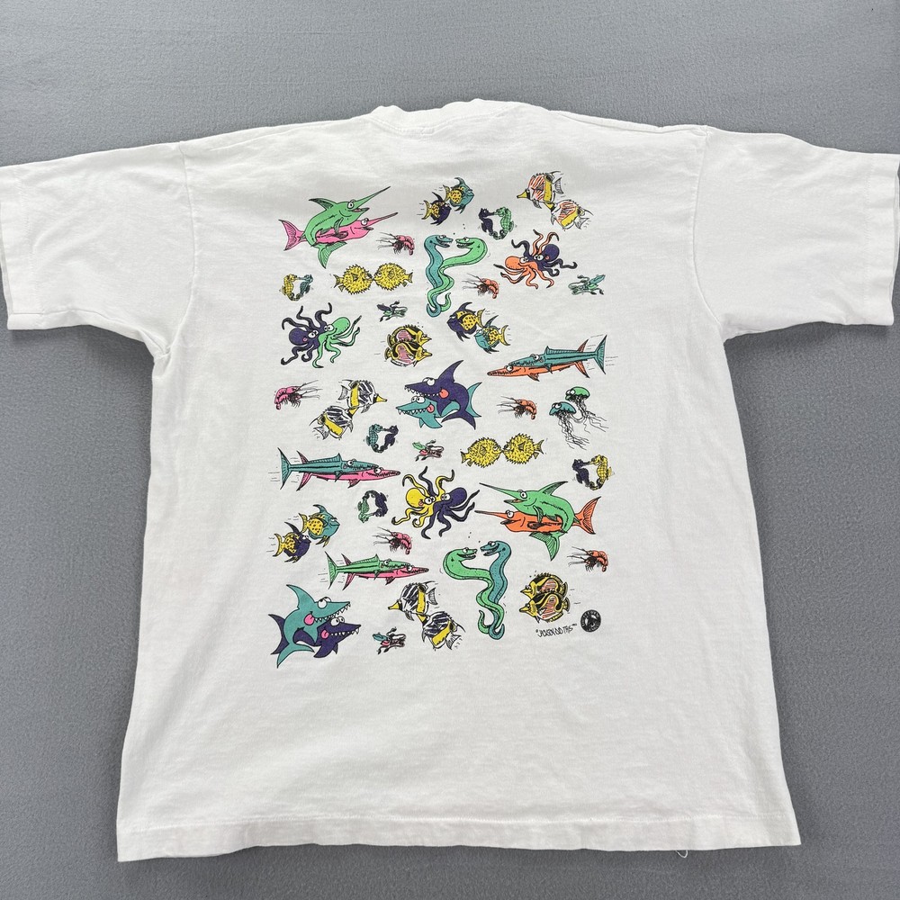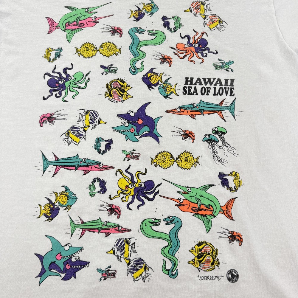 Vintage Hawaii Sea Of Love Shirt Mens XL White Cartoon Fish Ocean Graphic 90s Tee Condition: Good vintage condition. Light overall fading and typical signs of age and wash. No major stains or holes noted in photos. 100% cotton Fruit of the Loom T-shirt, made in USA. Tag size XL (Extra Large). Features large, colorful cartoon fish and sea creatures graphic on both front and back with bold "Hawaii Sea Of Love" text. Playful design signed "Yoison Did This '92" dated 1992. Double-sided all-over print makes it a standout 1990s tourist or souvenir tee. Classic single stitch construction on sleeves and hem—a hallmark of early 90s vintage shirts. Fruit of the Loom Best tag (XL) for accurate vintage sizing; please check measurements for best fit. Perfect for collectors, ocean lovers, or fans of unique and quirky graphic tees from the 90s era.