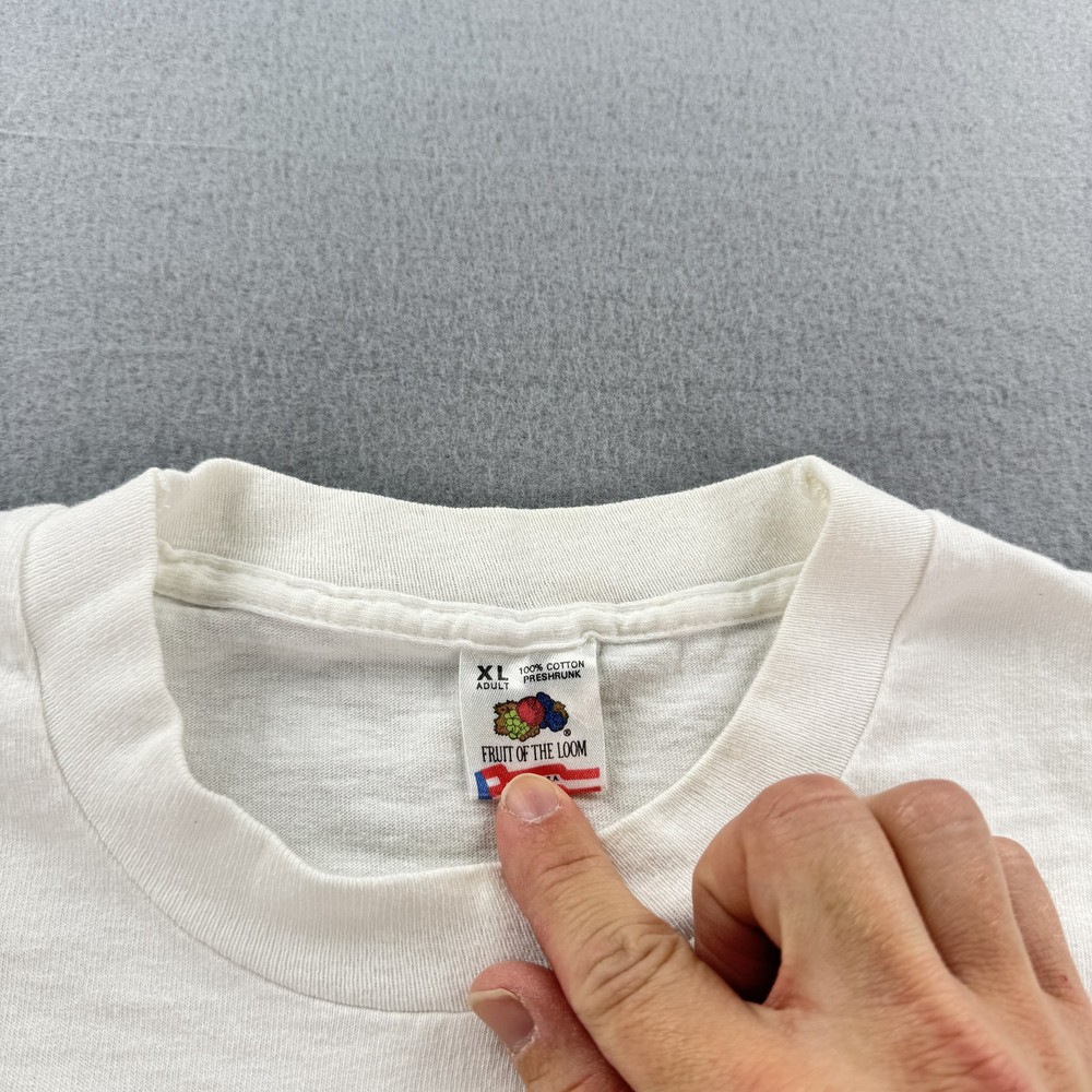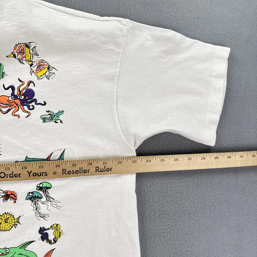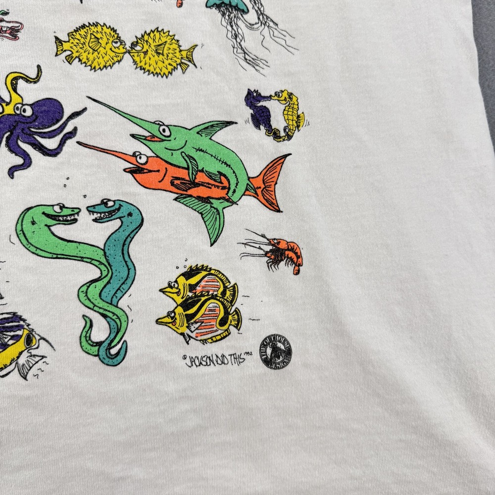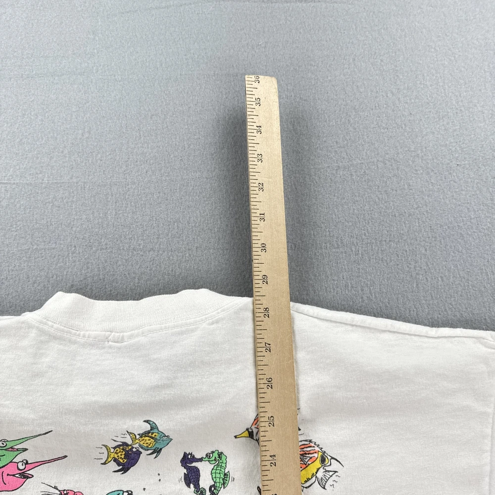 Vintage Hawaii Sea Of Love Shirt Mens XL White Cartoon Fish Ocean Graphic 90s Tee Condition: Good vintage condition. Light overall fading and typical signs of age and wash. No major stains or holes noted in photos. 100% cotton Fruit of the Loom T-shirt, made in USA. Tag size XL (Extra Large). Features large, colorful cartoon fish and sea creatures graphic on both front and back with bold "Hawaii Sea Of Love" text. Playful design signed "Yoison Did This '92" dated 1992. Double-sided all-over print makes it a standout 1990s tourist or souvenir tee. Classic single stitch construction on sleeves and hem—a hallmark of early 90s vintage shirts. Fruit of the Loom Best tag (XL) for accurate vintage sizing; please check measurements for best fit. Perfect for collectors, ocean lovers, or fans of unique and quirky graphic tees from the 90s era.