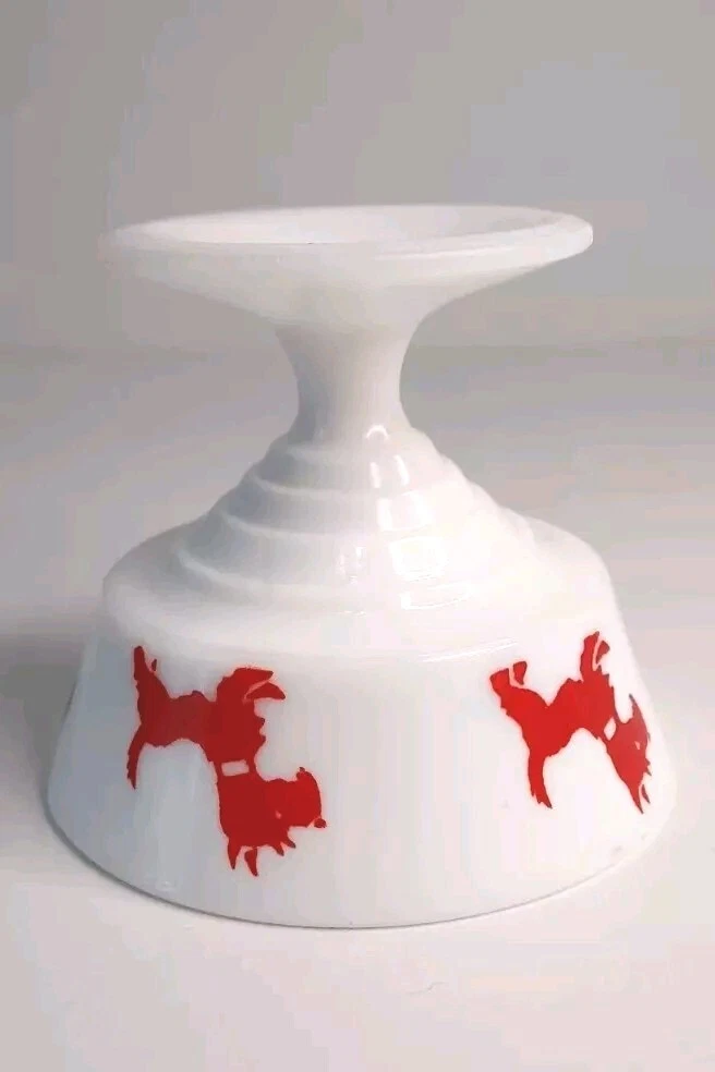 This vintage milk glass cup from Hazel-Atlas features a charming red scottie dog pattern on a milk glass background. This is the perfect size for serving sherbet or any other scoop of your favorite sweet treat. This piece is in excellent condition, showing very minor wear around the base rim as shown in the picture & reflected in the price. It isn't something that is easily seen but can feel when running your finger across it. There is NO heavy damage & it displays beautifully. It is recommended to hand wash this cup only. It is an original piece from the mid-20th century. This piece is perfect for dog lovers, collectors of vintage glassware, or someone simply looking to add some fun to their kitchen decor. This cup will ship with immense care & fast! If you have any questions or would like more pictures of a certain angle I may have missed, just reach out & I will reply promptly. Thank you!