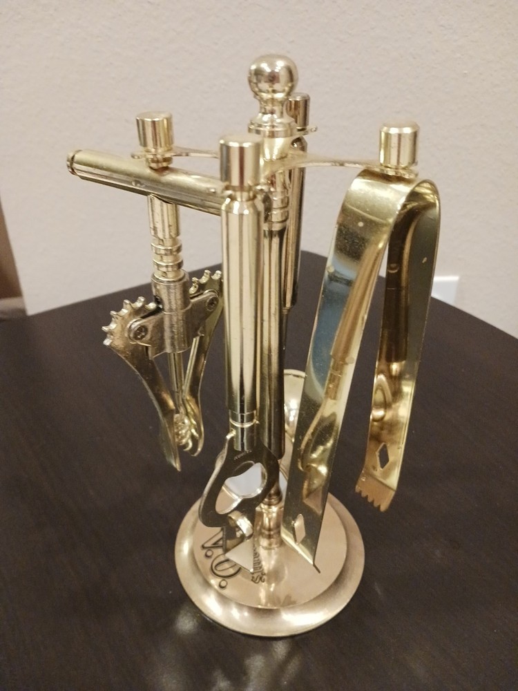 This Vintage Heavy Brass and Stainless Steel Bar Tool Set, made in Taiwan, includes 4 items perfect for all occasions. The set features a unique tooled pattern on gold colored materials, with a handle and barware theme. Made of stainless steel and brass, this original bar set is a timeless addition to any kitchen or home collectibles.