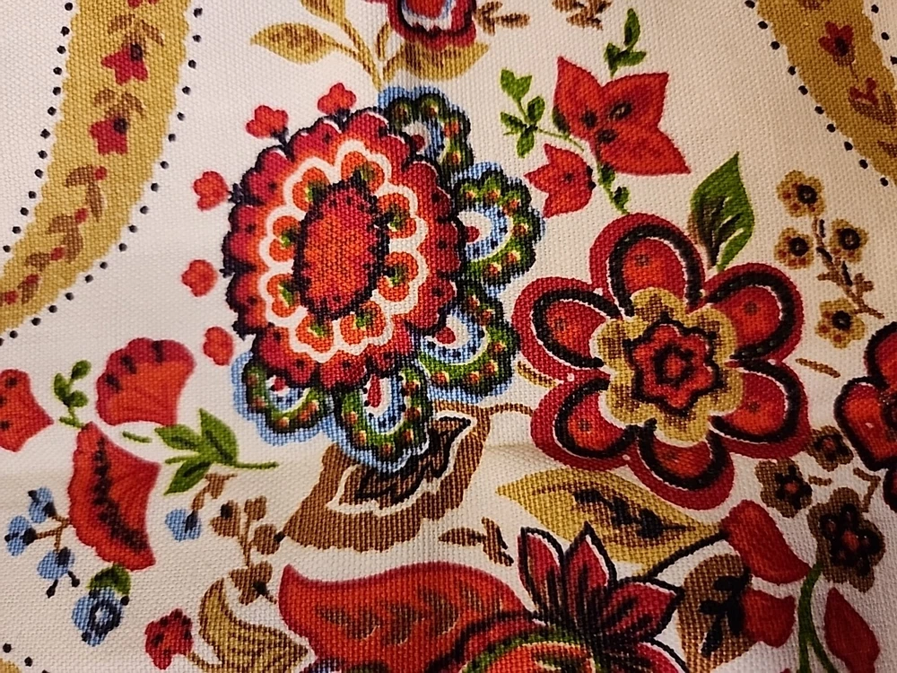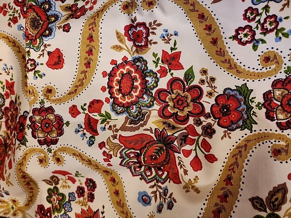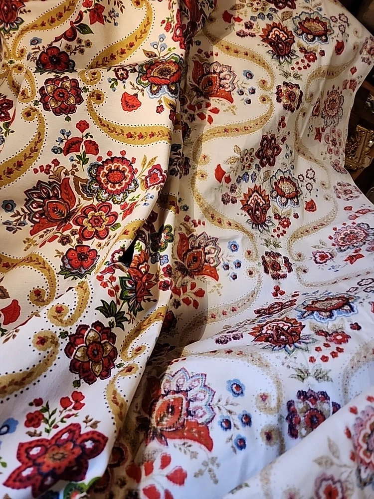 ITEM-SEW101 This vintage cotton material features a lovely floral print in beige, rust, and gold and blue. The heavy fabric weight is perfect for sewing projects, whether it be home decor or fashion. The material measures 45 inches by 50 inches and is unbranded, adding to its unique charm. Its new pre-owned vintage never used status should not detract from its potential use in your next creative endeavor. Great for pillows curtians table cloth..many uses.