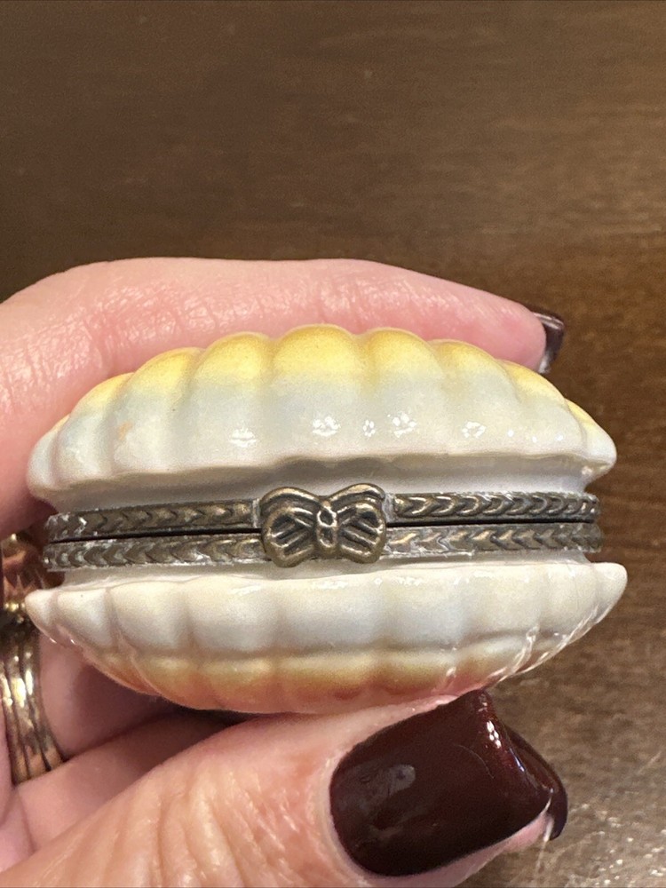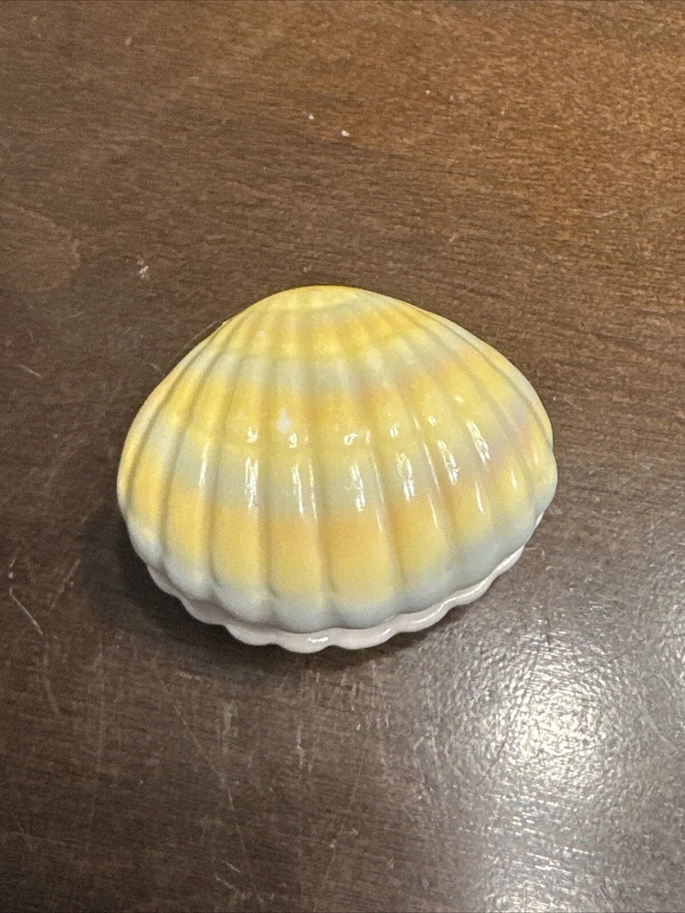 Absolutely love this charming little box! The vibrant yellow color and detailed porcelain shell design make it a standout piece. Perfect for storing tiny treasures, and the hinged lid works smoothly. Such a delightful find that adds a touch of seaside whimsy to my decor.