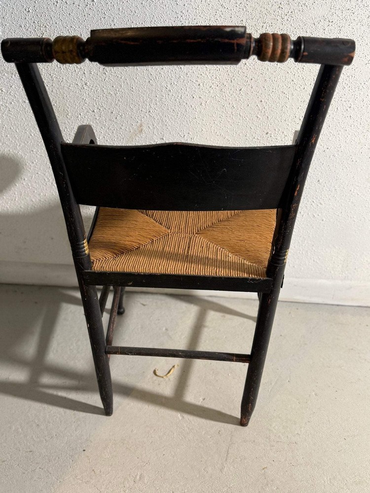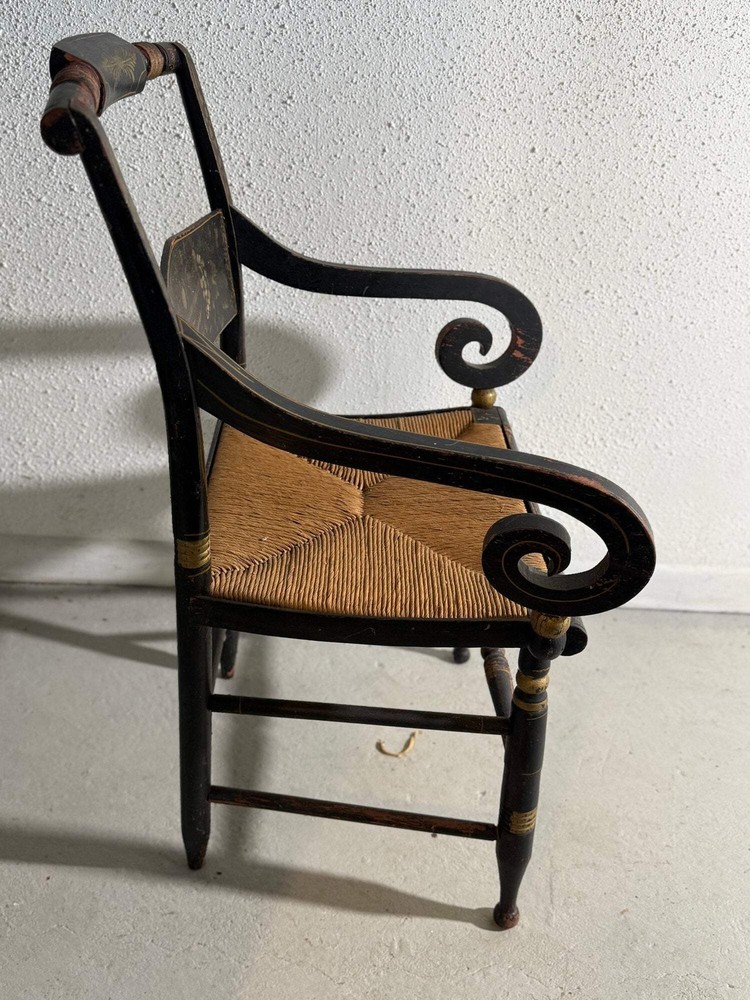 Vintage Hitchcock Black Painted Armchair with Rush Seat A vintage Hitchcock armchair in black painted finish with classic stenciled details and a woven rush seat. This timeless New England form features rolled scroll arms, turned legs, and a stretcher base, combining both strength and decorative appeal. The rush seat is intact with some wear, while the painted frame retains its warm patina. Hitchcock chairs are an American classic, first made in Connecticut in the early 19th century and later revived in the mid-20th century. This armchair is a versatile piece that works in farmhouse, cottage, colonial, or traditional interiors. Details Maker: Hitchcock Chair Company (attributed) Style: American Country / Colonial Revival Period: Mid-20th Century Origin: United States (Connecticut) Materials: Painted wood, rush seat Dimensions: Approx. 22” W × 18” D × 34” H, seat height ~17” Condition: Good vintage condition. Wear to painted surface and seat consistent with age and use. Structurally sound. Vintage Hitchcock Black Painted Armchair with Rush Seat A vintage Hitchcock armchair in black painted finish with classic stenciled details and a woven rush seat. This timeless New England form features rolled scroll arms, turned legs, and a stretcher base, combining both strength and decorative appeal. The rush seat is intact with some wear, while the painted frame retains its warm patina. Hitchcock chairs are an American classic, first made in Connecticut in the early 19th century and later revived in the mid-20th century. This armchair is a versatile piece that works in farmhouse, cottage, colonial, or traditional interiors. Details Maker: Hitchcock Chair Company (attributed) Style: American Country / Colonial Revival Period: Mid-20th Century Origin: United States (Connecticut) Materials: Painted wood, rush seat Dimensions: Approx. 22” W × 18” D × 34” H, seat height ~17” Condition: Good vintage condition. Wear to painted surface and seat consistent with age and use. Structurally sound. × × × × Buy now and save! Shipping info Click the Shipping & Payments tab above the listing description for more info Click the Shipping & Payments tab above the listing description for more info! Additional delivery notes PICK UP OPTION Sorry, our items are NOT available for pick-up. PAYMENT Immediate payment is required upon selecting "Buy It Now" or upon checking out through the cart. We accept payment via U.S. PayPal accounts and all Major Credit Cards, Debit Cards & Google Pay. We are legally required to collect sales tax in those states and localities where we maintain a physical presence (nexus). The applicable amount of sales tax charged to an order will be calculated based on the shipment destination's state and local sales tax laws. Thank you for shopping with us on eBay! Additional Information No additional information at this time Ask seller a question You might also like Early 19th Century Monumental English Blue Willow Turkey Platter Vintage Camille Silverplate Tea/Coffee Items With Tray & Candle Sticks Holders Vintage 1946 Rogers Smith Silver-Plated Tea Kettle Pot – Engraved Floral & Bird Cape Cod Sand Dunes – Original Oil Painting Signed J. Dell, 17″ × 14″ (Framed) Contact To contact our Customer Service Team, simply click the button here and our Customer Service team will be happy to assist. Ask seller a question © Legacy Finds Shipping & Payments Shipping is calculated on eBay, click the Shipping & Payments tab above the listing description for more information. Payment Accepted Payment Methods Immediate payment is required upon selecting "Buy It Now" or upon checking out through the cart. We accept payment via U.S. PayPal accounts and all Major Credit Cards, Debit Cards & Google Pay. We are legally required to collect sales tax in those states and localities where we maintain a physical presence (nexus). The applicable amount of sales tax charged to an order will be calculated based on the shipment destination's state and local sales tax laws. Thank you for shopping with us on eBay! Returns Returns are accepted Items must be returned within of the auction ending Seller will pay for return shipping. eBay integration by