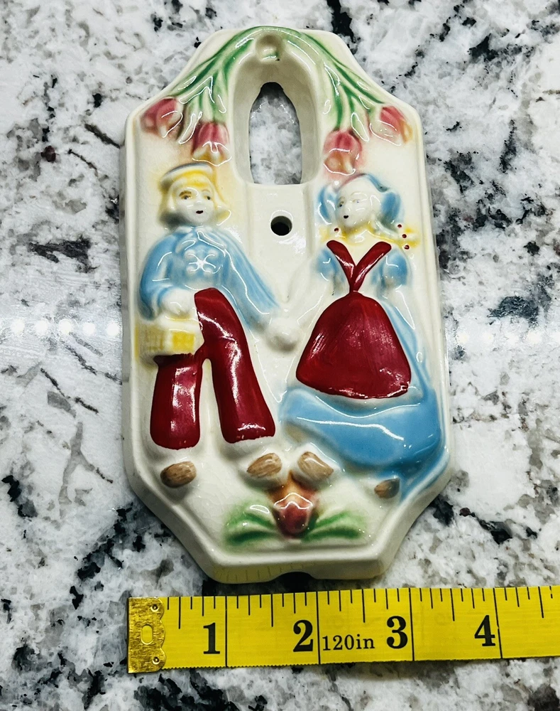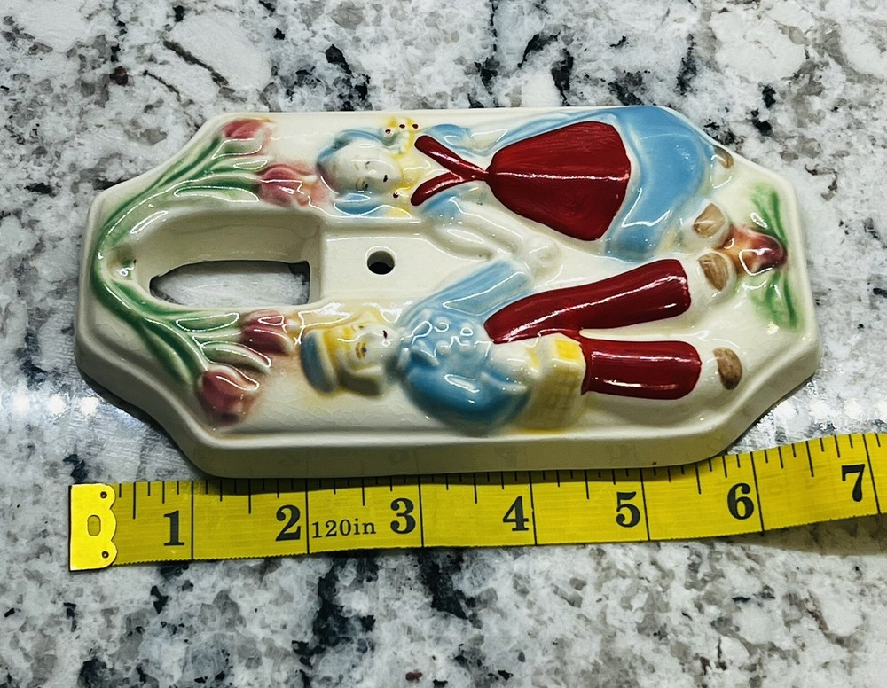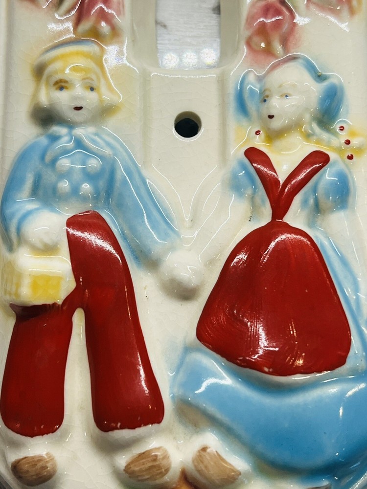 VTG Holland/Dutch Boy & Girl Holding Hands Ceramic Light Switch Cover Blue Red. Had some light crazing. See photos. 7” x 4”. Will be shipped using recycled materials.