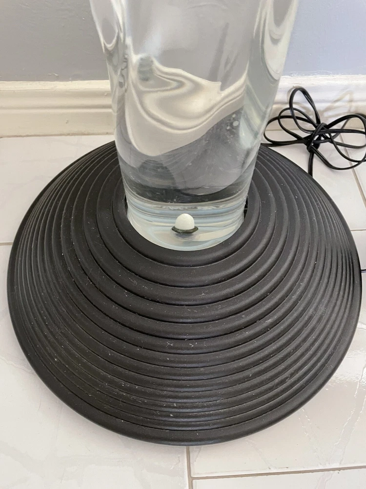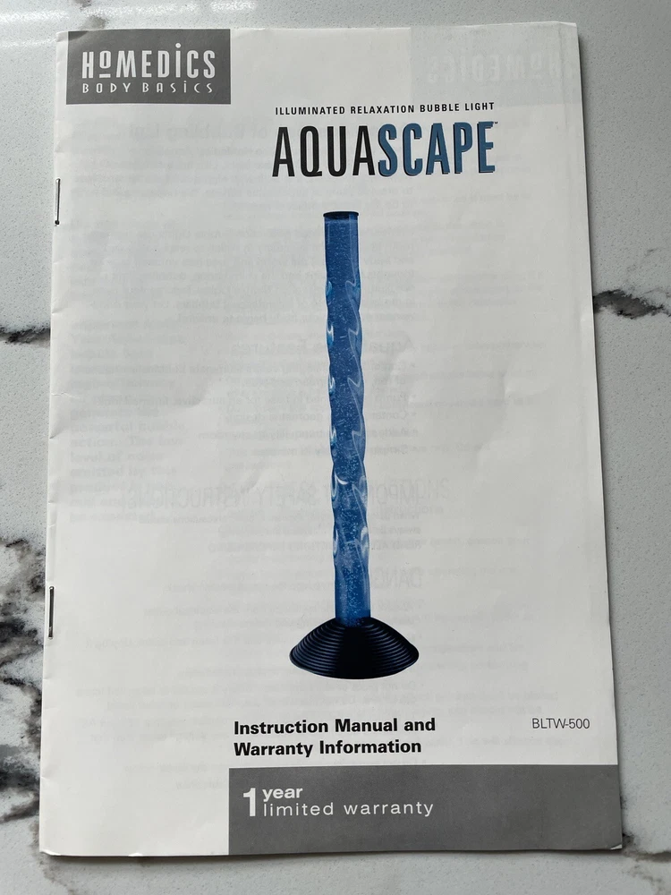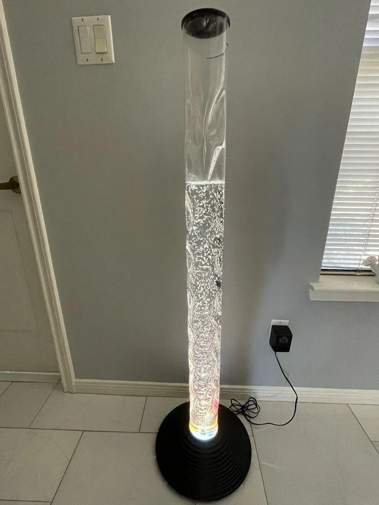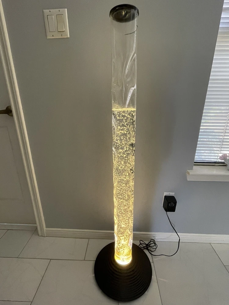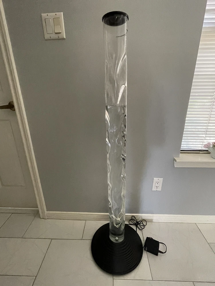 2000 Vintage Homedics 51-Inch AquaScape Twist Bubble Floor Lamp . Relaxes both mind and body. A vertical water tank, it uses a 20-watt, 12-volt halogen bulb and an air pump (hidden away in the base) to create a rising column of bubbles. A four-color wheel causes the powerful halogen light beam to change colors automatically. The twisty, columnar tank is made of transparent plastic; the domed, corrugated stand is plastic too, but its black surface looks like metal unless you get real close. AC adapter included, Water tower is 4 ft. tall and base is 3 in. tall, 13.5 in diameter. Uses distilled water only up to the top black line. Instruction Manual included. Video Bubble WaterLamp - YouTube