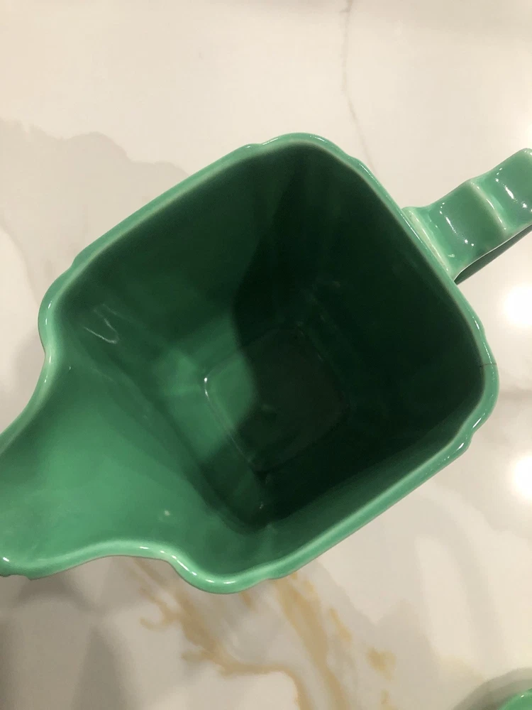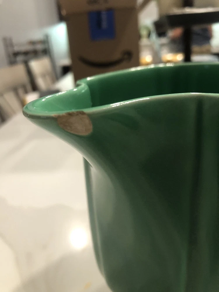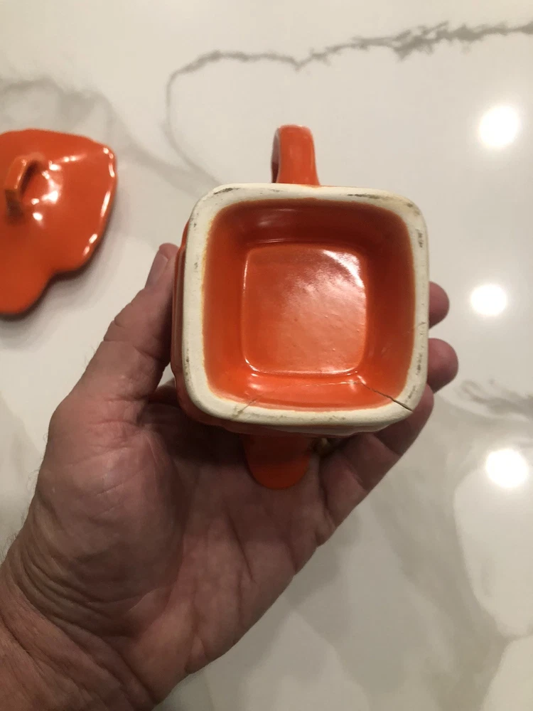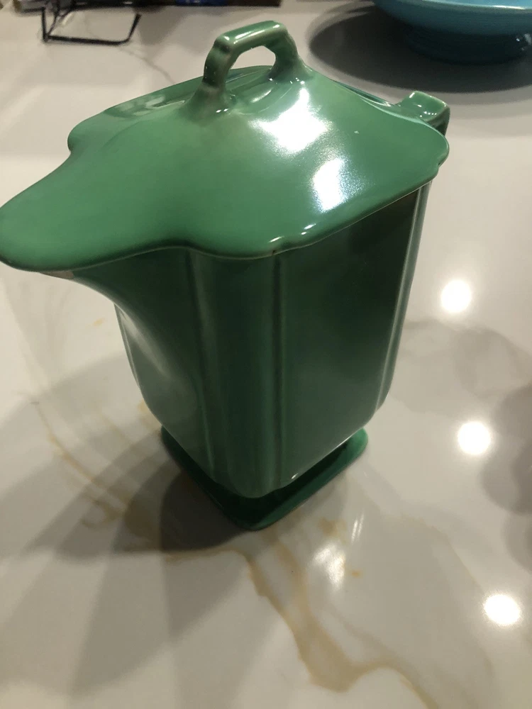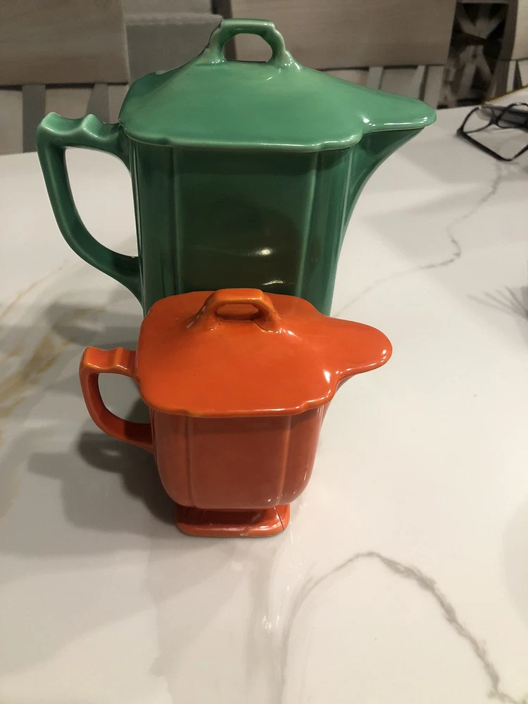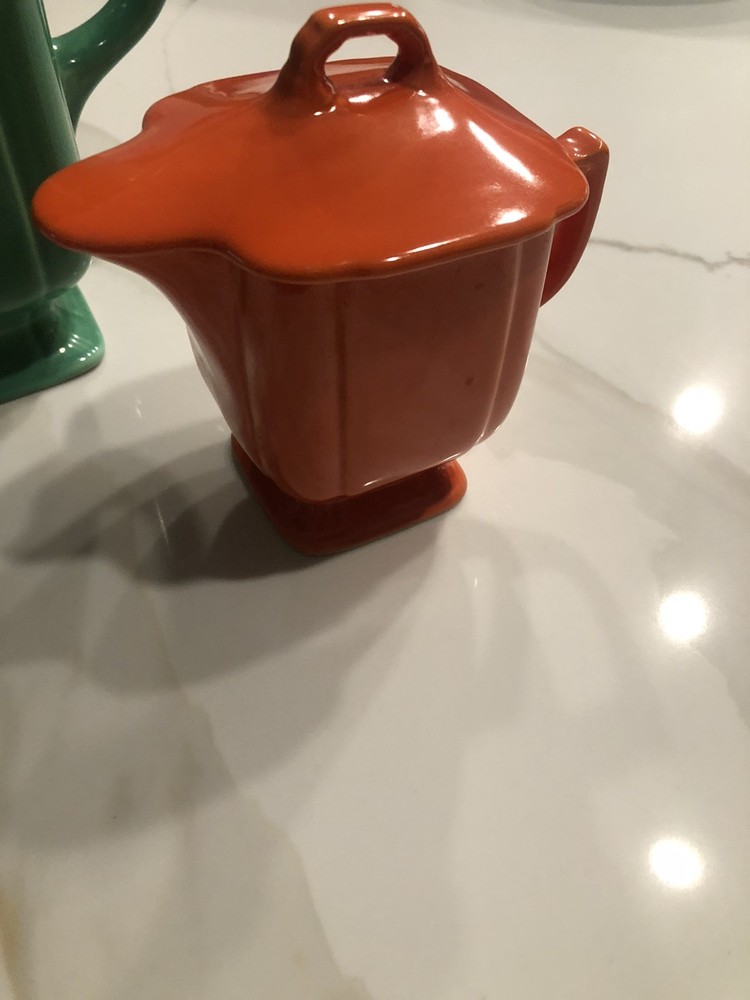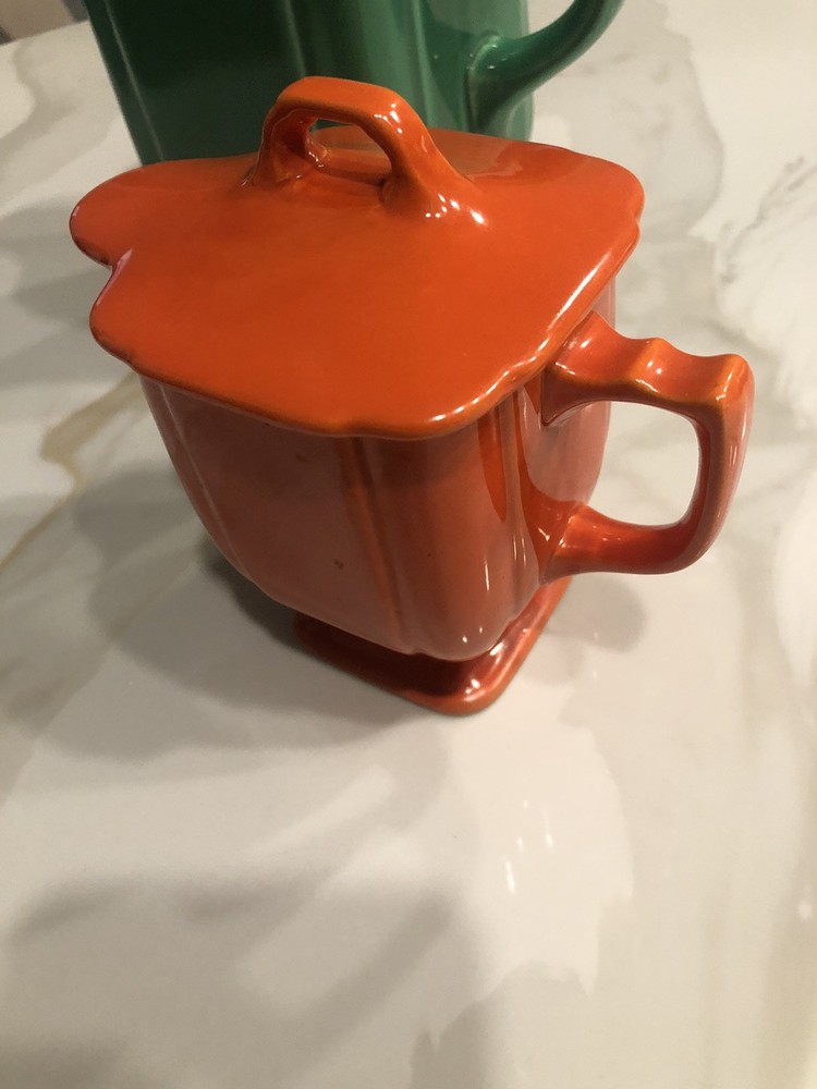 We have up for sale both pieces as pictured, let me describe these as not perfect , the batter pitcher has a chip in the spout as you can see and a very small one on the base . The lid is absolutely perfect ! The syrup pitcher has a repair on the bottom as you can see from The pictures. The lid is absolutely perfect also. These would be great display pieces for your collection as you don’t see them often come up for sale .the lids are selling for 75.00 each on eBay . Please look at the pictures and ask questions if you have any .