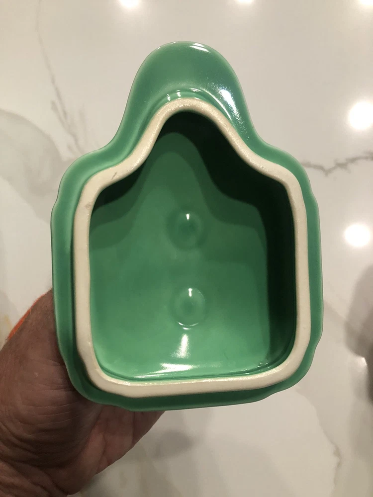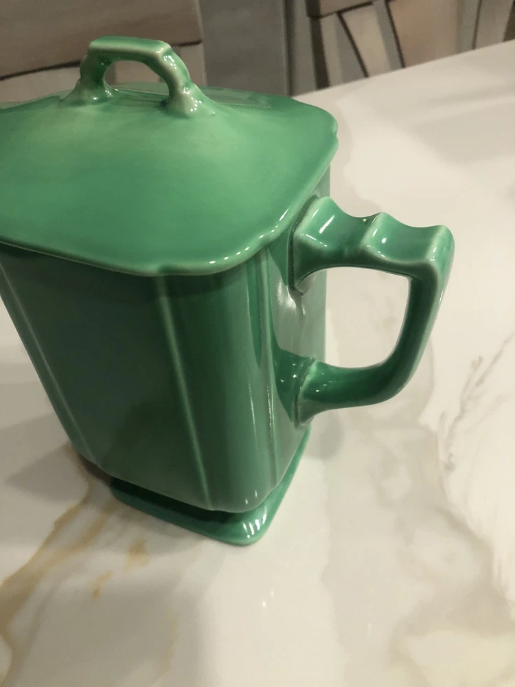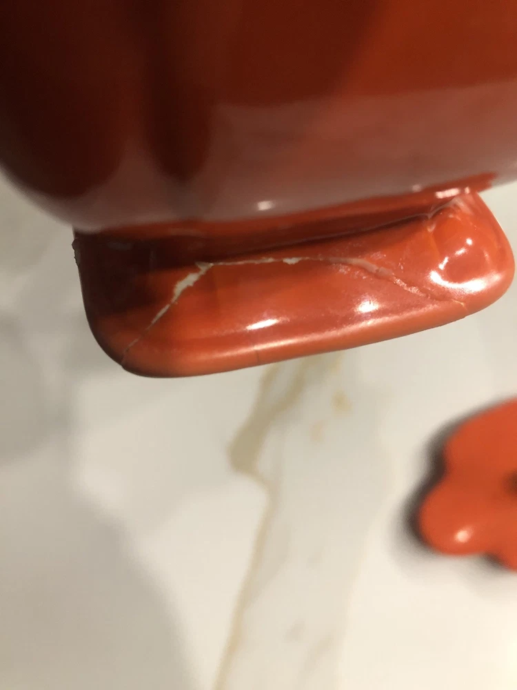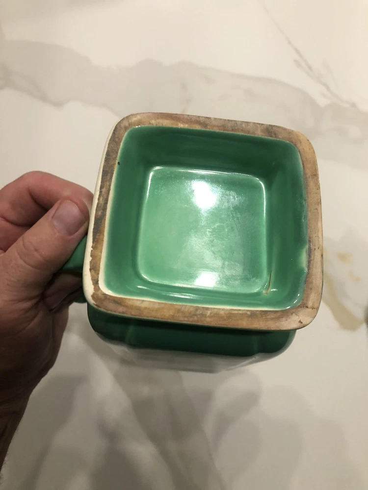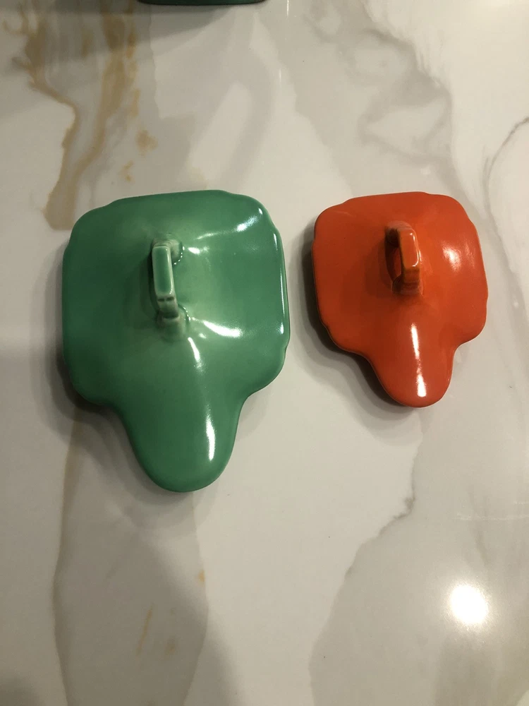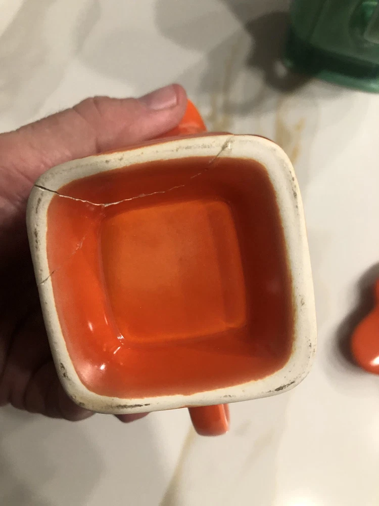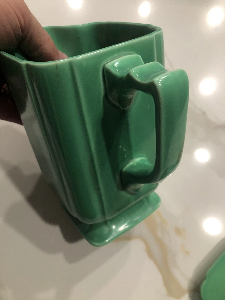 We have up for sale both pieces as pictured, let me describe these as not perfect , the batter pitcher has a chip in the spout as you can see and a very small one on the base . The lid is absolutely perfect ! The syrup pitcher has a repair on the bottom as you can see from The pictures. The lid is absolutely perfect also. These would be great display pieces for your collection as you don’t see them often come up for sale .the lids are selling for 75.00 each on eBay . Please look at the pictures and ask questions if you have any .
