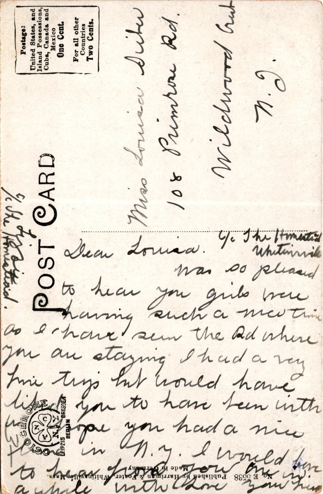 MAKE AN OFFER. THE MORE YOU BUY THE BETTER DEAL I WILL ACCEPT The postcard is a vintage image of the National Bank in Whitinsville, Massachusetts, and mentions The Homestead. The sender, Miss Louisa Sister, is writing to someone named Lorica at 108 Primrose Rd. in Wildwood Gut, New Jersey.