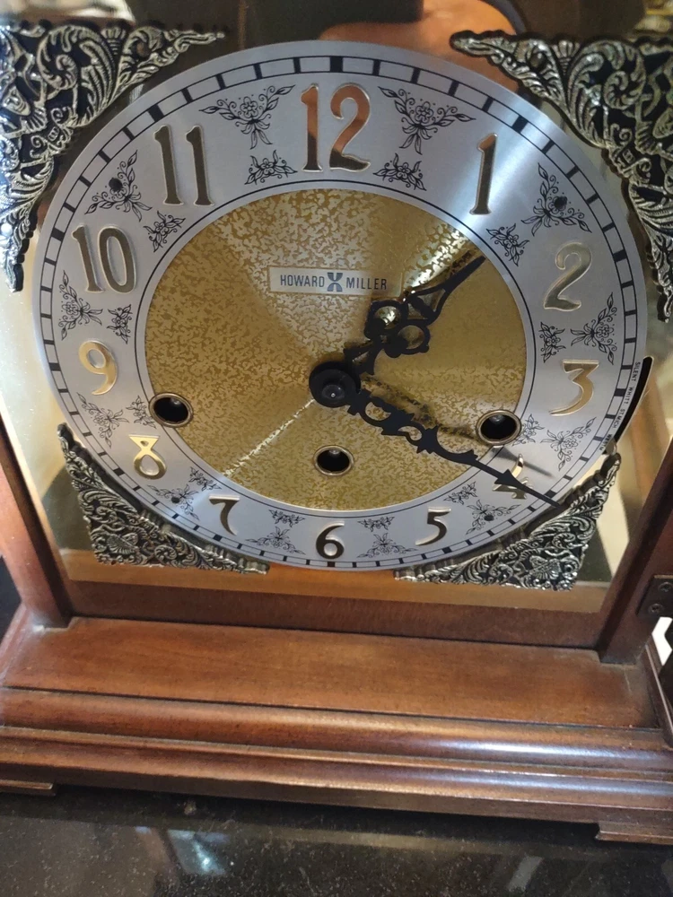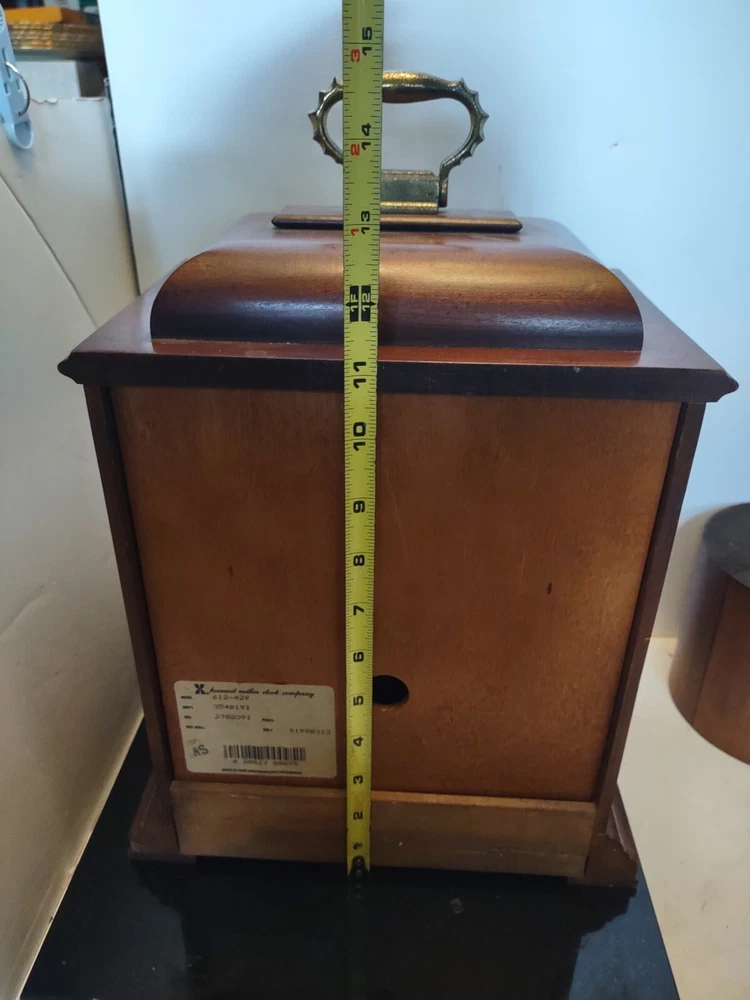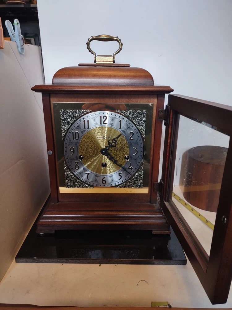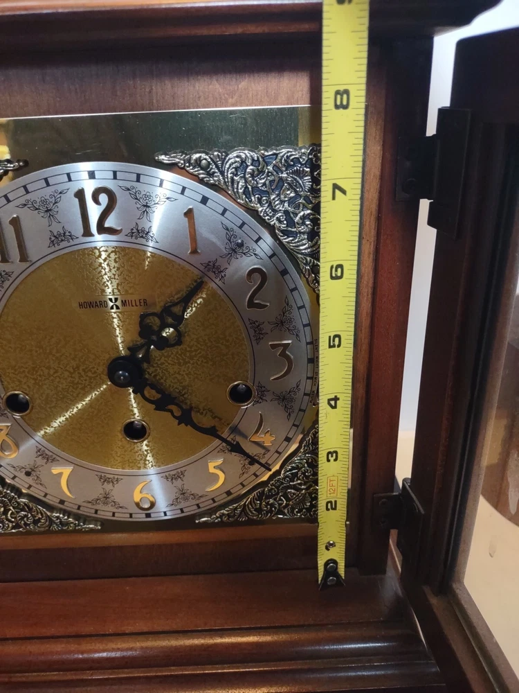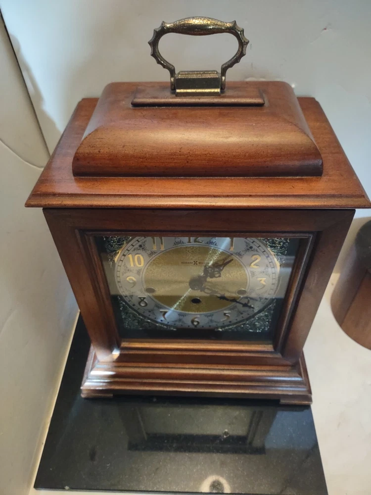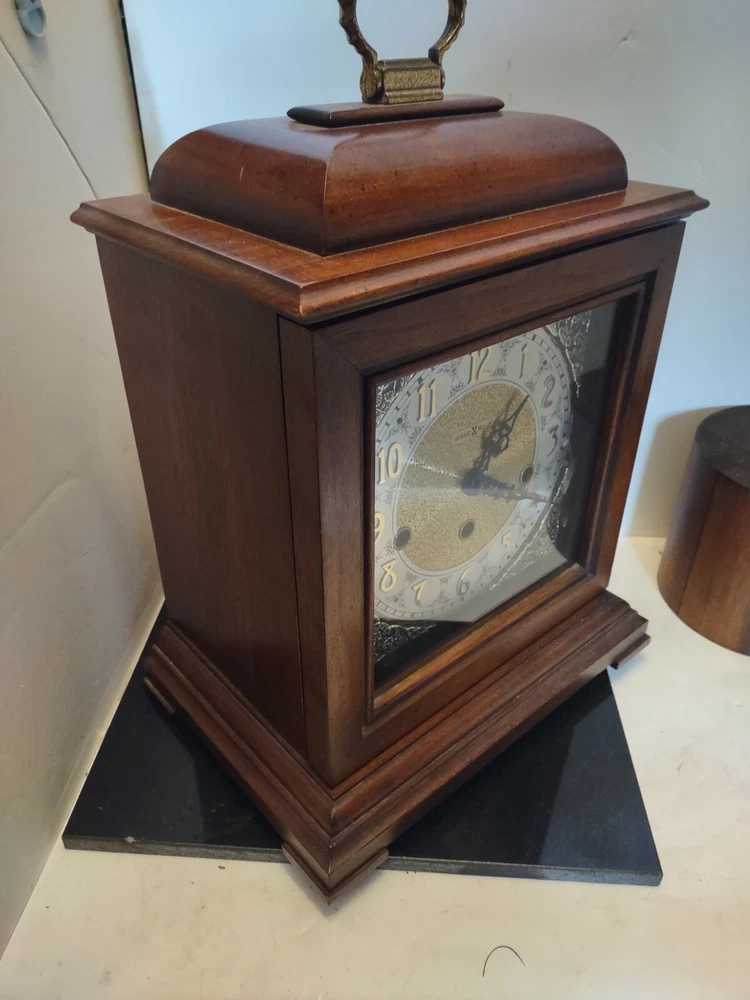 This stunning vintage Howard Miller mantel clock is a true gem for any collector or admirer of mechanical clocks. The clock features a beautiful wooden frame and a key wind mechanism that plays St. Micheals, Westminister, and Whittington chimes. Measuring 14-3/4" in height, 10-3/4" in width, and 871/4" in depth, this clock will make a stunning addition to any space. Beautiful pre-owned estate find in perfect working condition has been tested with key see pictures for details perfect for any clock collector beautiful display piece could make a great gift shipped right out USPS ground advantage With its classic design and high-quality craftsmanship, this Howard Miller clock is a must-have for any clock enthusiast. The clock is in excellent working condition and will keep time for 8 days. Don't miss your chance to own this unique and timeless piece of history.