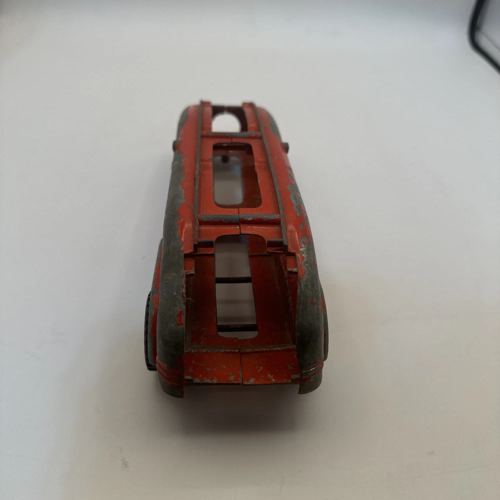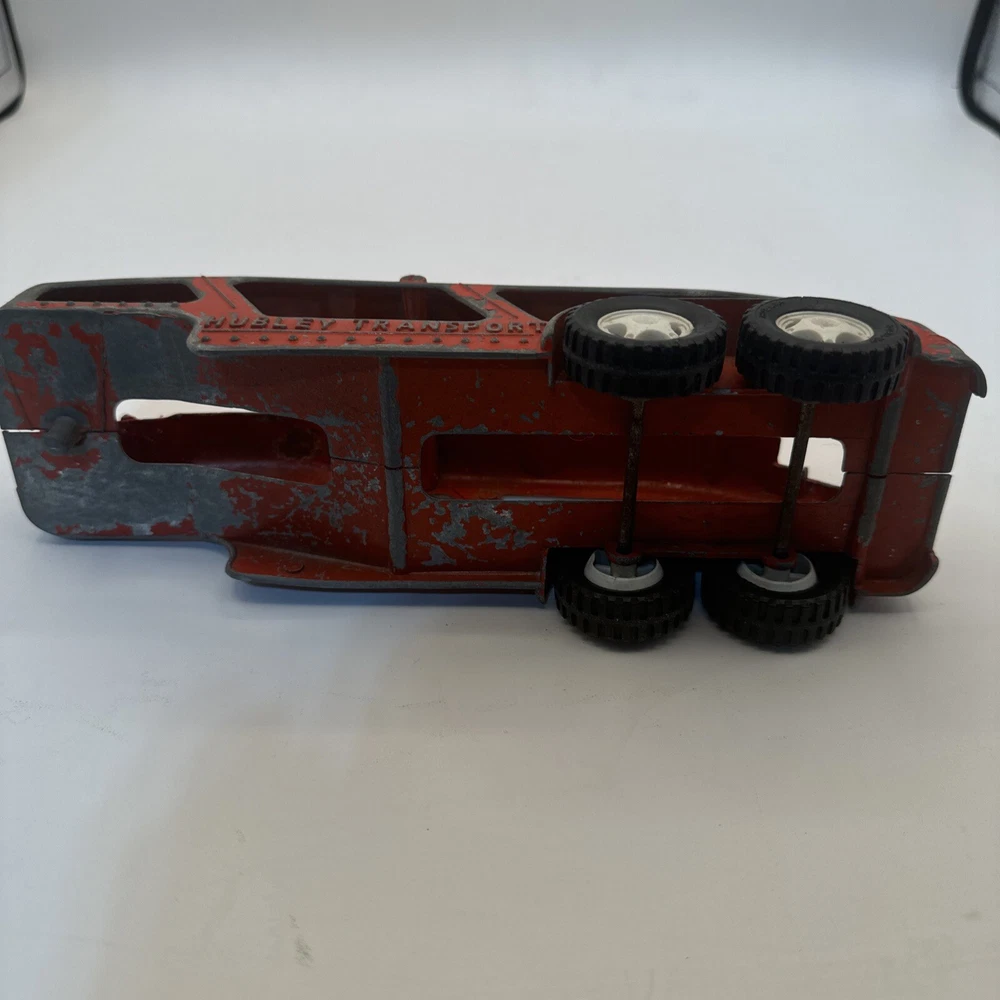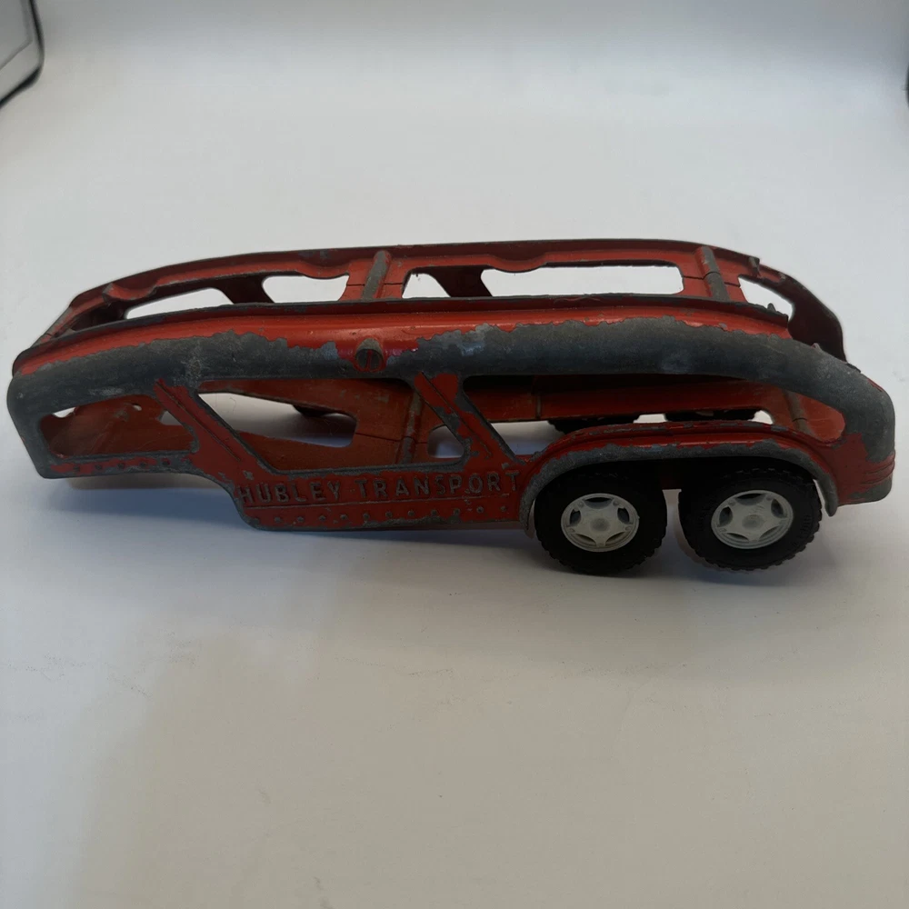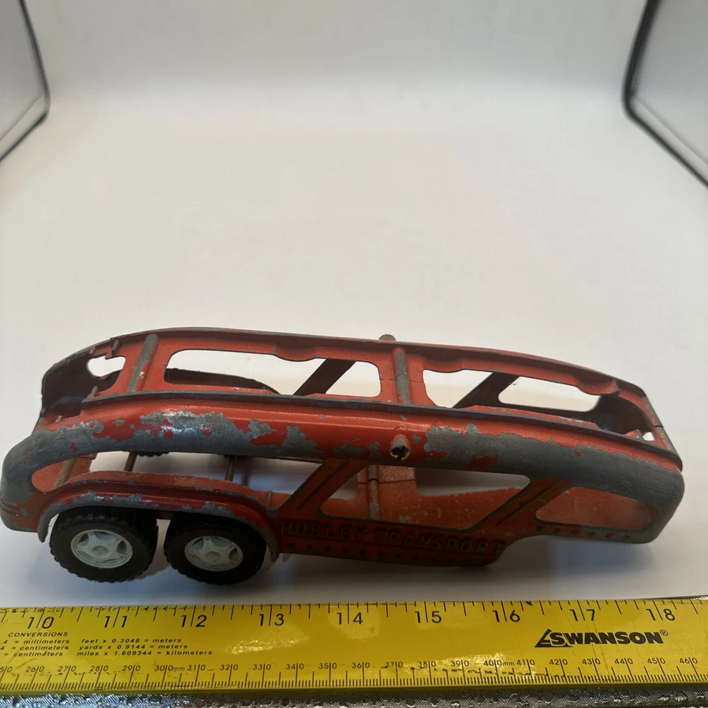 This vintage Hubley Transport red cast iron car hauler is perfect for collectors and toy enthusiasts alike. The trailer is beautifully designed with intricate details and features a sturdy hitch for easy towing. The vibrant red color adds a pop of color to any collection. The trailer is made of high-quality cast iron material and is built to last. It can haul various types of cars and trucks and is perfect for display or play. This item does not include a truck, just the trailer. Add this vintage car hauler to your collection today!