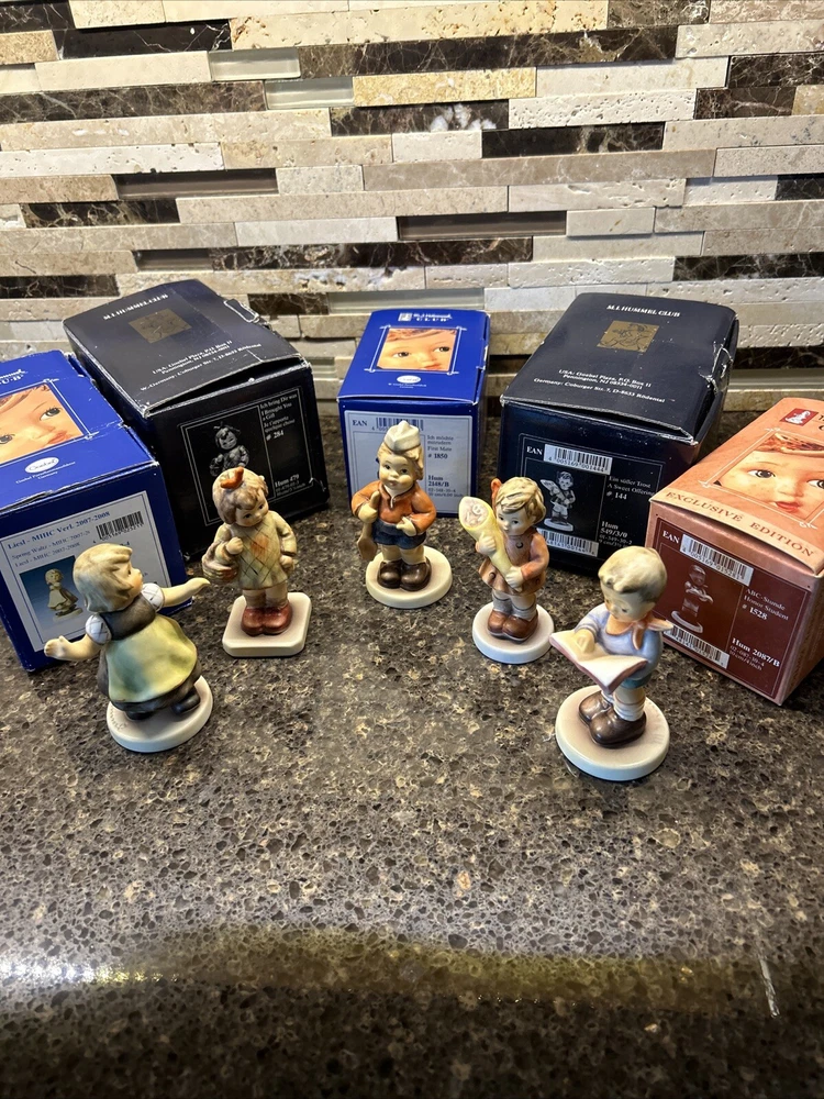 5 Hummel club figurines include: “Spring Waltz” #912B 4inches “I Brought you a Gift” #479. 3 7/8 inches “A Sweet Offering” #549 3 1/2 inch “First Mate” #2148 4 inch “Honor Student” 2087. 4 inch Excellent condition. no chips cracks repairs or crazing Comes from smoke free environment and was cared for in curio cabinet. If you are unhappy with your purchase please contact me so we can resolve any issues you may have. Please leave feedback so we know the transaction is complete and that your satisfied with your purchase. Thank You!