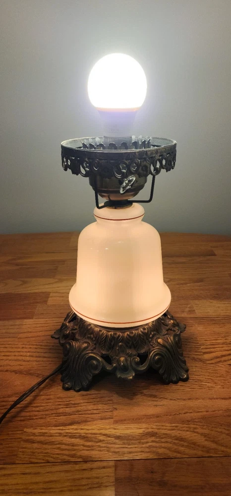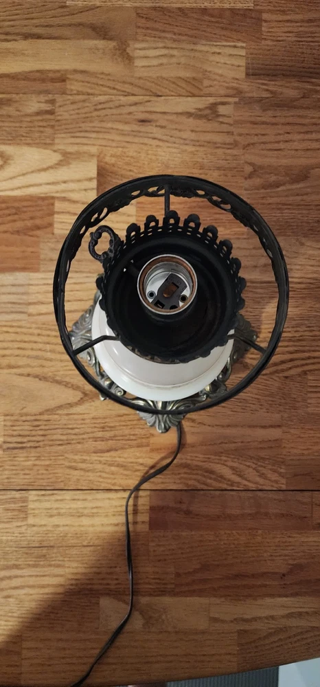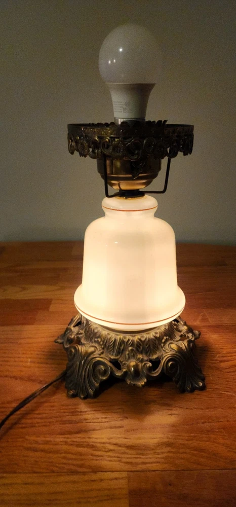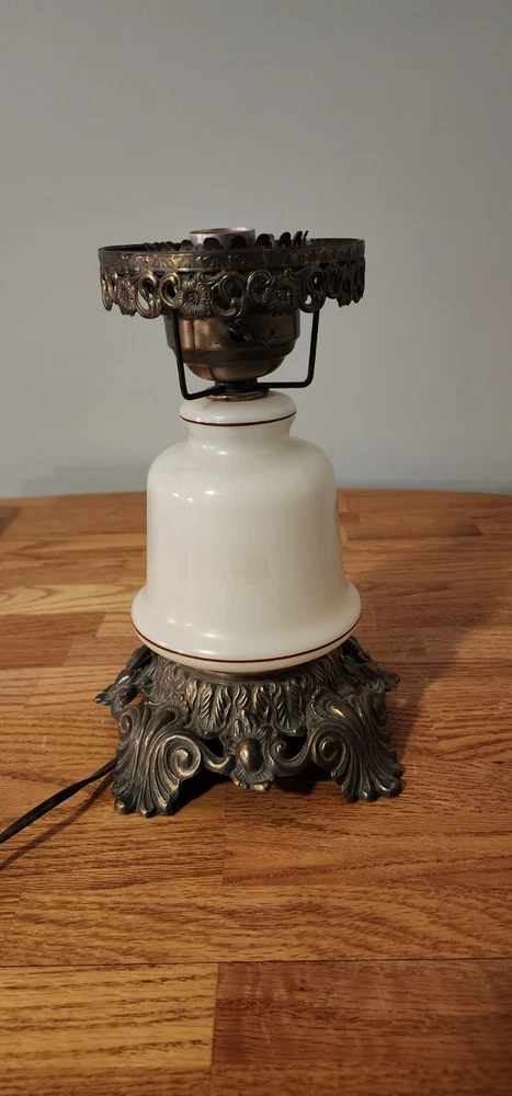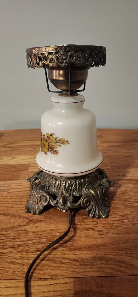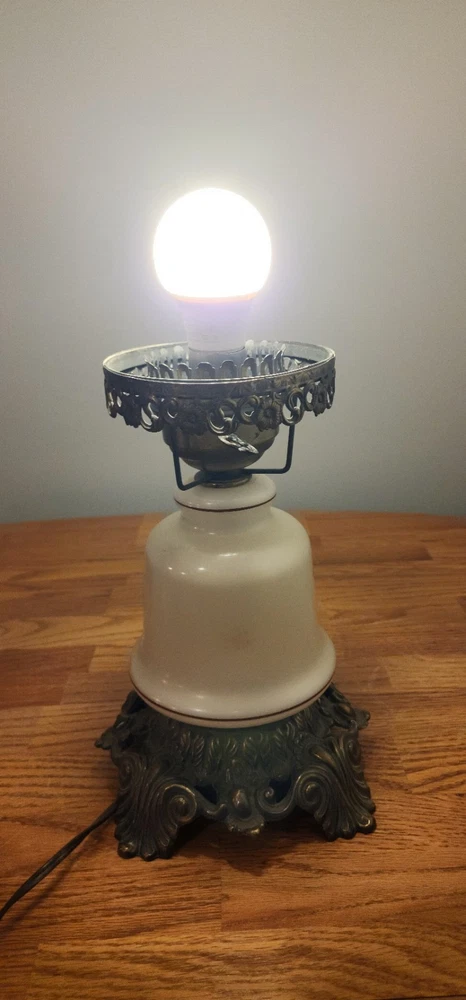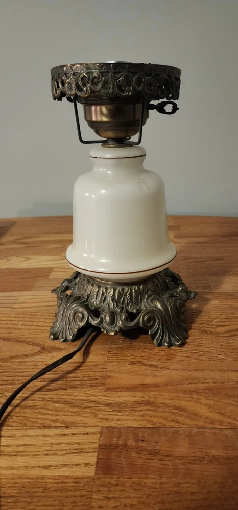 Vintage Lamp. It is a porcelain mide base with brass support. It works as shown in the photos. It's will make a great collection piece. Good shape. Sold as is.