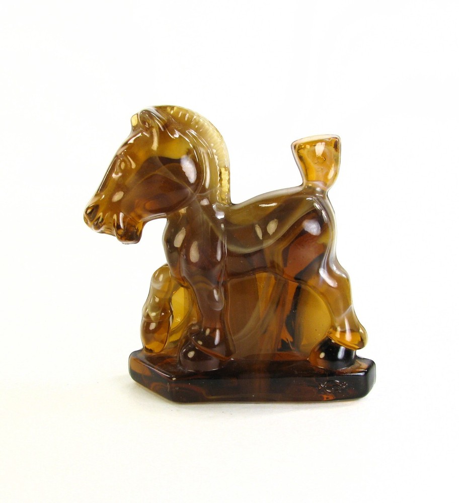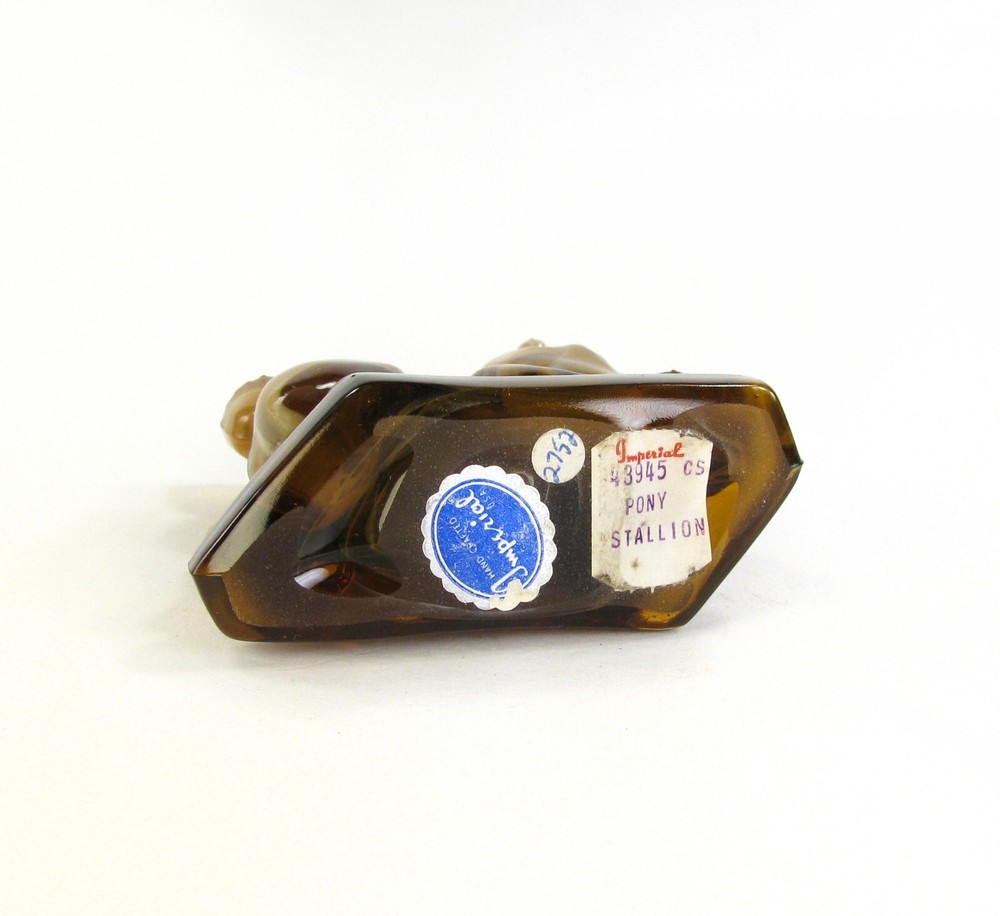 The Imperial Glass Co. made this Caramel Slag Oscar Plug Pony Horse (mold #12/1) in the glossy finish between 1969-76. It is marked with the IG factory logo and is about 4" tall. This one has its original tags in very good condition - see last photo. Our book: Slag & Marble Glass, The Prominent Years, 1959-1985 (N. Taves & D. Jennings) shows it on page 20. No damage found. All items are packed with great care. We love glass and do not want to be responsible for a piece of glass history being destroyed. Combined shipping is possible on most small or medium sized items: however, combined shipping may not be possible on larger pieces or for combining more than two or three items. Please ask about the items in which you are interested for combined shipping before buying. We will make every effort to combine items, when possible, to save you shipping costs. Inv. #953
