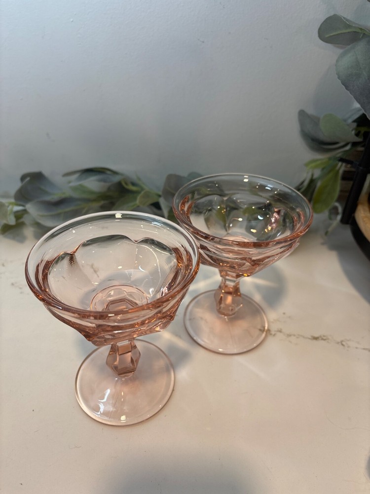 Elevate your toasting experience with these vintage Imperial Old Williamsburg pink champagne coupe glasses. Exquisitely crafted in the mid-1970s, each glass in this two-piece set showcases the timeless elegance of the Old Williamsburg pattern, with its classic round shape and intricate paneled design. Hand-blown from high-quality glass material, these pieces reflect a rich heritage and are a testament to the artistry of the era. Designed for all occasions, these glasses have a 4 fl oz capacity and are perfect for anyone who appreciates the sophistication of mid-century modern style. Whether you’re serving up sparkling wine or elegant sherbet, these unisex glasses are a versatile addition to your collection. Made in the United States, they are original pieces, not reproductions, ensuring you own a slice of authentic vintage art glass history.