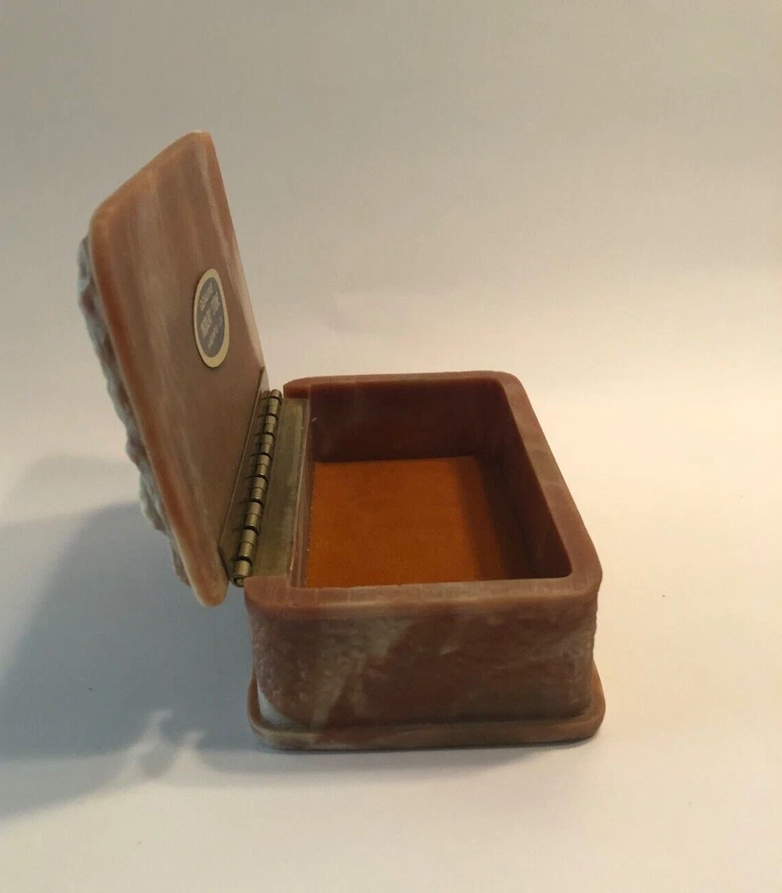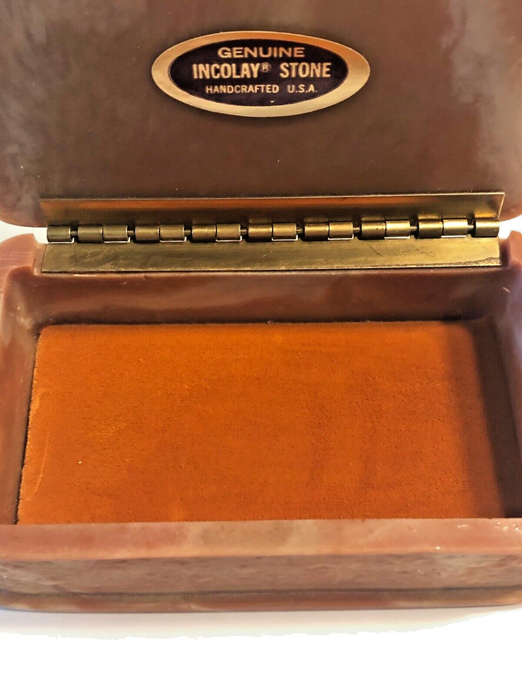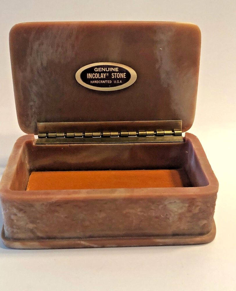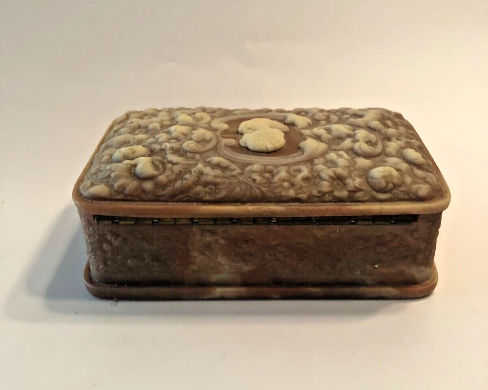 Crafted with care, this Vintage Incolay Stone Jewelry Box embodies the elegance of the Victorian era. The matte brown finish complements its classic cameo design, offering a timeless appeal for all occasions. Small yet sophisticated, this trinket box measures 5 inches in length, making it an ideal keepsake for your cherished jewelry or mementos.Proudly made in the United States, the box is a part of the exclusive Keepsake Boxes collection, renowned for its quality and style. It arrives neatly boxed, ensuring it remains pristine over time. With its durable stone construction, this piece is not just a container but a testament to the craftsmanship of bygone days.