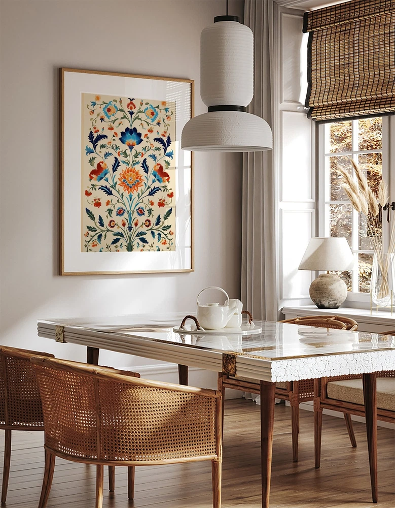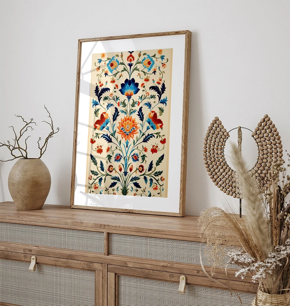 Vintage Indian Art Floral Palace Paintings Home Decor Mughal Floral Motifs Indian Poster Bohemian Wall Art Material: Premium luster photo paper Print type: Inkjet printing One side printed + The finish provides the highest possible resolution and color saturation + Lasts up to 200 years in color and 400 years in black-and-white + Printed on high-quality resin-coated photo base paper medium + Posters can be hung with double-sided tape, tacks, or framed + Hand washing with a gentle cry cloth is recommended for extended durability I will hand select the best choice of paper for your chosen design to ensure top quality results for a beautiful, bright and luxurious print. All prints are sealed in cellophane slips for protection during transportation, and are shipped in a protective cardboard envelope.
