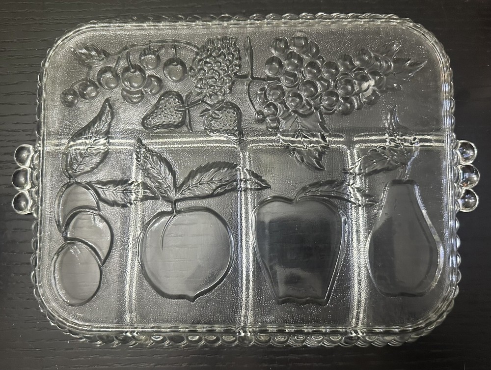 This vintage Indiana Glass relish dish tray features a retro design with an embossed fruit pattern, perfect for a grandma cottagecore aesthetic. The rectangular serving tray has 5 compartments, ideal for serving different fruits or snacks. Made of clear glass, it measures 11 inches in length, 9 inches in width, and 1 inch in depth. This original piece from the United States exudes a nostalgic charm with its vintage styling and would be a delightful addition to any kitchen or dining room.