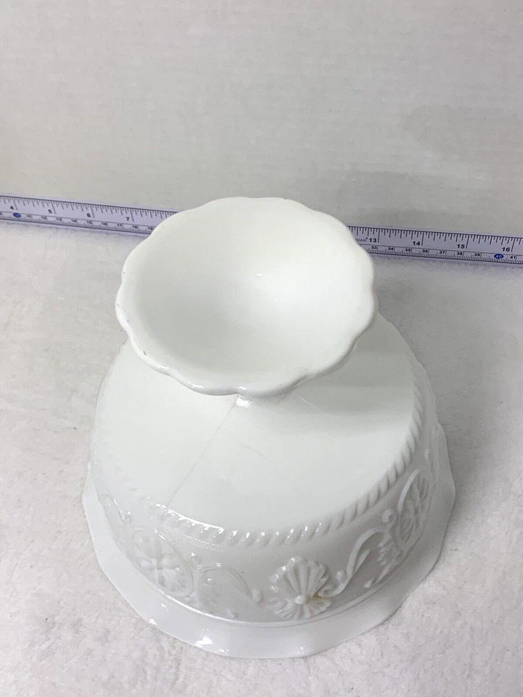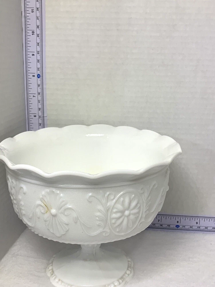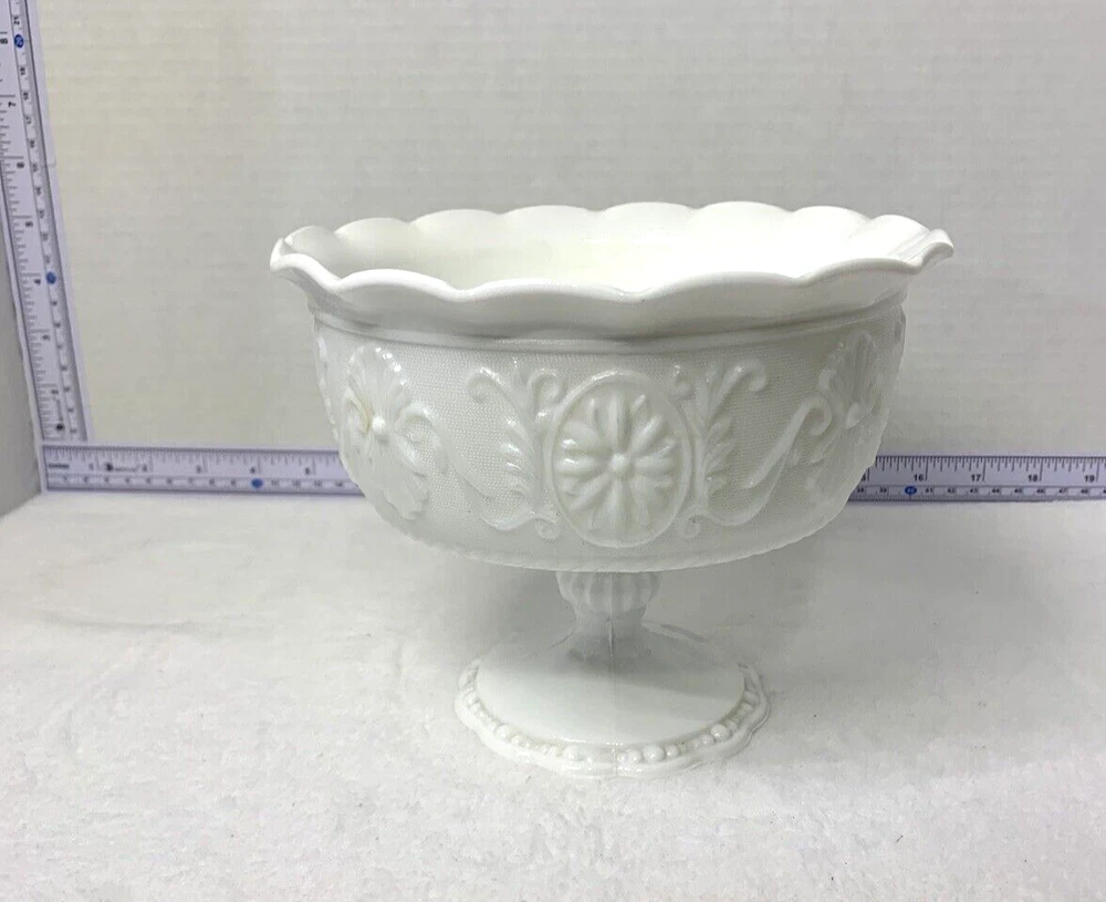 The Vintage Indiana Milk Glass Pedestal Compote Candy Fruit Fancy Bowl Dish is a charming piece of decorative cookware made of glass. This compote bowl features a classic pedestal design and a vintage milk glass production style, giving it a nostalgic and elegant look. Perfect for serving candies, fruits, or as a stylish centerpiece, this bowl adds a touch of sophistication to any table setting.