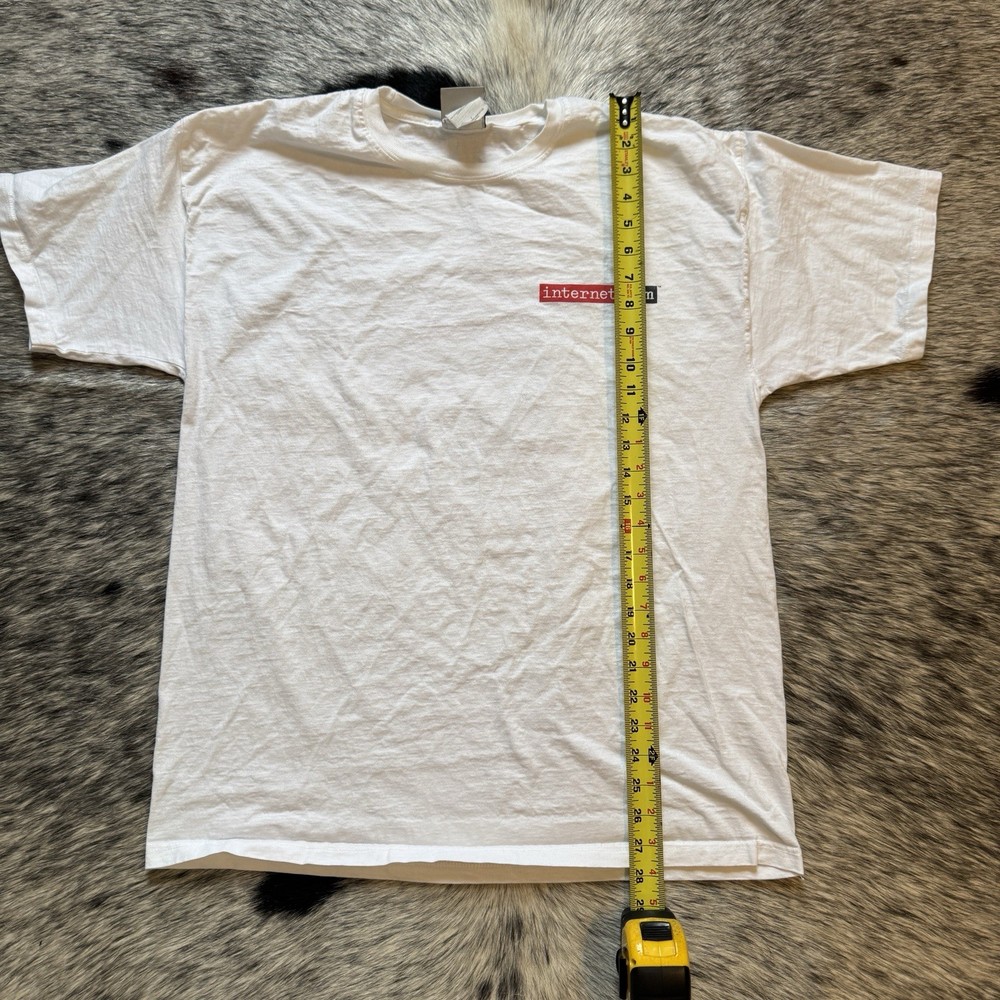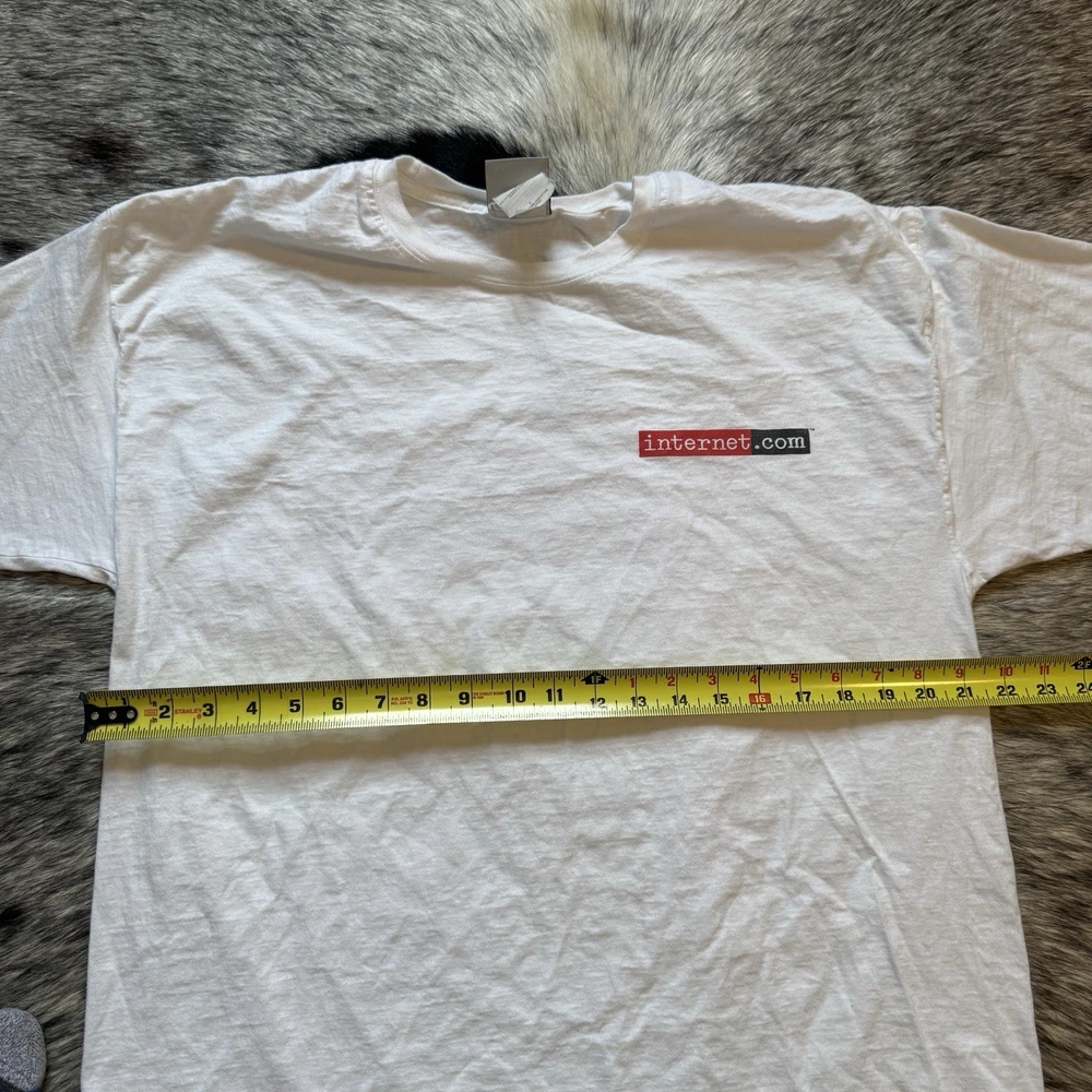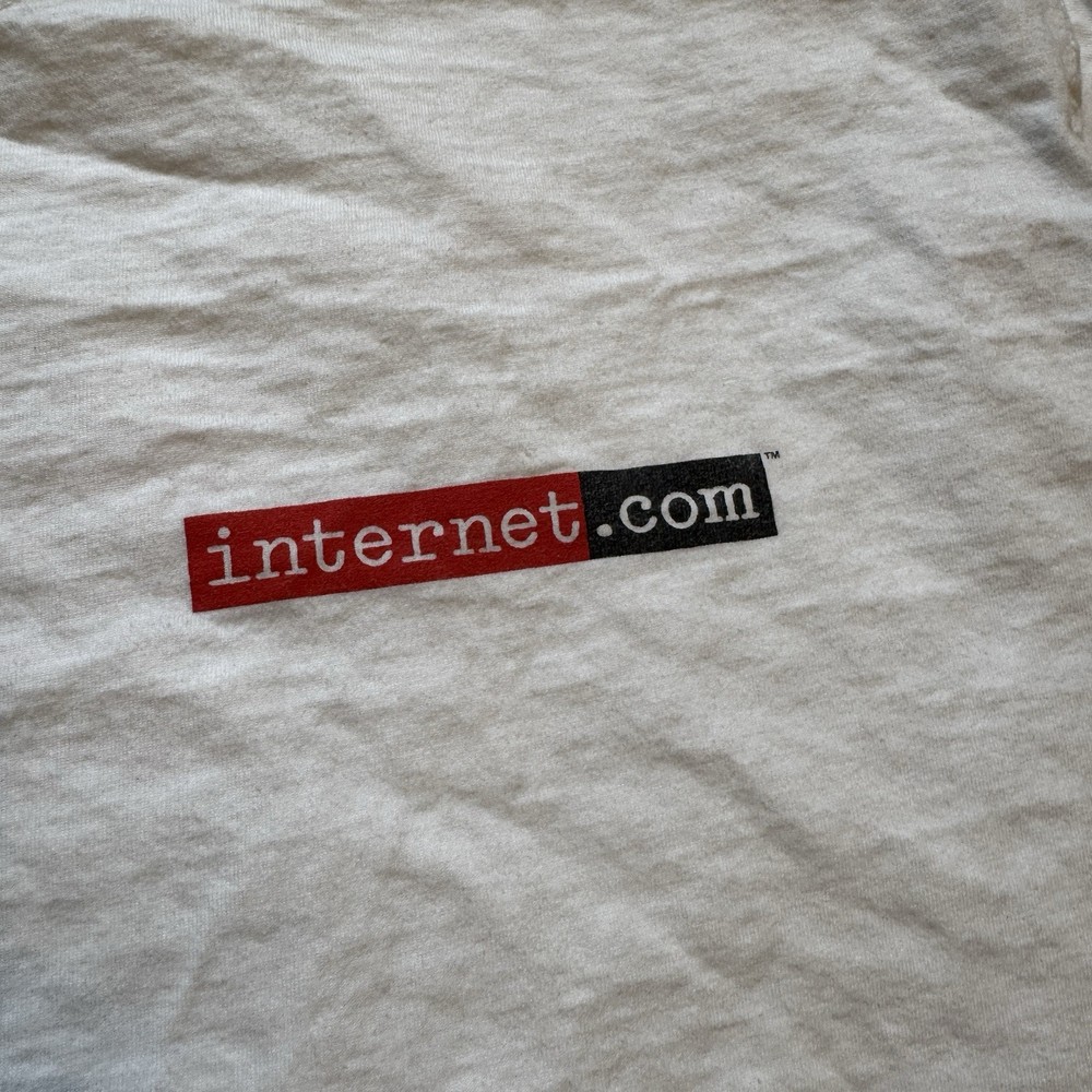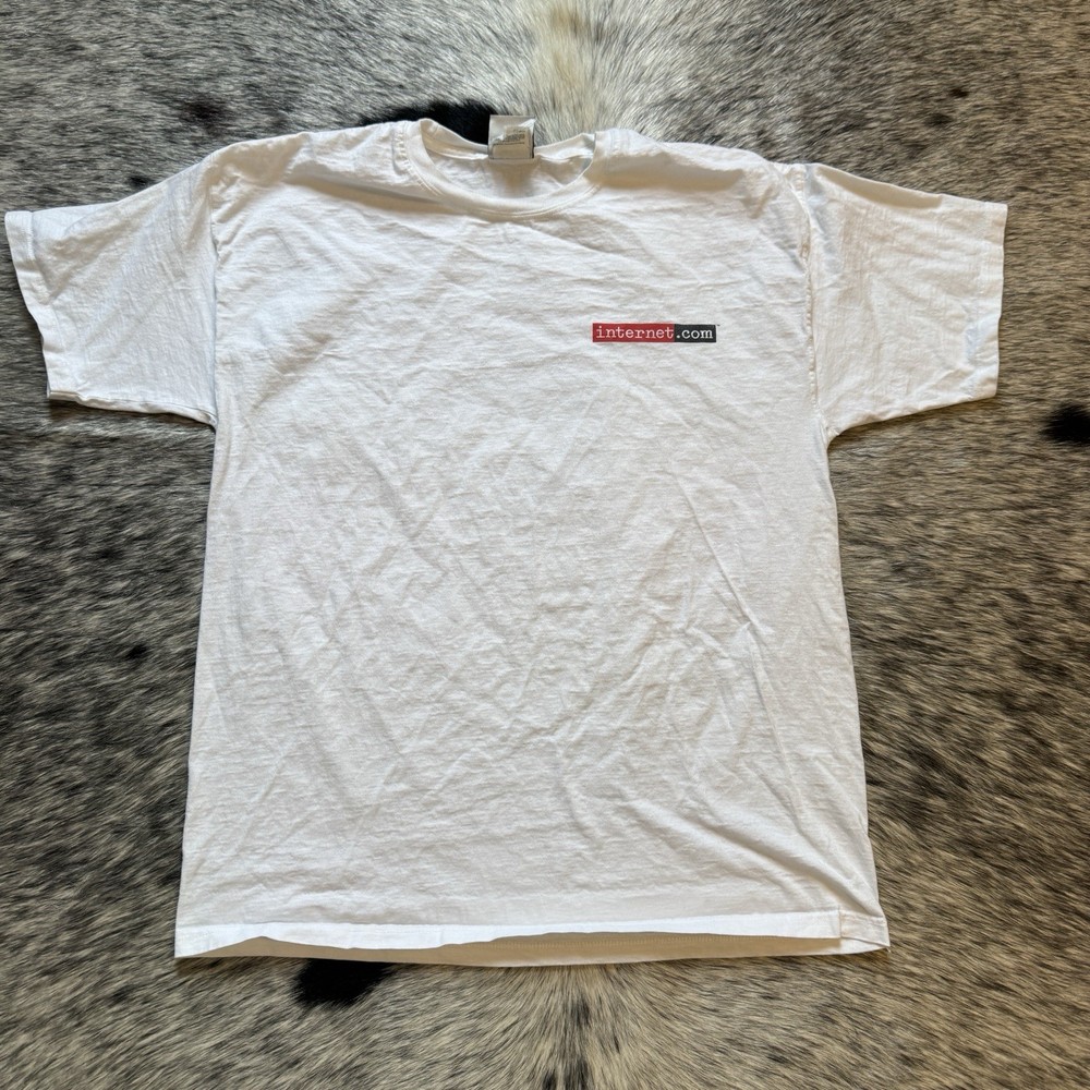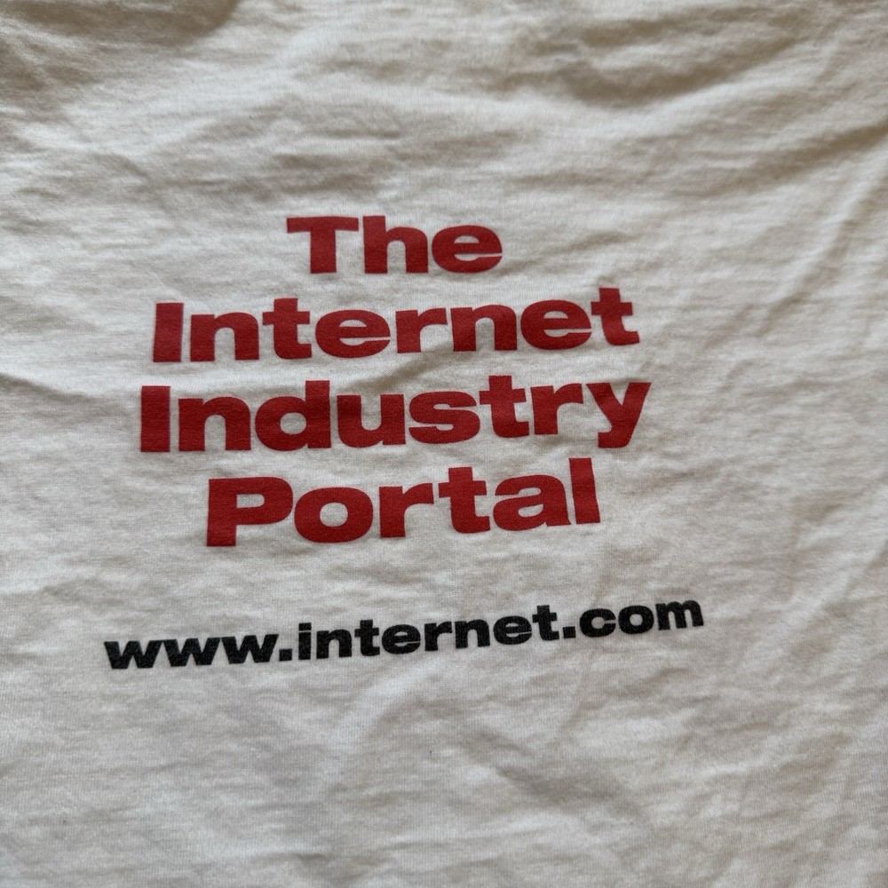 Absolute time-capsule piece from the early internet era. This is an original internet.com promotional T-shirt featuring the bold back hit reading “The Internet Industry Portal” with the iconic www.internet.com URL — a perfect snapshot of late-90s / early-2000s dot-com culture. Front has the clean, minimalist internet.com chest logo, making it super wearable while still being historically cool. Printed on a Jerzees Activewear blank, made from 100% combed ring-spun cotton and Made in Brazil, which collectors love for the softer hand feel and higher quality construction compared to later mass-market runs. Tag indicates size Large with a classic, boxy vintage fit that drapes well and layers easily. Condition is nicely worn but not thrashed — no heavy distressing, no major flaws, and the graphics are still clear and readable with that perfect subtle vintage fade that collectors look for. This is the kind of shirt that appeals to tech heads, startup nostalgia fans, Y2K collectors, and anyone who appreciates early internet history in wearable form. Extremely hard to replicate vibe and not something you see often in the wild. Perfect for casual wear, collection display, or styling with denim, cargos, or layered under a jacket. A genuinely cool piece of internet history you can actually wear. selling as-is, check pictures for condition