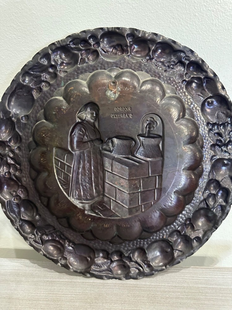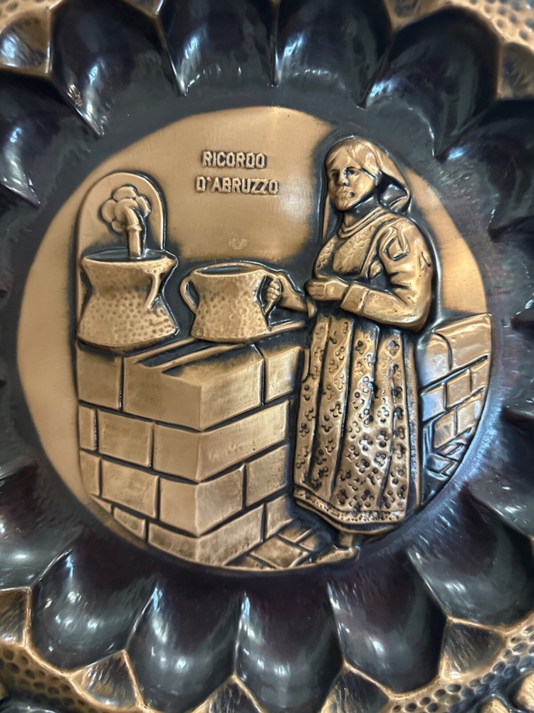 This vintage Italian Ricordo D'Abruzzo handmade 3D copper plate is a unique addition to any collection. Crafted with intricate details, this plate is perfect for displaying on a wall or tabletop. The copper material adds a touch of elegance and durability to the piece. Add this beautiful piece to your collection today!