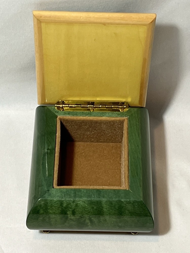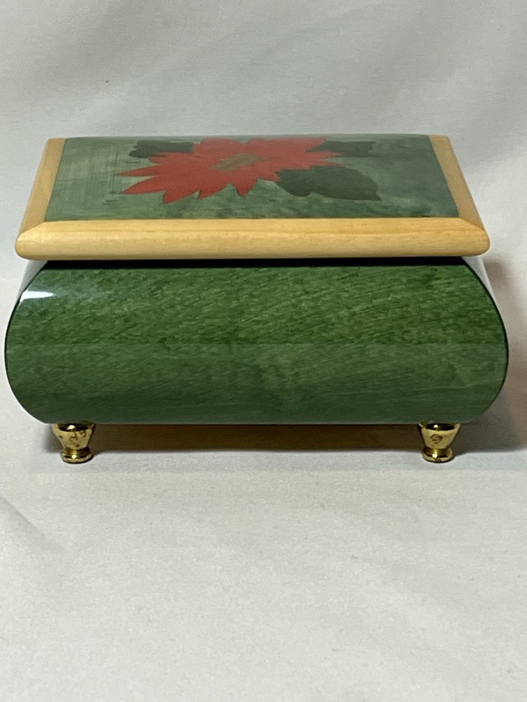 This Italian craftsmanship vintage suede wood jewelry box in emerald green with a poinsettia design exudes elegance and charm. The rectangular shape and Italian style make it a perfect addition to any room, suitable for all occasions. Handmade in the 1980s, this original piece from the keepsake boxes collection is a unique and timeless collectible. Care instructions recommend cleaning with a damp cloth, ensuring its longevity and preserving its beauty for years to come.