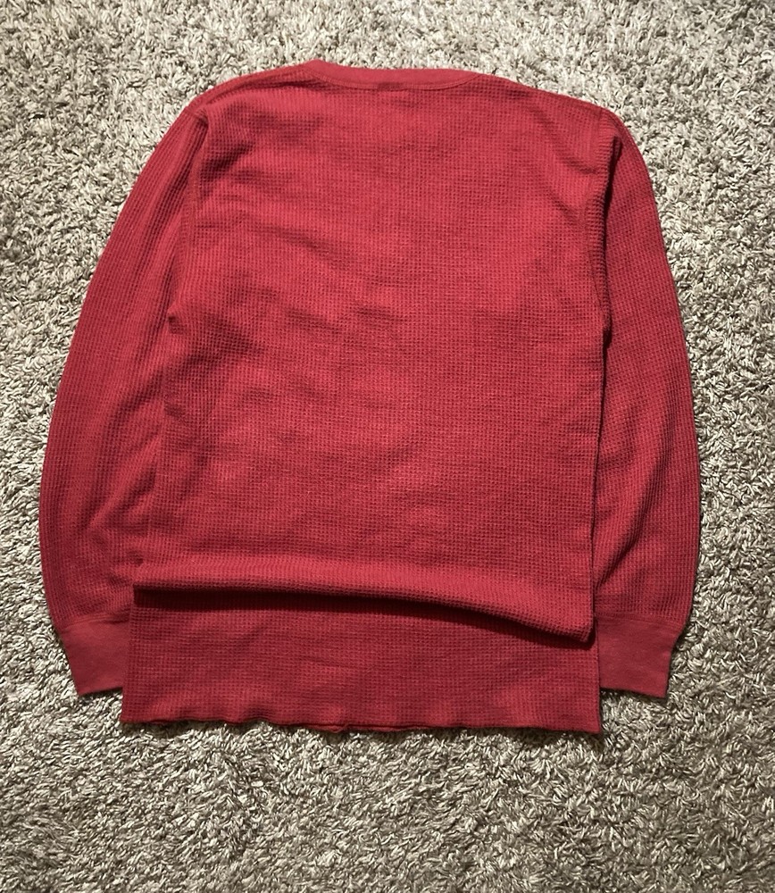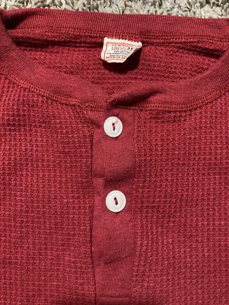 Authentic vintage J.E. Morgan waffle knit thermal in a classic red colorway. Made from a heavyweight waffle knit fabric designed for warmth and layering, featuring a traditional long sleeve cut and Henley-style construction. J.E. Morgan is well known for durable American-made thermals, making this a solid vintage essential. Men’s size Small with a slightly fitted vintage silhouette. Perfect for casual wear, workwear-inspired outfits, or layering in colder weather. A timeless piece that works well with denim, cargos, or under jackets. Vintage item with normal signs of age consistent with wear. Great for collectors, vintage enthusiasts, or anyone looking for a quality thermal with character. Chest width:17 in Shoulder width: 4 in Body Length: 28.5 in Sleeve Length: 22 in Bottom hem width: 18.5 in Sleeve Opening Width: 3 in