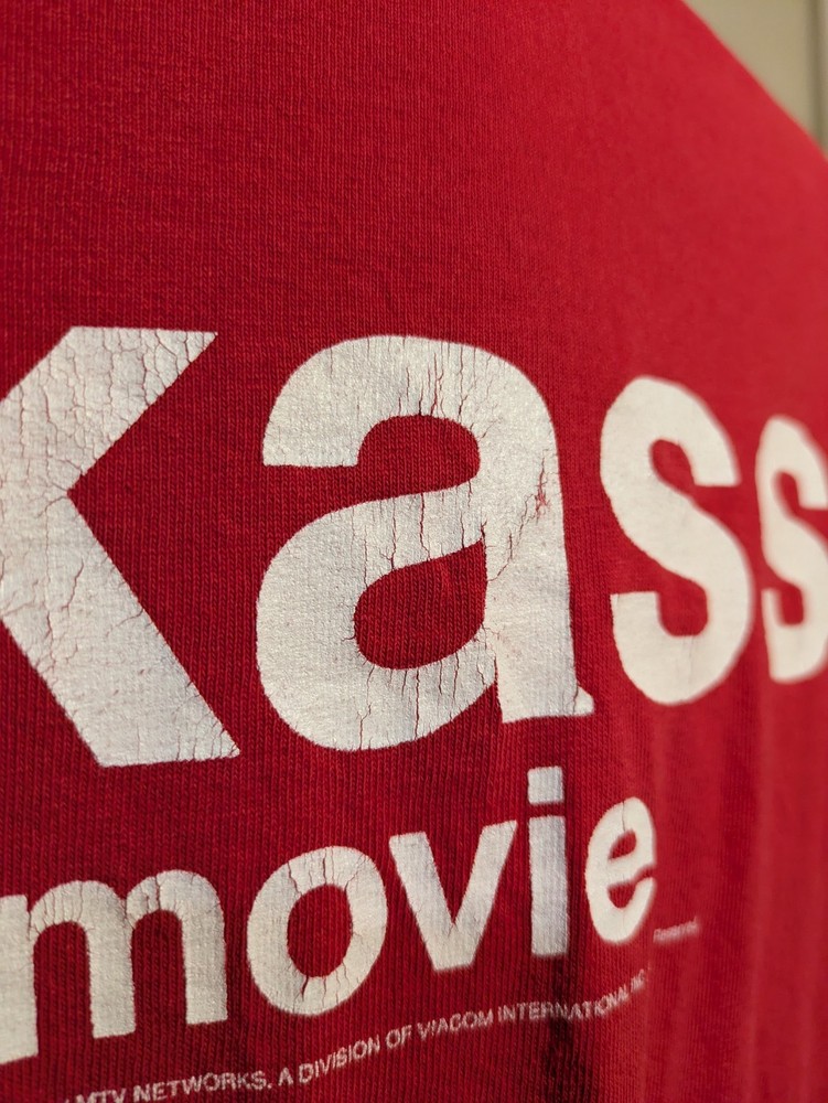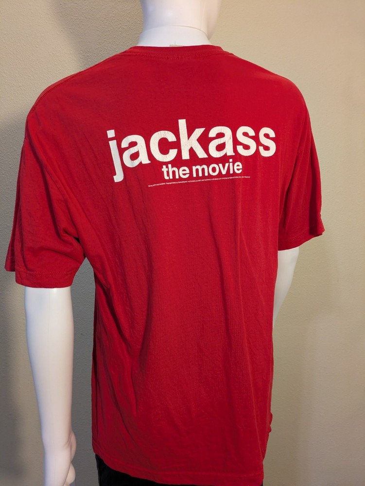 RARE Vintage Jackass The Movie (2002) Promotional T-Shirt This is an iconic piece of early 2000s pop culture memorabilia! This official T-shirt promotes the original Jackass: The Movie (2002), featuring the classic graphic loved by fans. Key Design Features: Front Graphic: The recognizable Skull and Crutches logo. Back Graphic: "jackass the movie" logo print. Brand: Alstyle Apparel & Activewear (Quality 100% cotton blank). Origin: Fabric Made in USA. ⚠️ IMPORTANT CONDITION & SIZING NOTES This is a true vintage item. Please review photos carefully: Print Wear: The white screen printing on the back logo shows cracking and distressing, which is consistent with its age and adds to the vintage look. Sizing Alert: Tagged XL, but fits slimmer than modern shirts. Please use measurements below. 📏 Exact Measurements (Flat Lay) Tagged Size: XL Pit to Pit (Chest): 22.5 inches Shoulder to Hem (Length): 30.5 inches