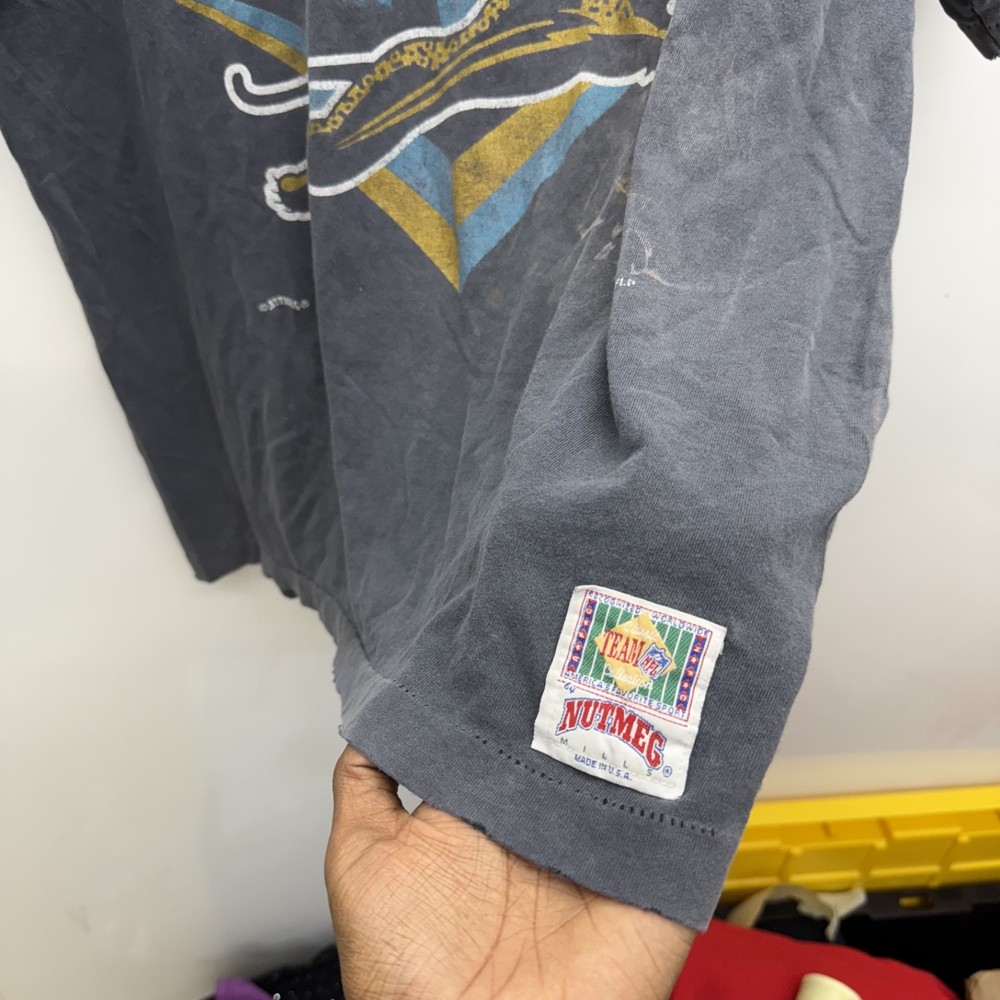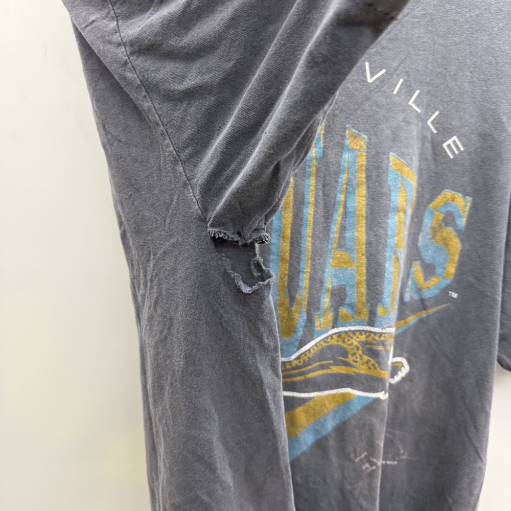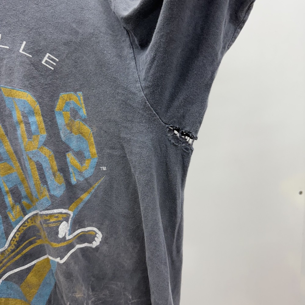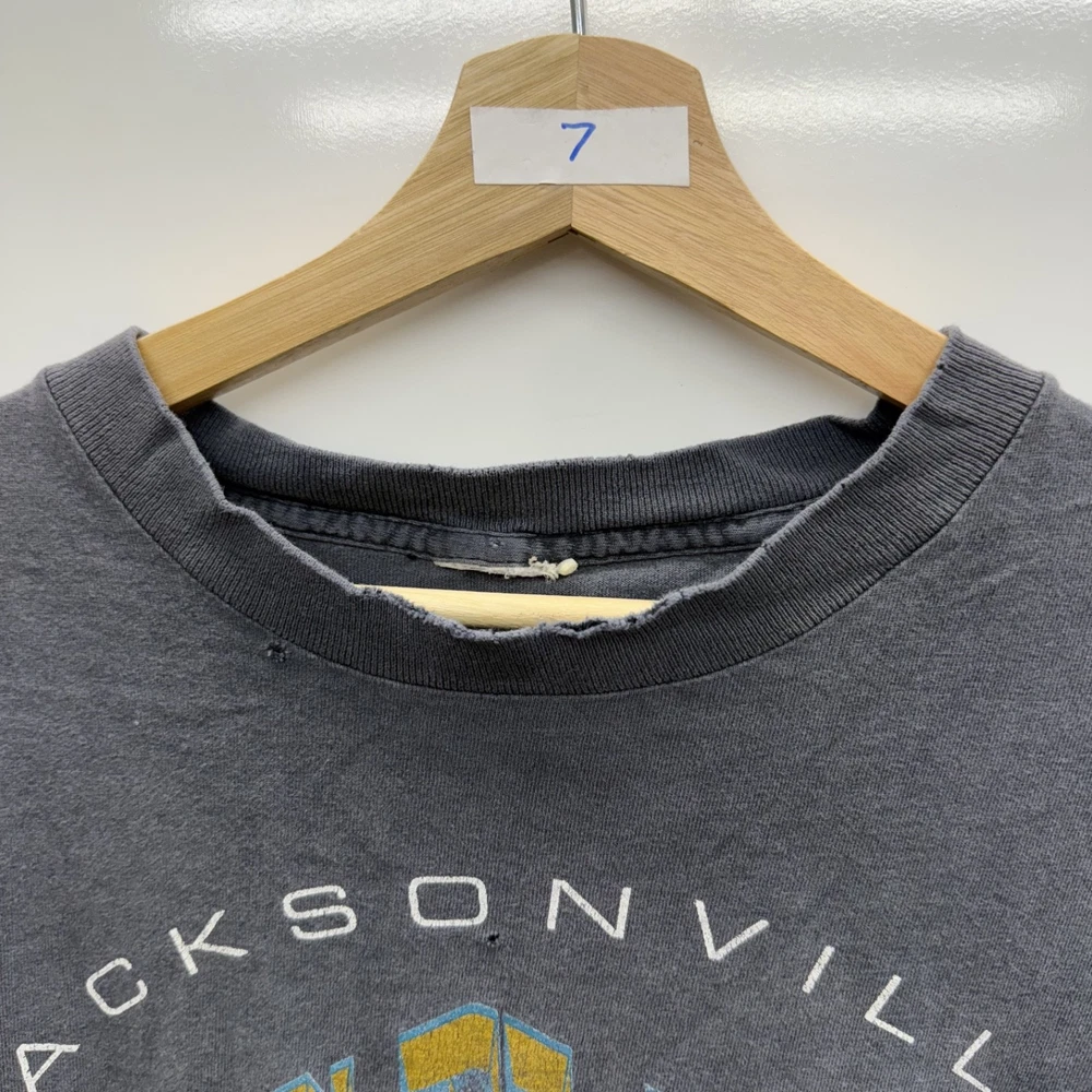 A lot of Holes Shown All Around This T Shirt! Beautiful Fade And Distressing 90s Single Stitch Banned logo Nutmeg Measurements: in photos
