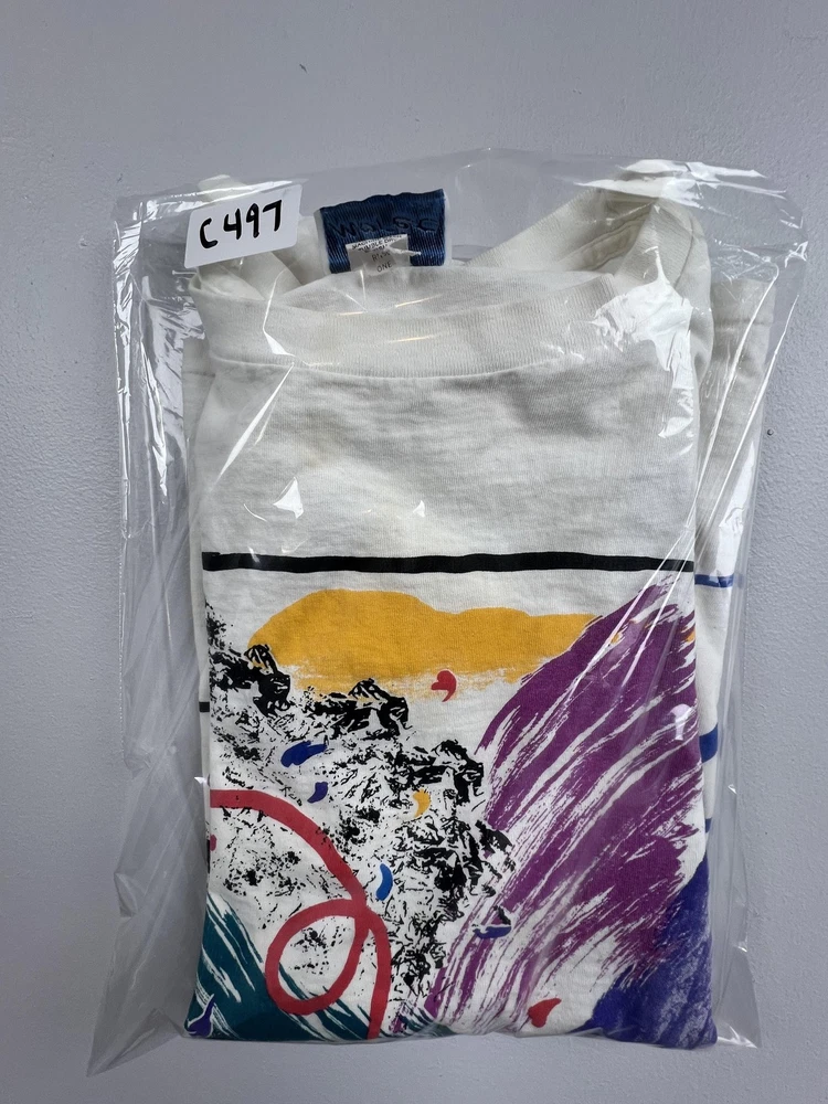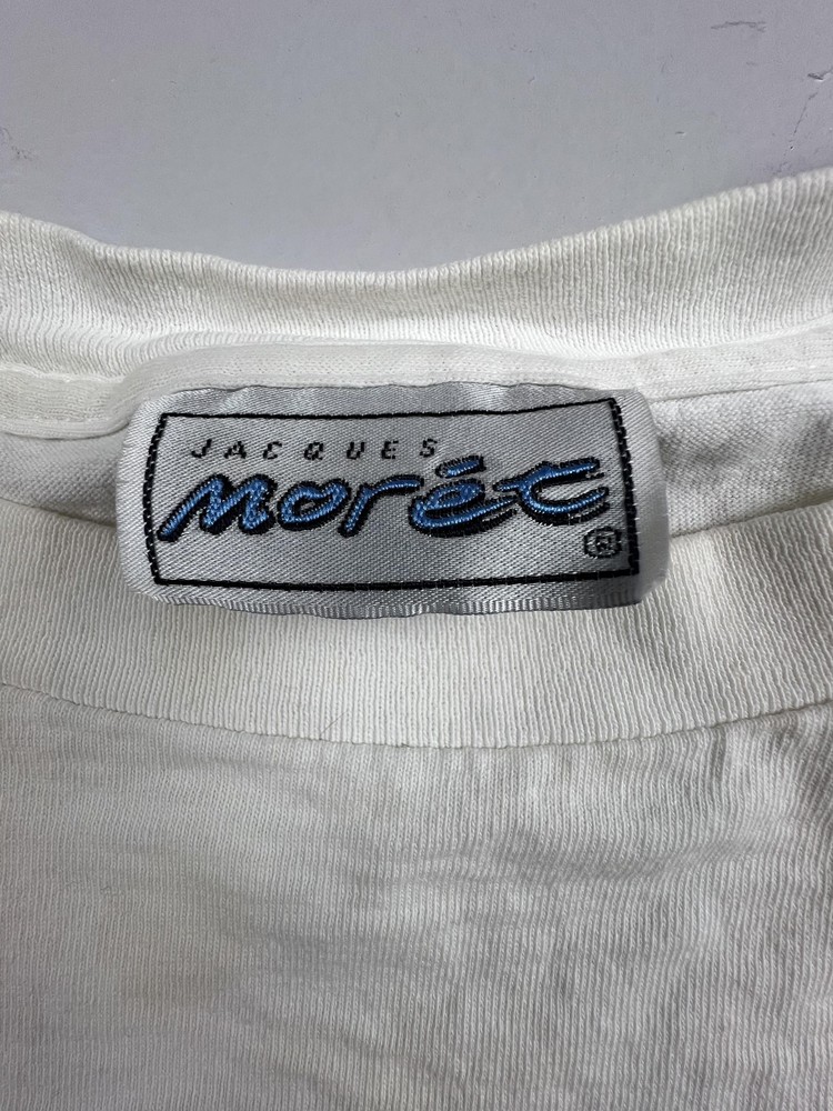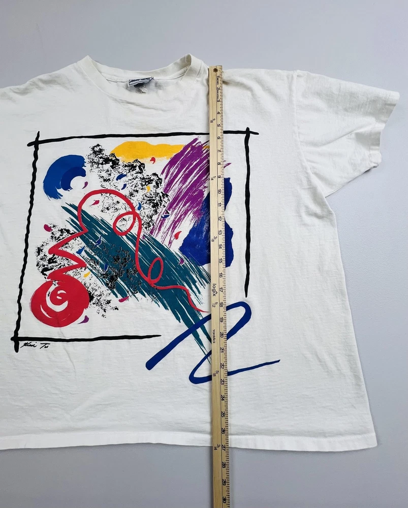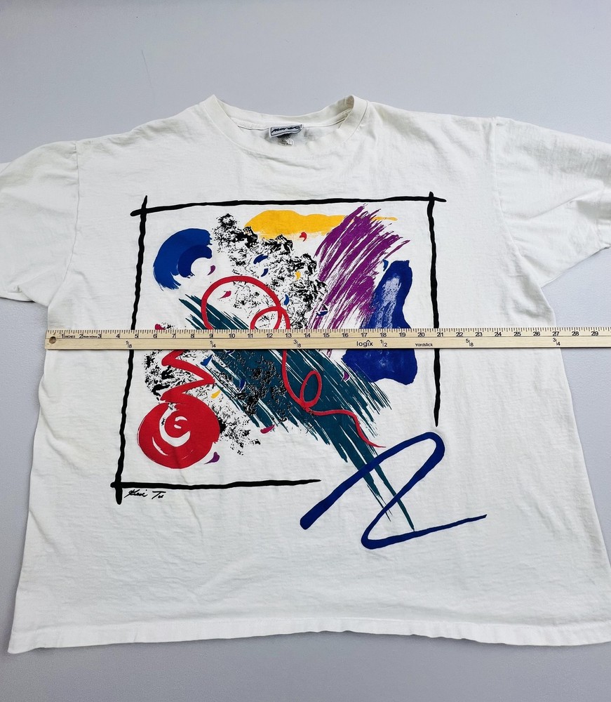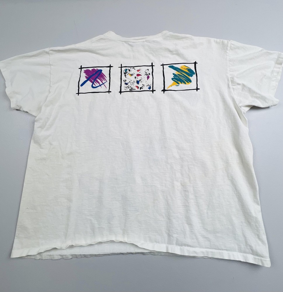 Tag size says one size, please refer to flat measurements in photos for sizing. Brand: Jacques Moret, as indicated by the woven interior neck label with the Jacques Moret name and stylized logo. Item: Mens short sleeve graphic T-shirt with large front artwork and smaller coordinating graphics across the upper back. Department and size: One size Color and pattern: Off-white base color with multicolor abstract brushstroke artwork in red, blue, teal, purple, yellow, and black framed within hand-drawn style black borders on the front, plus three smaller framed abstract designs on the back. Material and fabric: Soft preshrunk cotton jersey knit fabric designed for breathable comfort and everyday wear. Country of manufacture: Made in USA, based on the origin information provided on the interior care label. Design details: Classic crew neckline with ribbed collar, short sleeves, and straight hem, featuring a painterly front composition with splatter effects, sweeping brushstrokes, and a small script-style artist signature at the lower front graphic. Back graphic: Upper back features three small framed abstract square motifs that coordinate with the front design, giving the shirt a double-sided graphic presentation. Branding and logos: Woven Jacques Moret neck label at the interior collar along with interior care tags providing fiber content and care instructions. Fit and style: Regular fit T-shirt intended to sit comfortably at the hip with a slightly relaxed vintage silhouette suitable for casual outfits. Use and styling: Ideal for pairing with jeans, shorts, or casual pants for everyday wear, and particularly suited for those who appreciate bold abstract art and retro graphic styles. Season and weight: Lightweight cotton construction appropriate for warm-weather wear and versatile layering in all seasons. Product identifiers: Interior care label notes preshrunk 100 percent cotton construction along with RN 53854 and standard machine wash and tumble dry care instructions. Packaging: Shirt will be stored folded in a clear plastic bag for protection during storage and shipment.