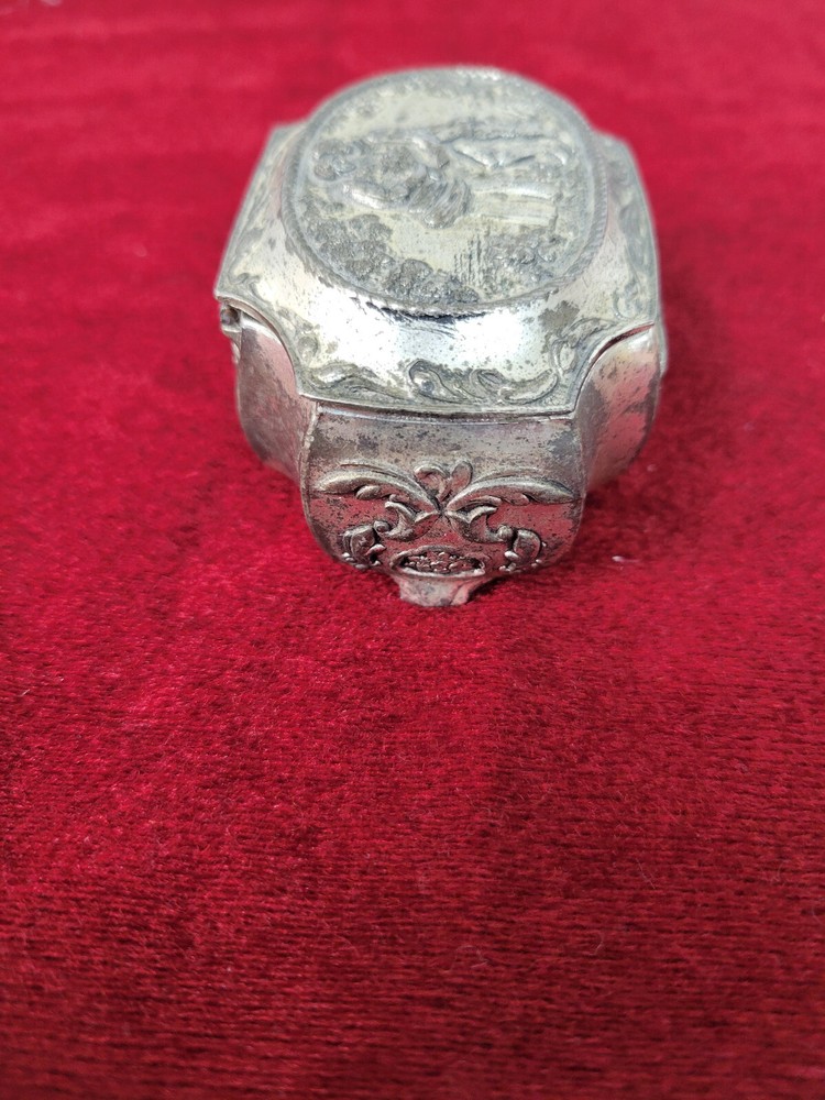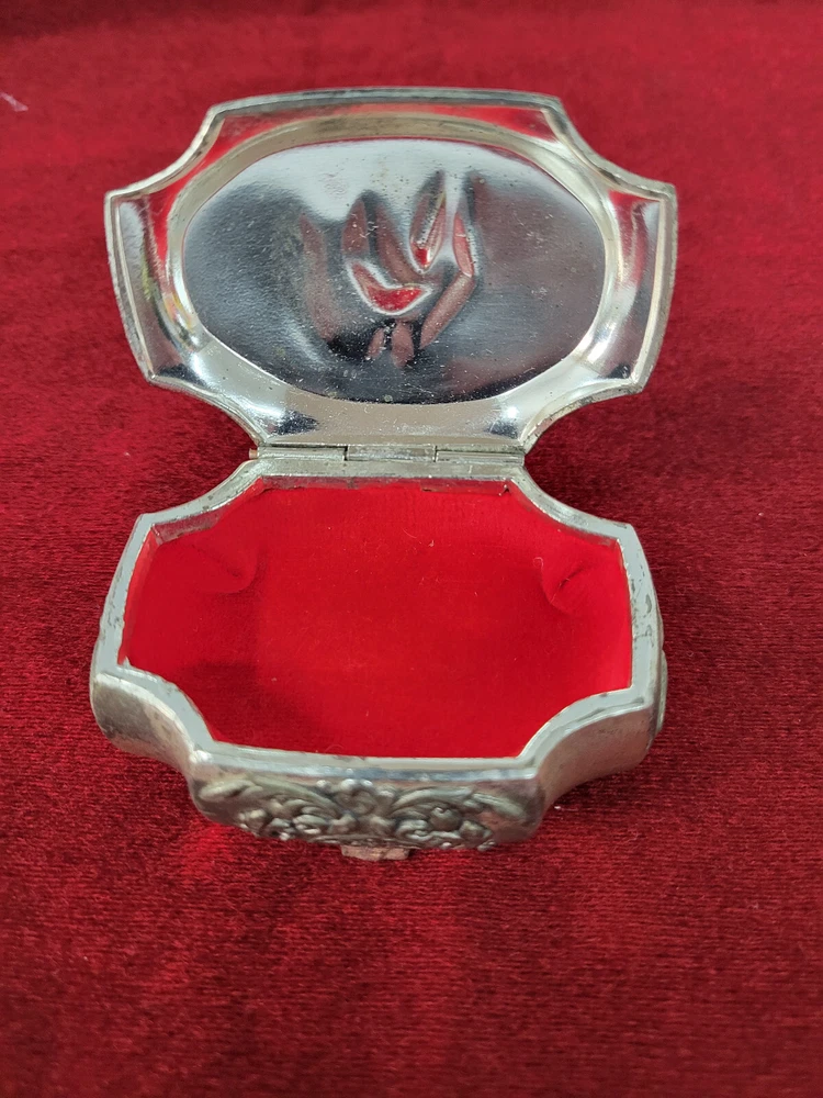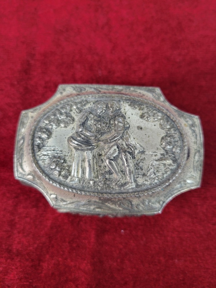 Vintage silverplate (?) trinket box with red velvet interior. Victorian style couple on the top. Top has some wear due to age and use. Interior is in very good condition. Hinge on lid is very good. 3" wide at the widest point and 2" across. Item will ship within one business day of completed sale. I DO NOT ship media mail. All items will be securely packaged and will ship USPS Ground Advantage, Priority mail, UPS or Fedex depending on weight and size. I do offer a 30-day money back guarantee on almost every item I sell. If there are issues with your item, please return it for a refund. Refund will be issued upon return of item. Some restrictions may apply. It is always appreciated if you contact me before starting a return so that I can try and assist without the hassle of a return.