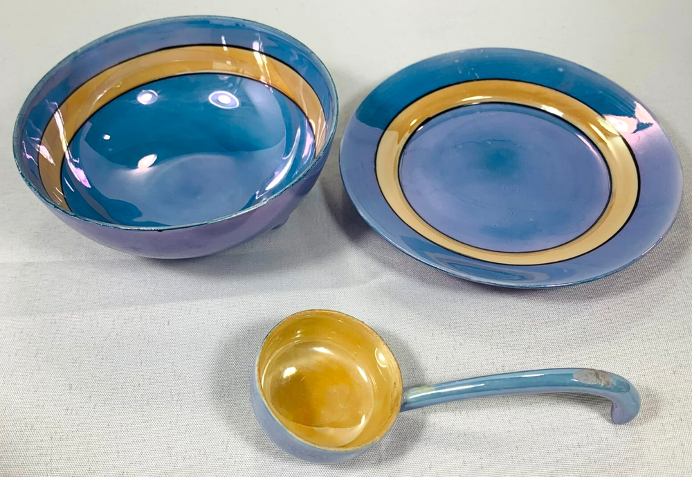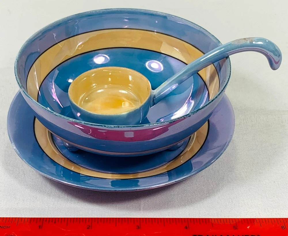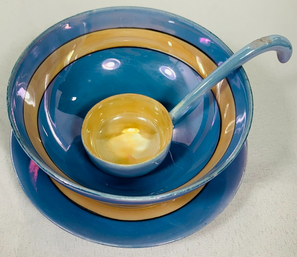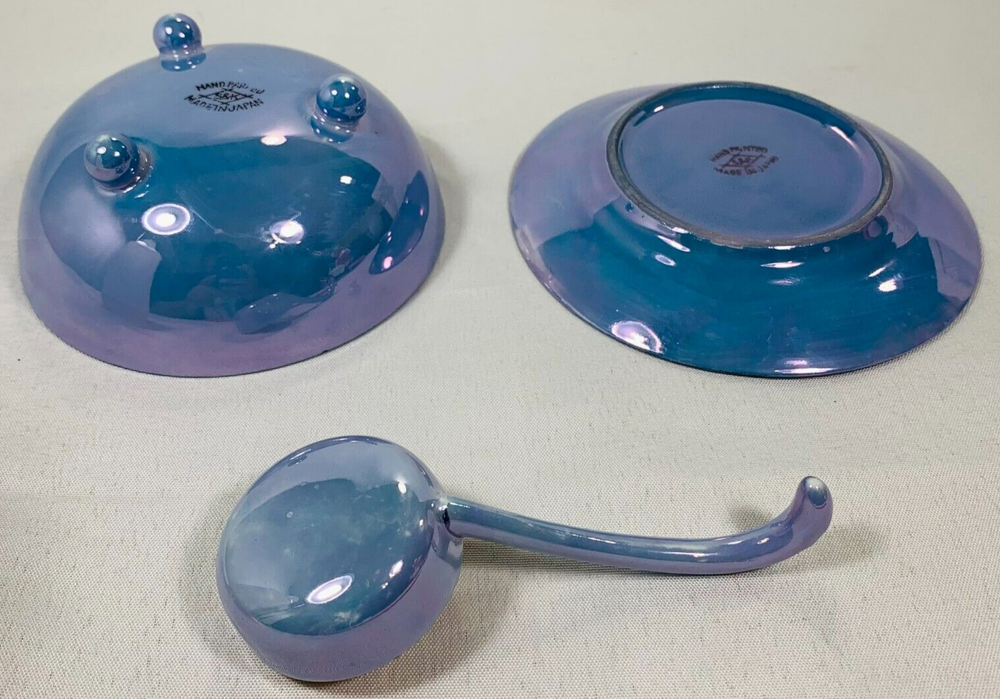 Beautiful and collectible, this vintage Japanese lusterware 3-piece set features a stunning hand-painted peach and blue finish with classic iridescent glaze. Likely part of a tea or coffee service, this charming set reflects the fine craftsmanship of mid-century Japanese porcelain. Origin: Japan (marked on base) Type: 3-piece set Material: Porcelain / ceramic with luster glaze Colors: Peach, blue, with iridescent sheen Style: Hand-painted floral or scenic design Condition: Good vintage condition; spoon has chips or cracks Era: Likely mid-20th century A lovely addition to any vintage lusterware , Japanese porcelain , or cottagecore-inspired display . Please refer to the pictures for a detailed view of the item's condition. We encourage you to carefully inspect them, as they provide the most accurate representation of what you will receive. If you have any questions, feel free to reach out! We're happy to assist!!! We are a smoke-free & pet-free home! đź’™Retro and Beyond