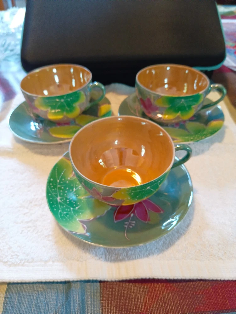 This is a beautiful vintage Japanese tea set that features intricate moriage lusterware details. The set includes a teapot, creamer, and six cups and saucers, all of which are handcrafted and showcase the rich Japanese culture. The provenance of this set is not available, but it is clear that it was made in Japan and carries with it a long history. The attention to detail in the design of this tea set is impressive, with each piece featuring unique floral and cultural symbols. This set would make a great addition to any collection of Asian collectibles, and it is sure to impress anyone who sees it. Whether you are a tea lover or simply someone who appreciates beautiful and unique pieces, this Japanese tea set is a must-have.