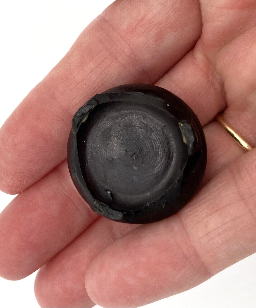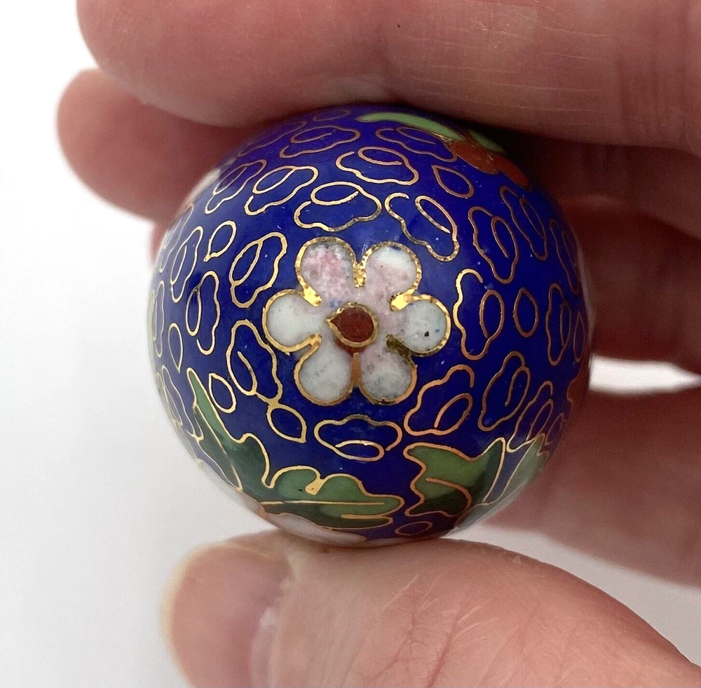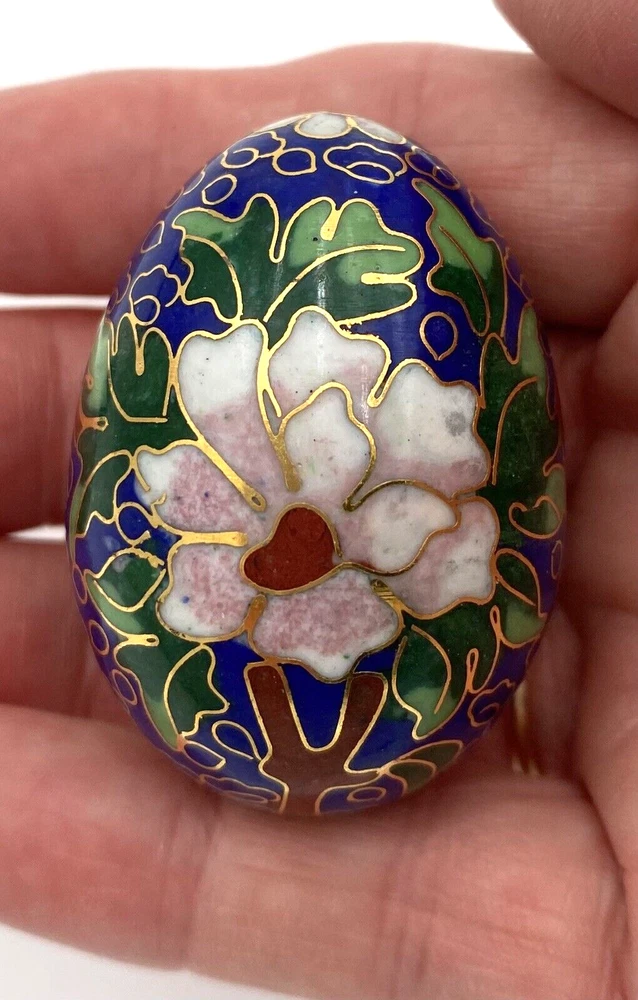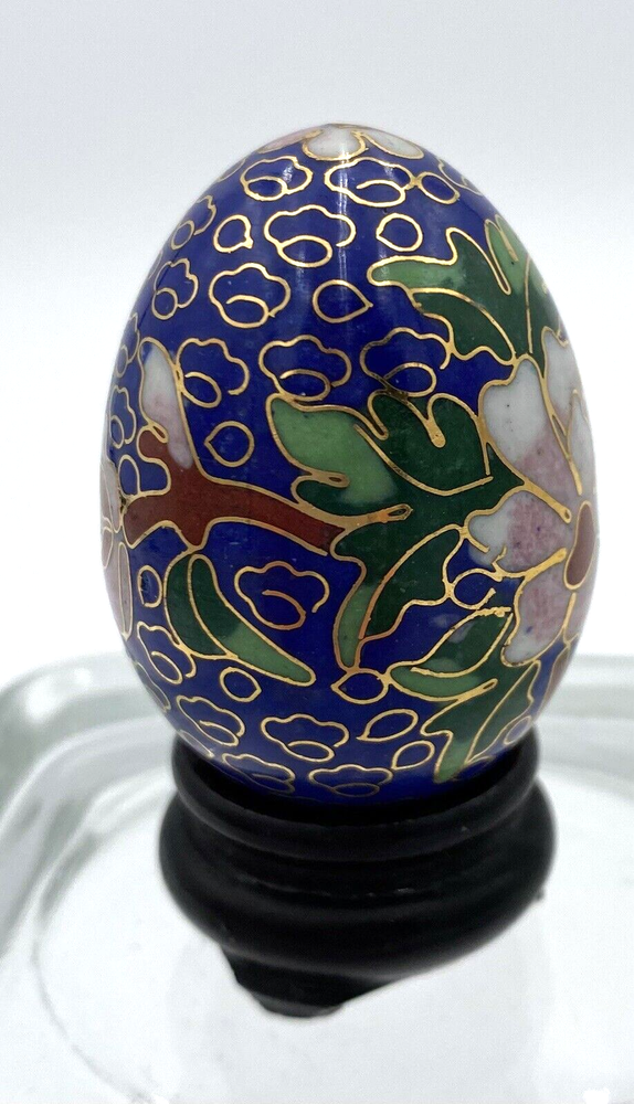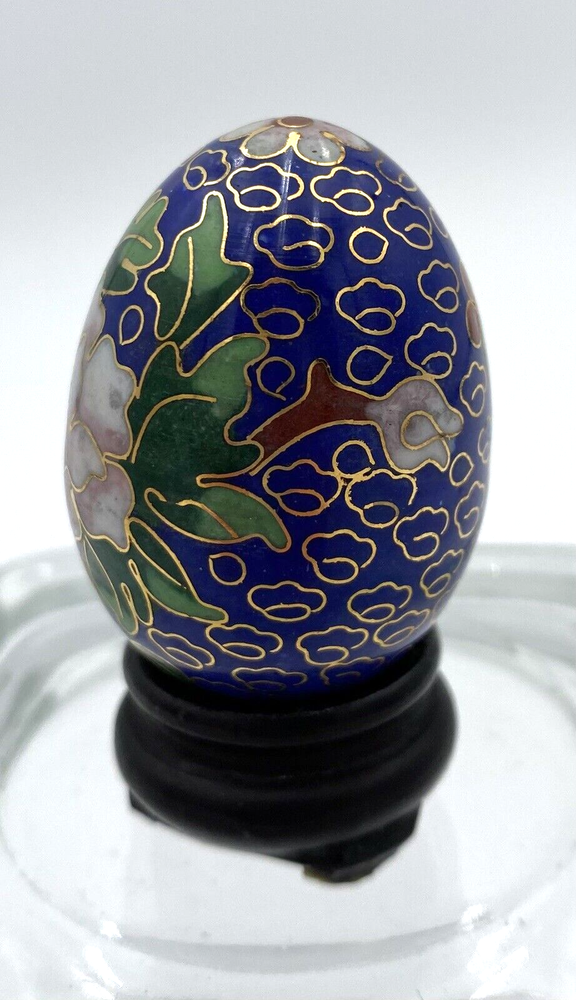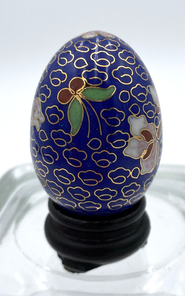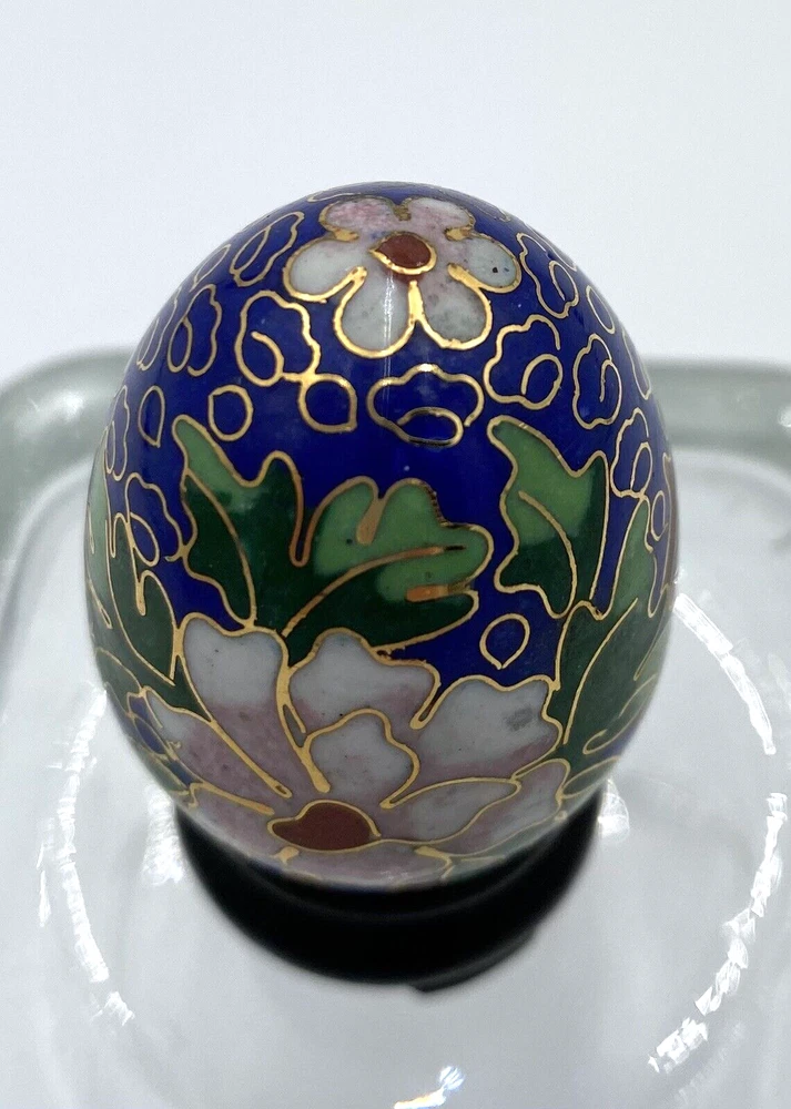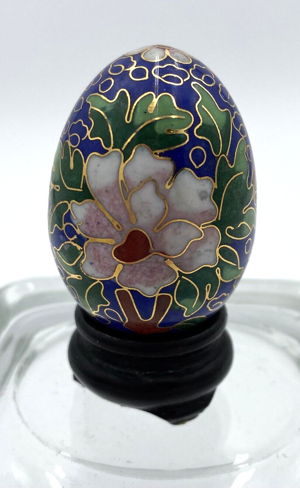 This vintage Japanese porcelain egg is a beautiful addition to any collection. The egg is hand-painted with delicate pink lotus flowers and green leaves against a navy background, all surrounded by, and highlighted with, gold gilt. The petite egg stands at 1.75 inches tall and measures 1.5 inches in width. The egg comes with a wooden three-footed stand, adding to its charm and ease of display. Its weight is 1.1 ounces with the stand, making it easy to move and display in any room of your home. This is a beautiful egg in excellent condition. There are no chips, cracks or signs of wear.