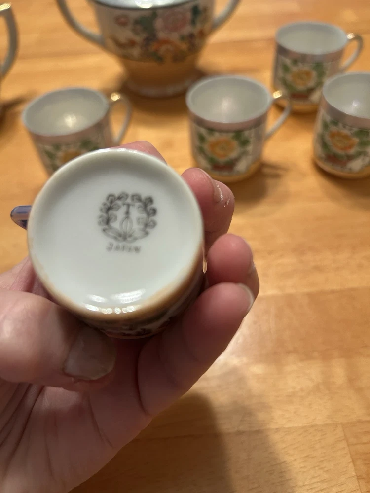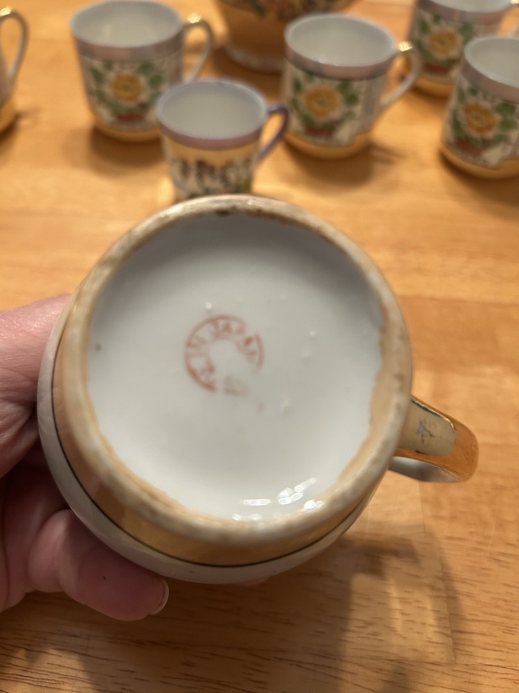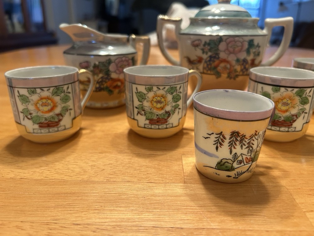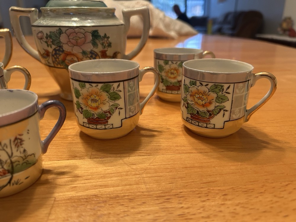 Vintage Japanese Tea Set that includes a creamer and what looks to be a larger pot with a lid for either tea or sugar. The set comes with 5 small cups that are 2 1/2 inches tall and wide and 1 smaller cup that looks to be part of another set. This belonged to my grandmother and I don’t know much more about it. They have been packed away for a number of years and all pieces are intact with no cracks or repairs.