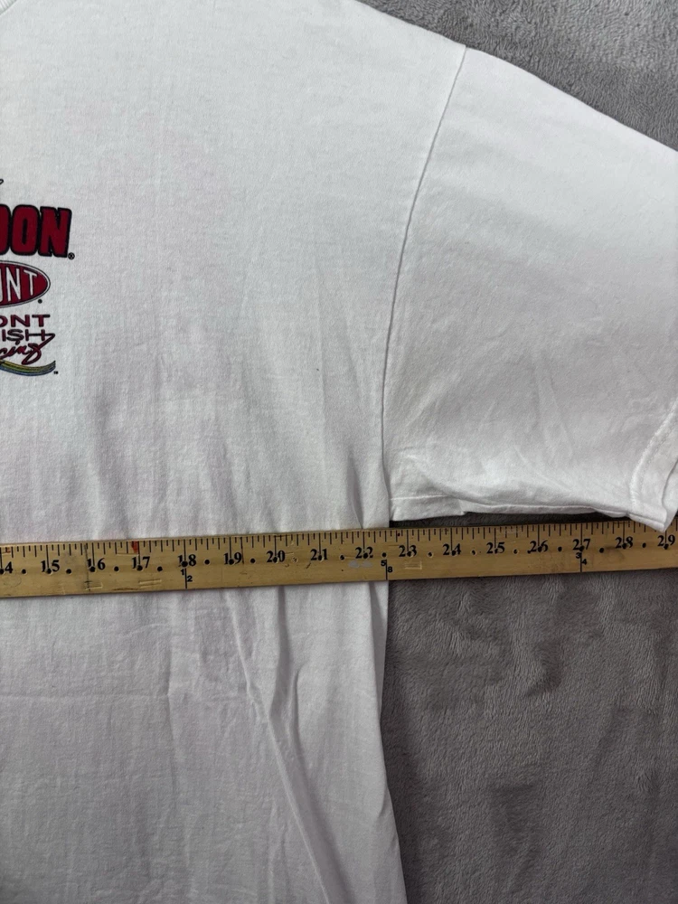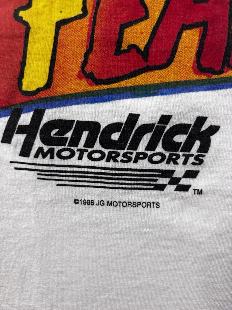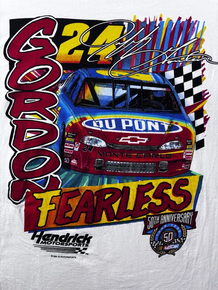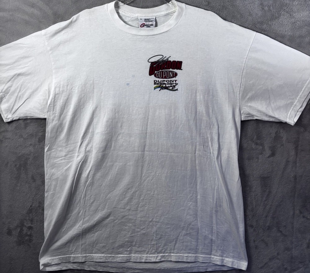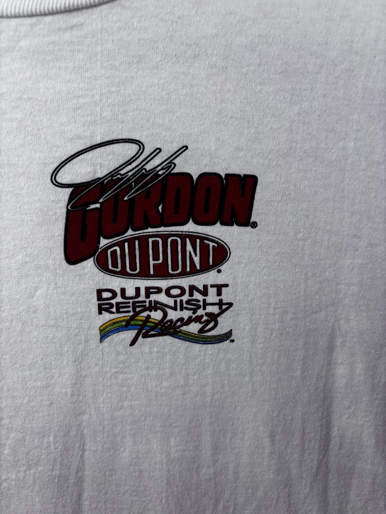 Vintage Jeff Gordon NASCAR DuPont Racing T-Shirt 1998 XL This authentic vintage NASCAR tee features legendary driver Jeff Gordon with the iconic #24 DuPont Chevrolet from NASCAR. Dated 1998 for NASCAR’s 50th Anniversary, this piece showcases a bold, colorful front graphic along with a chest hit logo—perfect for collectors and racing fans. Description: Classic late-90s racing tee on a Competitors View tag. Features vibrant DuPont branding, Hendrick Motorsports detail, and signature Jeff Gordon styling. A great addition to any vintage NASCAR collection or everyday wear piece. Features: - Official Jeff Gordon NASCAR graphic - Large front graphic + chest logo hit - 1998 NASCAR 50th Anniversary design - Competitors View tag - Classic 90s motorsports style Condition: Good pre-owned vintage condition. Shows light wear consistent with age. Minor blue mark on front as shown in photos. Measurements: Please compare with your favorite garment for best fit. PLEASE NOTE: TAGGED XL BUT MAY FIT DIFFERENT DUE TO VINTAGE SIZING. PLEASE REVIEW MEASUREMENTS CAREFULLY. Please Note: Colors may vary slightly due to lighting. Customer Satisfaction: We ship fast and package with care. Authenticity: We carefully inspect all branded items and only sell genuine merchandise. Shipping: Fast shipping with tracking uploaded promptly.