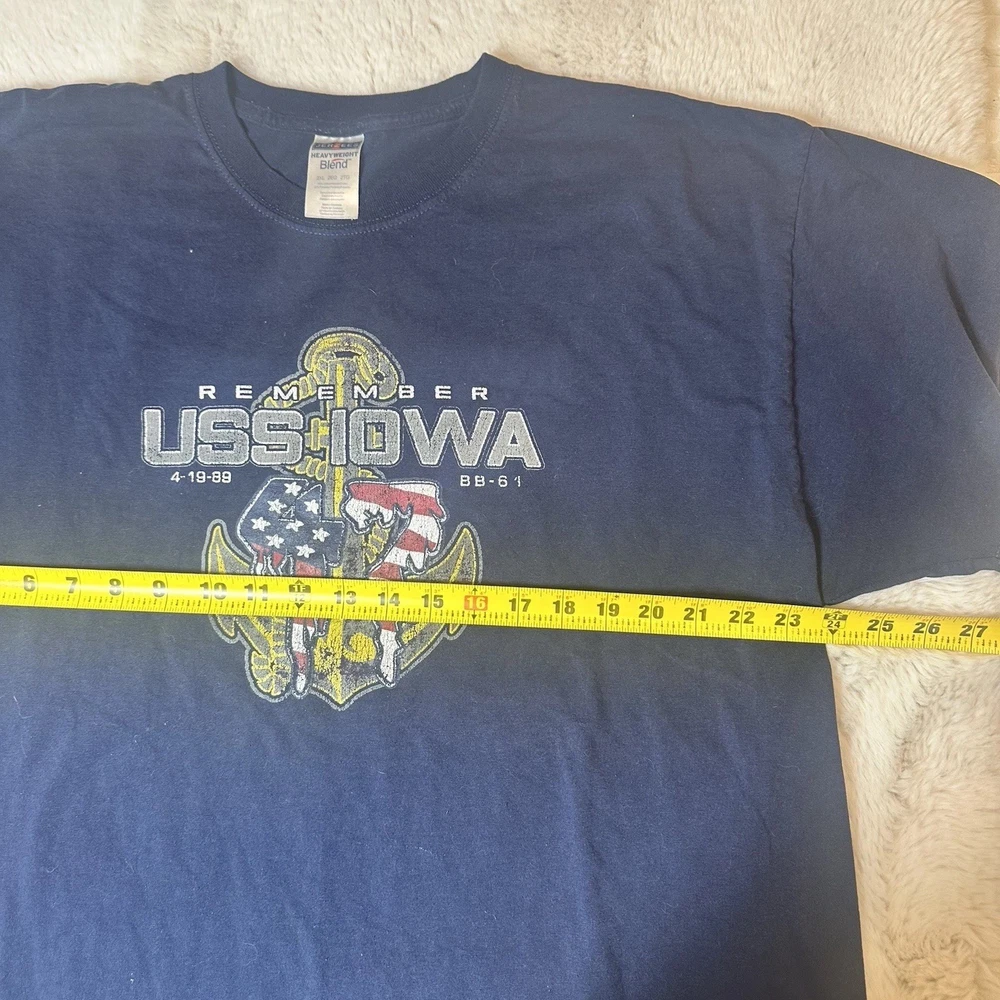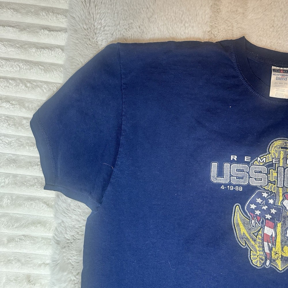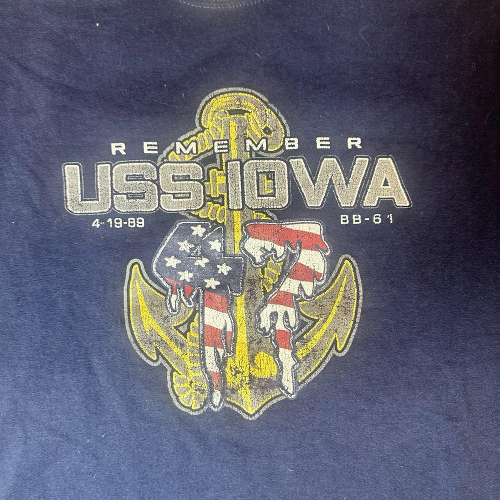 Vintage Jerzees USS Iowa (BB-61) memorial graphic T-shirt dated April 19, 1989 Size 2XL Size 2 XL Material Cotton Polyester Color Blue Condition Good Condition small stain of paint at the front bottom by the hip, check pictures Ref: 1639